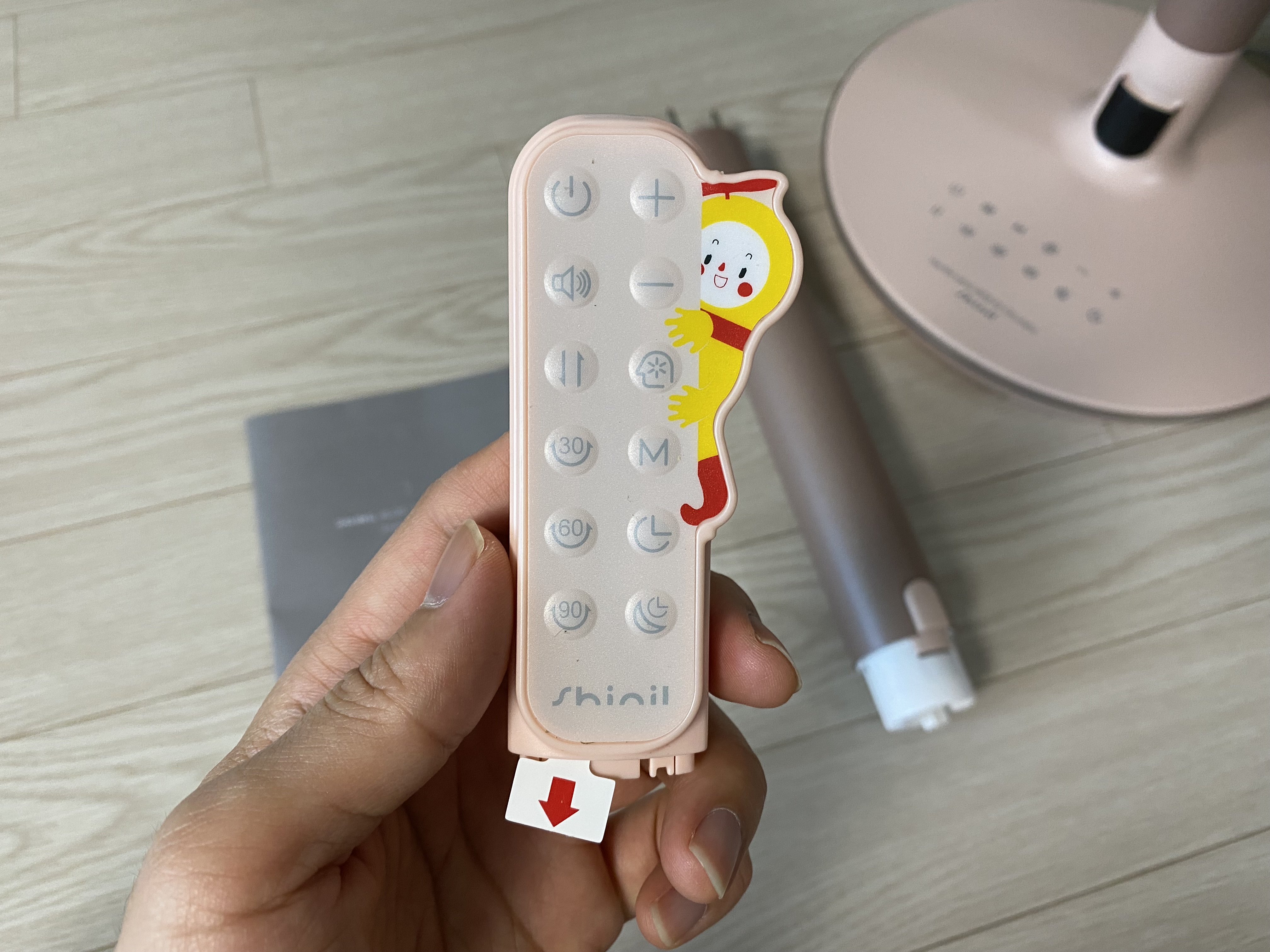 리모컨이 무지 귀엽게 생겼네요. 선풍기 본체 버튼으로 할 수 있는 일을 이 리모컨으로도 전부 할 수 있습니다. 배터리가 들어있어서 밑에 있는 화살표 종이를 제거하면 리모컨을 바로 사용할 수 있습니다.