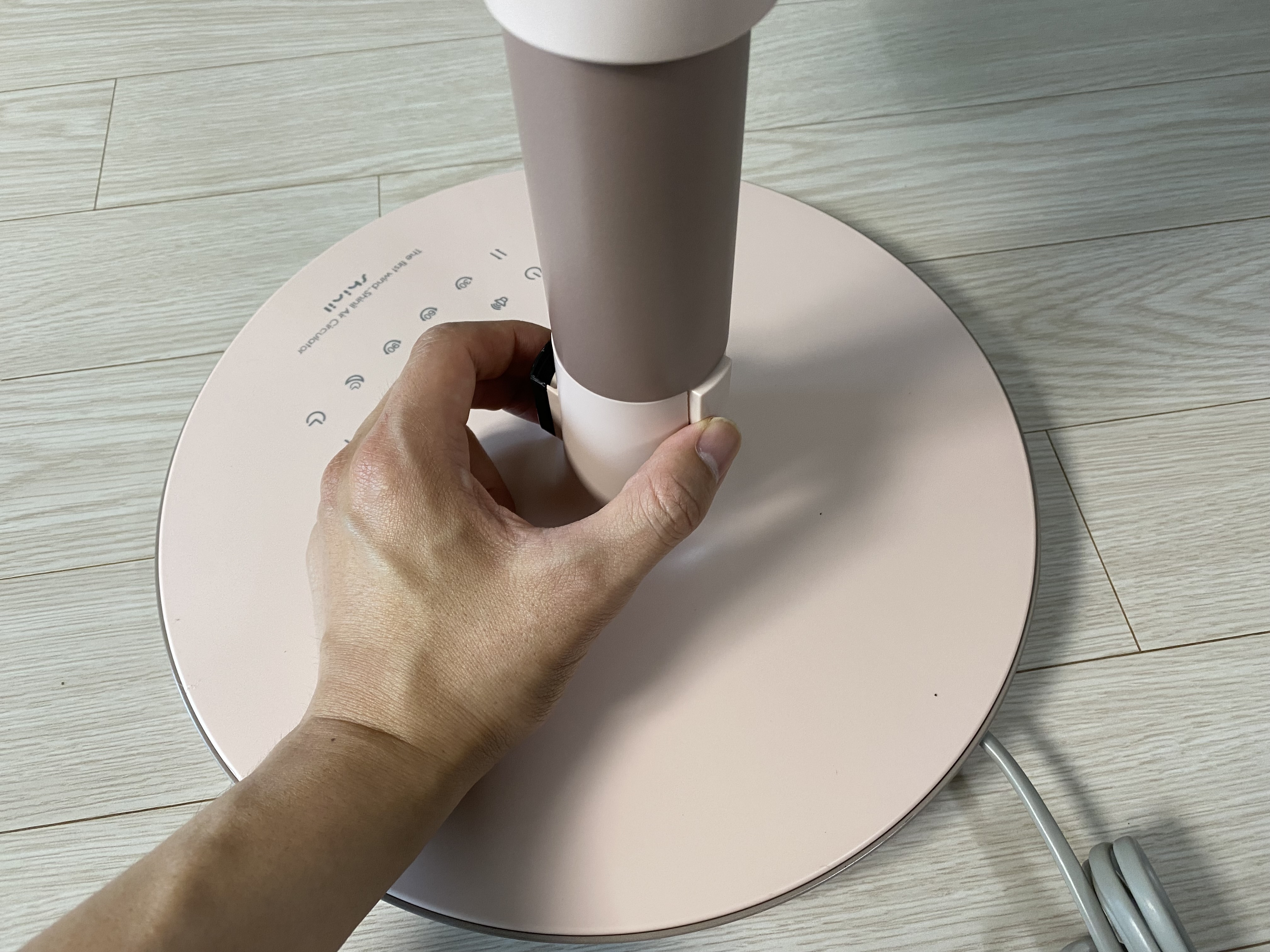 선풍기 목 하단에 있는 뒤쪽 버튼을 누르면 선풍기를 분리할 수 있습니다.