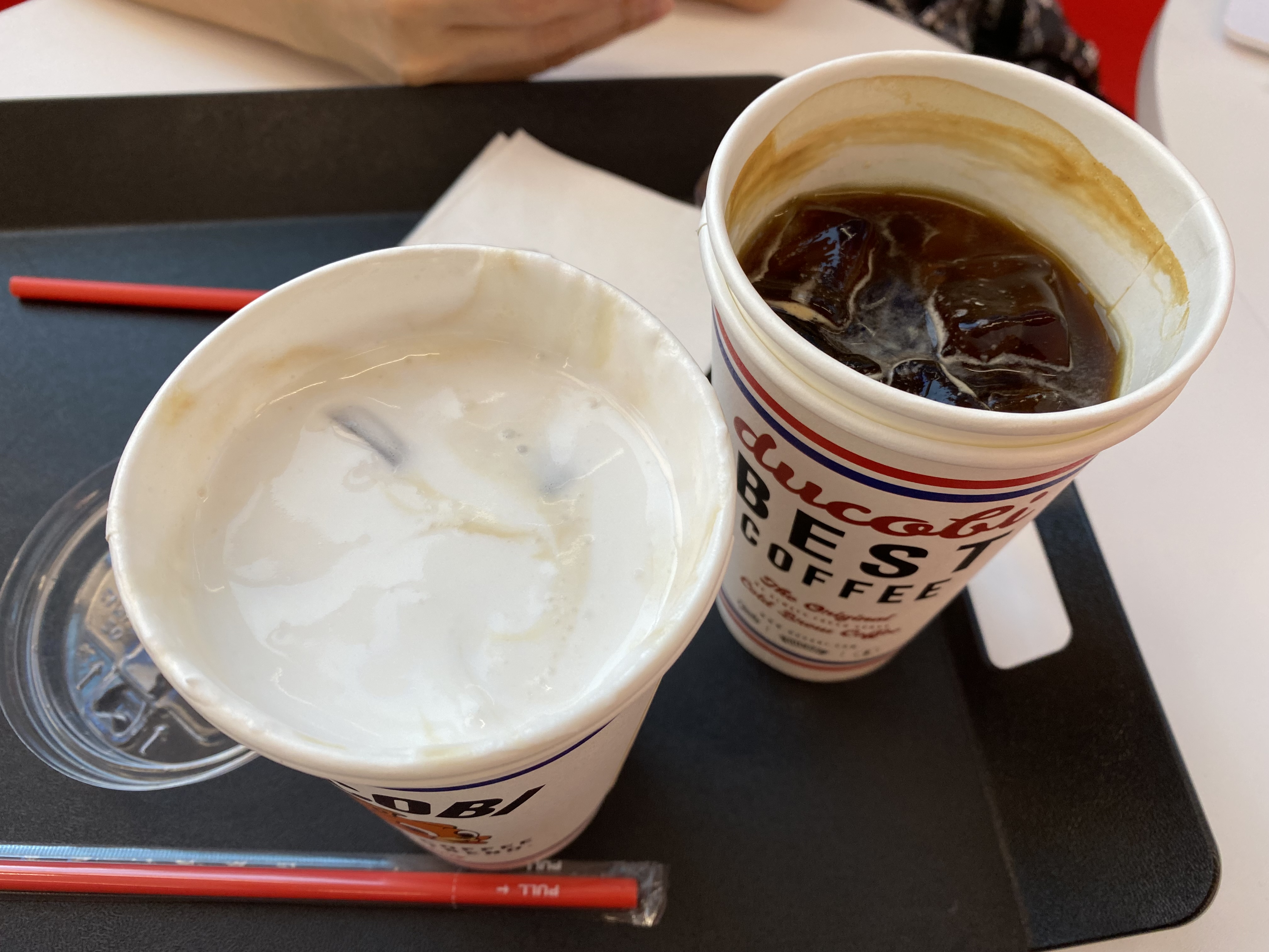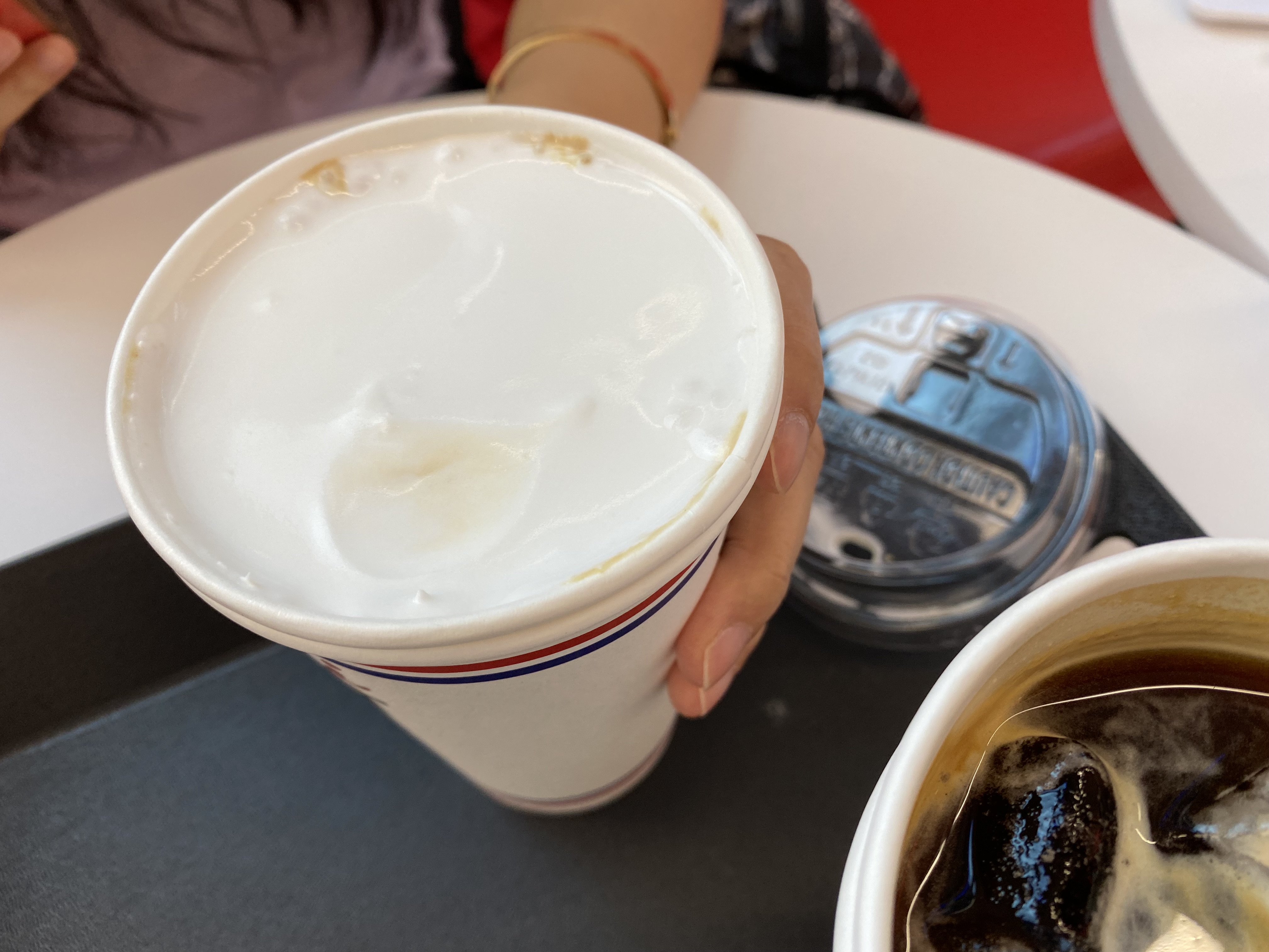 외부 종이컵을 제거하니 커피 양이 다른 것을 볼 수 있네요. 아메리카노보다 듀코비 라떼의 양이 확실히 작네요. 12oz와 16oz 차이라고 합니다.