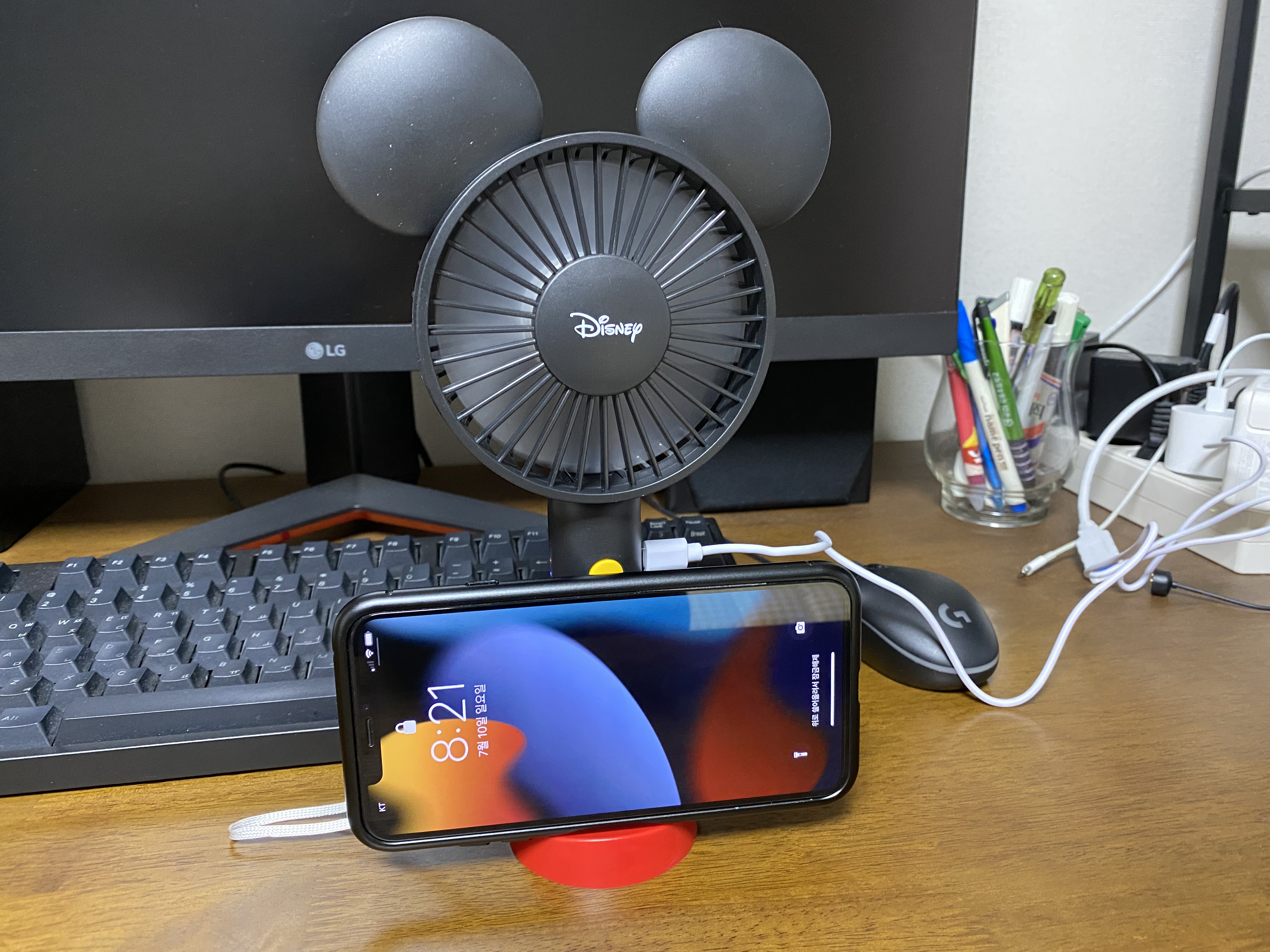 핸디선풍기를 거치대에 장착한 모습. 깜찍하네요.