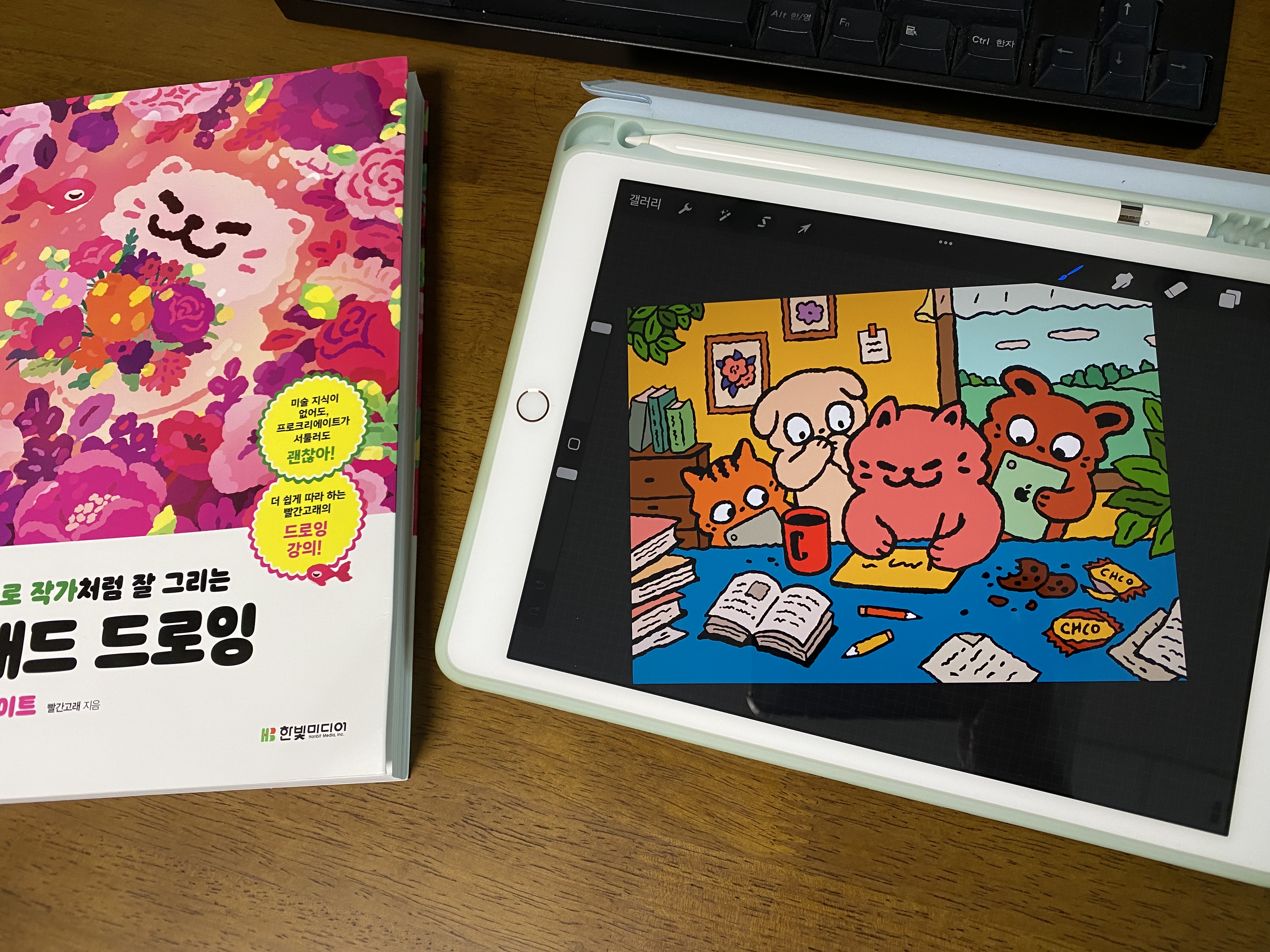 컴퓨터로 그림을 그릴 때 일러스트레이터를 사용한다면 아이패드에서는 프로크리에이트(Procreate)를 사용합니다. 저도 예전에 아이패드와 애플팬슬로 그림을 한번 그려볼까 싶어 프로크리에이트를 유료 구매한 적이 있는데 처음에 신기해서 몇 번 쓰고 지금은 거의 사용하지 않습니다. 이번에 '혼자 해도 프로 작가처럼 잘 그리는 아이패드 드로잉 with 프로크리에이트' 책을 보니 다시 한번 도전해지고 싶은 마음이 생겼습니다.