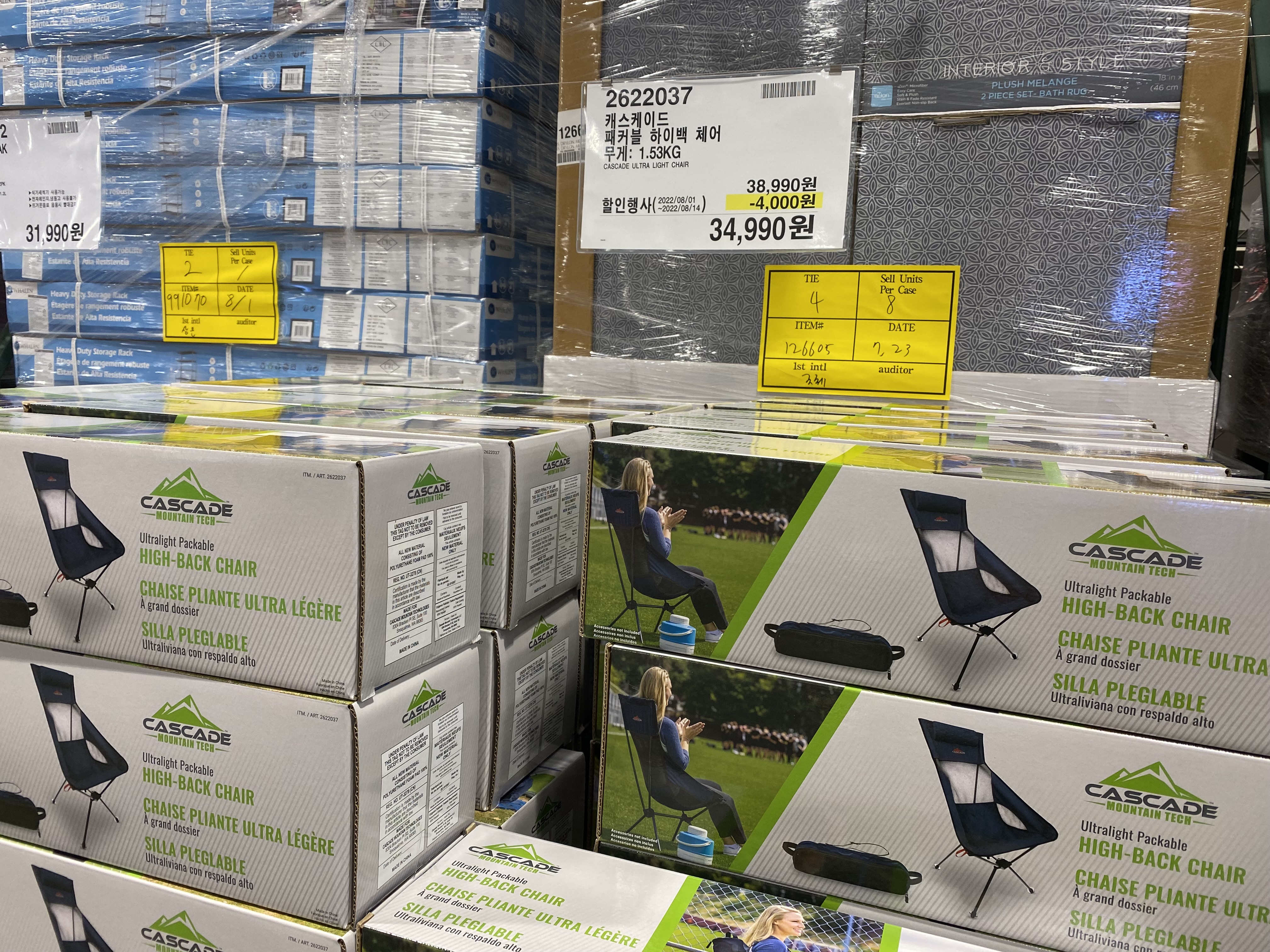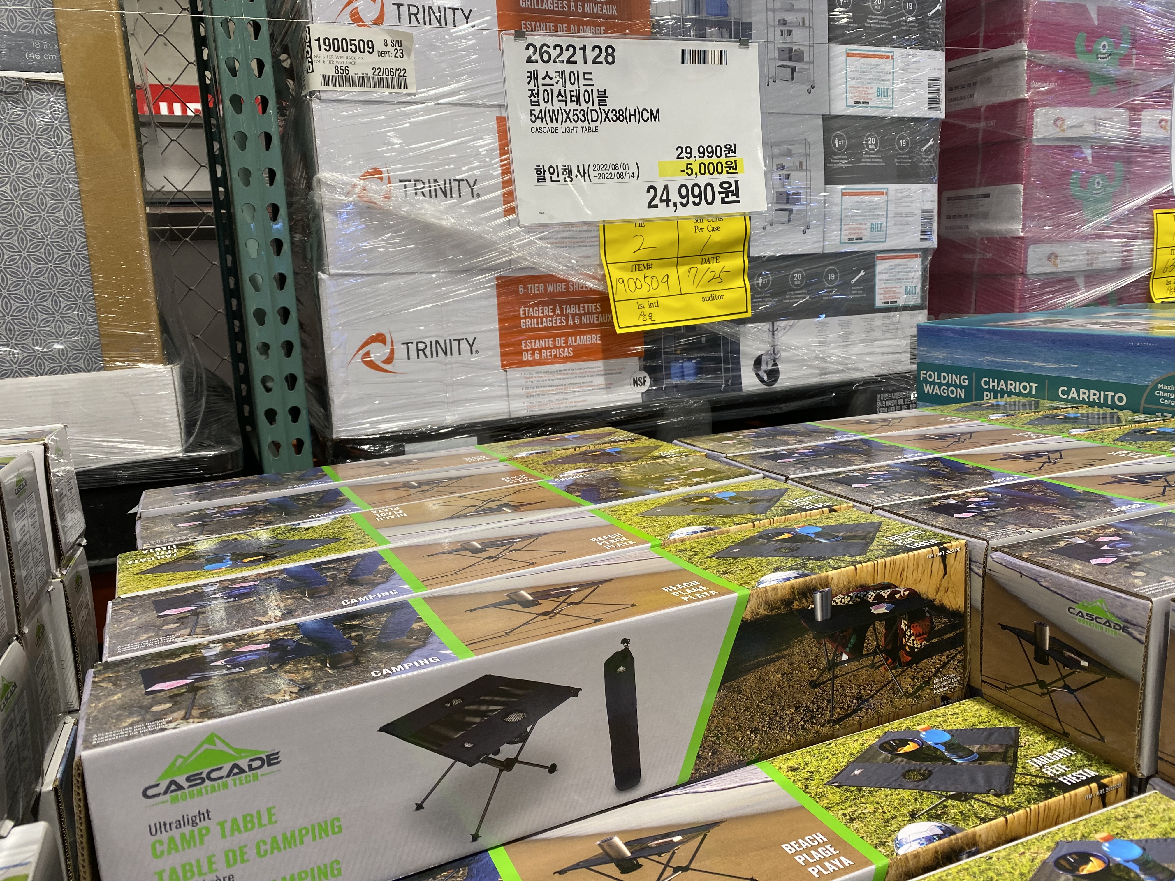 코스트코에서 캠핑용 의자와 접이식 테이블을 샀습니다. 캠핑족이 아니라 이런 제품은 그냥 넘기는 편인데 할인하고 너무 싸길래 저도 모르게 그만 카트에 담았습니다. 조만간 캠핑은 아니더라도 펜션에 놀라갈 거라 거기서 쓰면 좋을 것 같아서 구매를 했네요. 캐스케이드 패커블 하이백 체어 가격은 4000원 할인해서 34,990원.