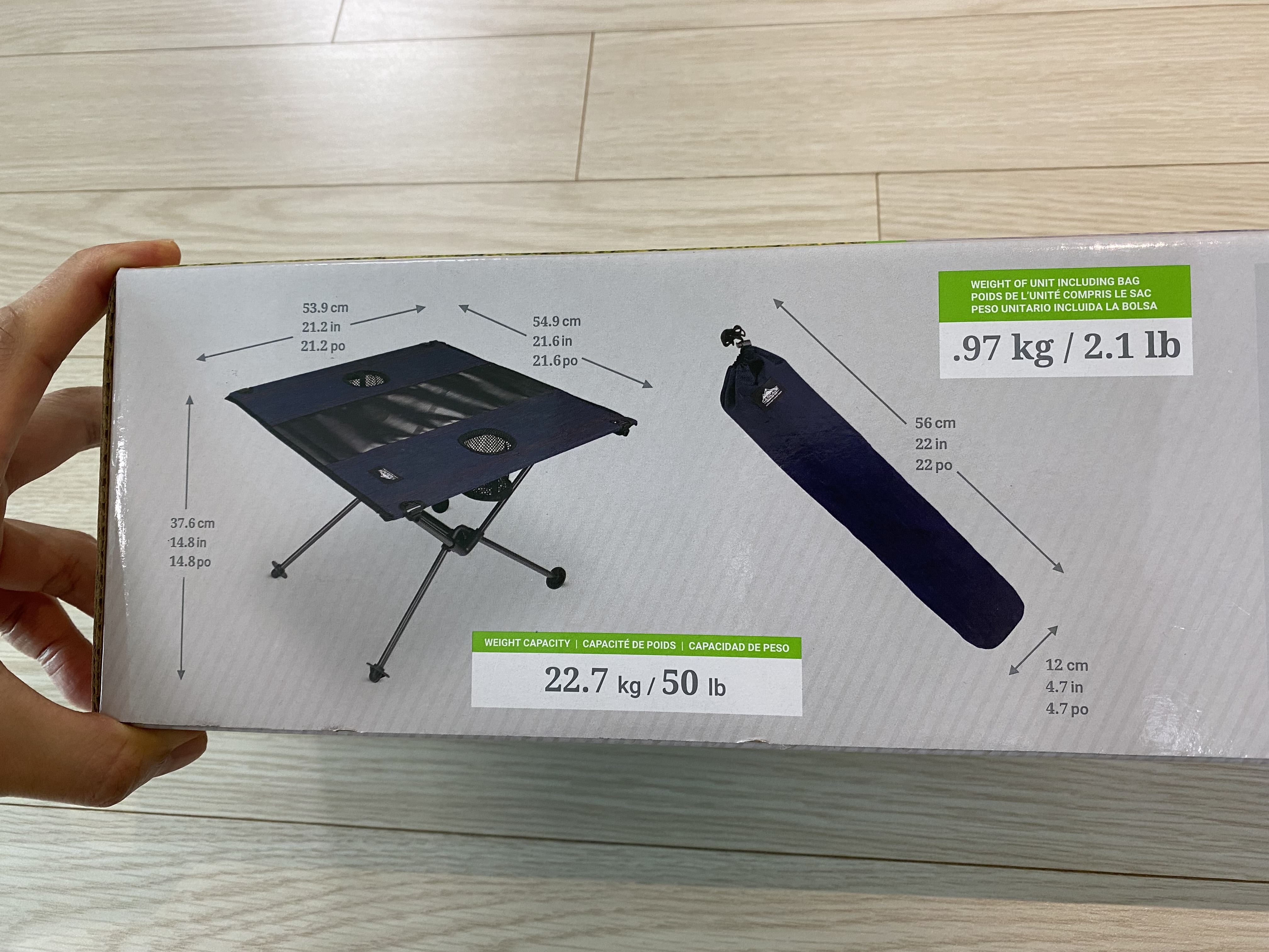 접이식 테이블은 의자보다 더 가벼운 970g입니다. 22.7kg까지 물건을 올릴 수 있다고 하네요.