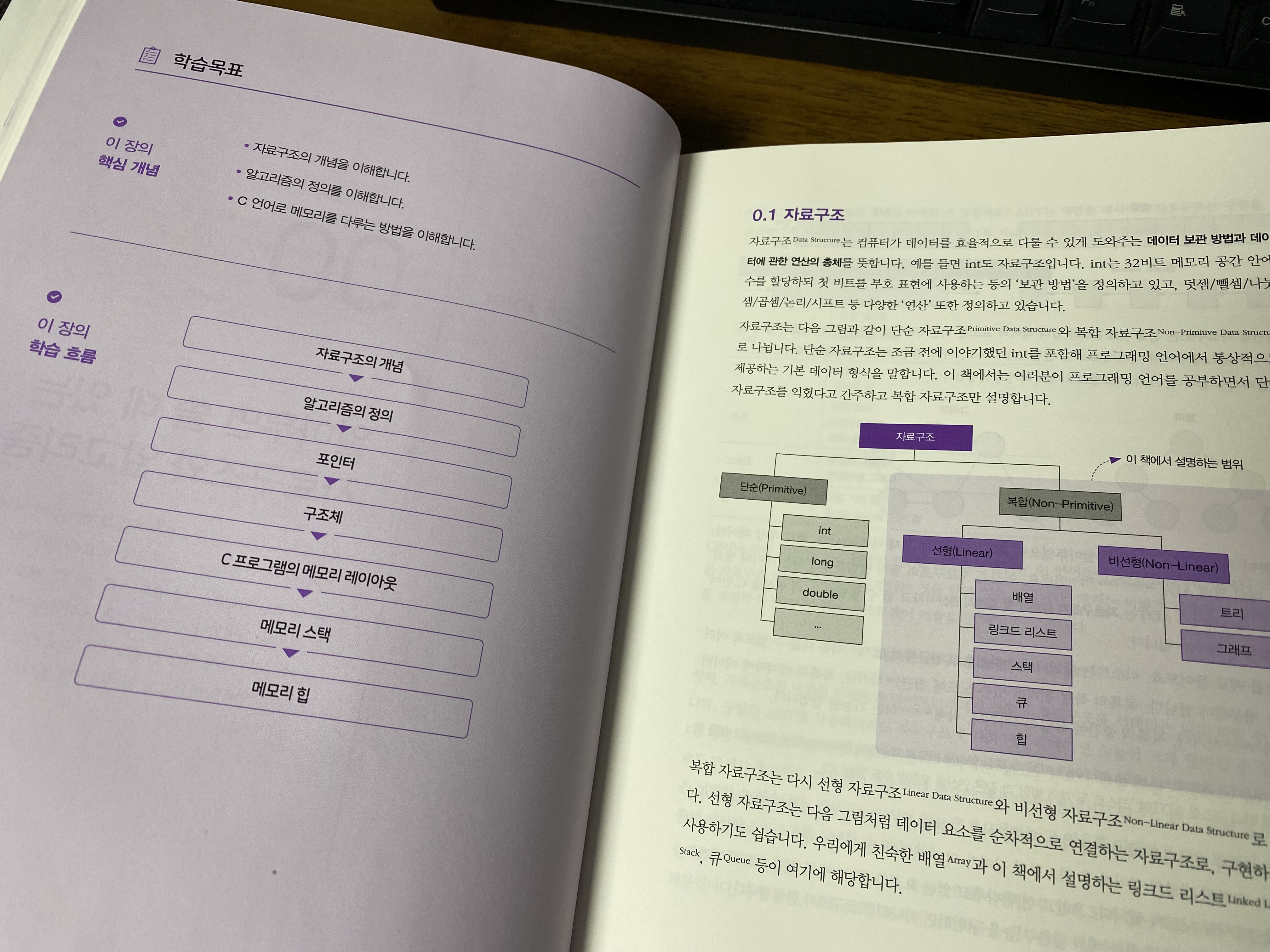 요즘 힙한 파이썬을 사용하지 않고 C언어를 사용해서 자료구조, 알고리즘을 설명합니다. 다른 건 몰라도 자료구조, 알고리즘은 (C언어의 포인터 같은 걸로) 메모리를 직접 다루면서 배우는 게 필요하기 때문에 괜찮은 선택이라 생각합니다. C언어를 잘 모르면 100% 이해하는 건 힘들지 몰라도 전반적인 내용을 이해하는 데는 큰 문제가 없다고 생각합니다. (그래도 포인터는 아는 것이 좋지요.) 여기에 나온 예제를 돌려보면서 이번 기회에 C언어도 가볍게 배워보는 것을 추천하고 싶네요. C언어를 안다는 건 이직을 할 때도 확실히 유리하다 생각합니다. 남들이 어려워하고 안 하는 걸해야 가치가 올라가지 않을까요?! 사실 저는 C언어로 코딩을 시작해서 저에게는 참으로 친근한 존재입니다.