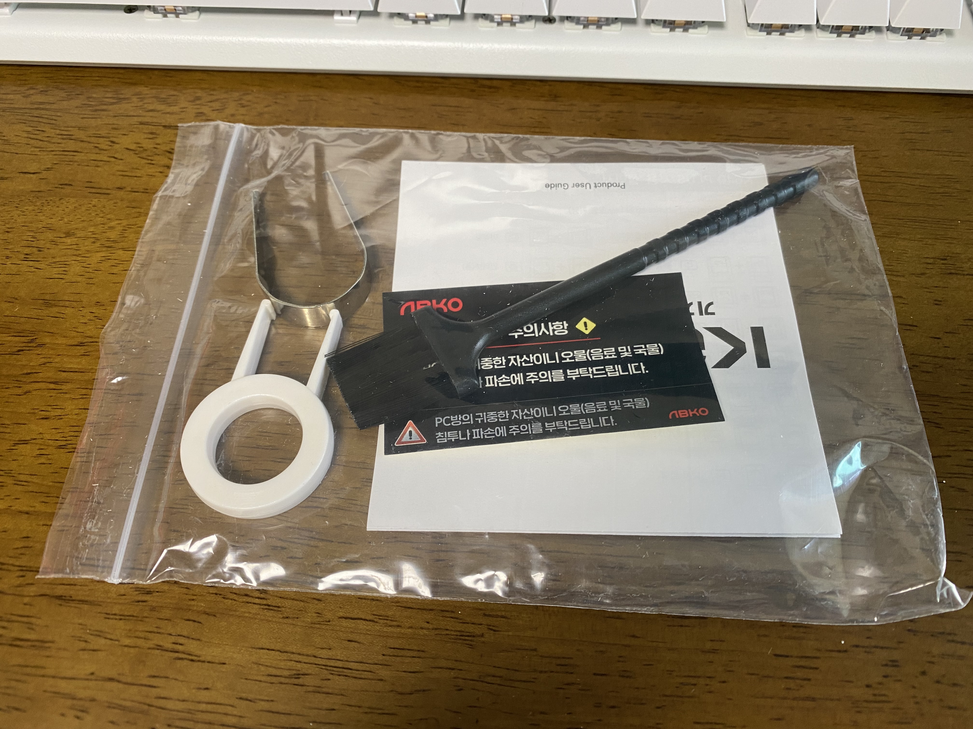 키보드, 브러쉬, 키 뽑는 도구 등이 들어있습니다.