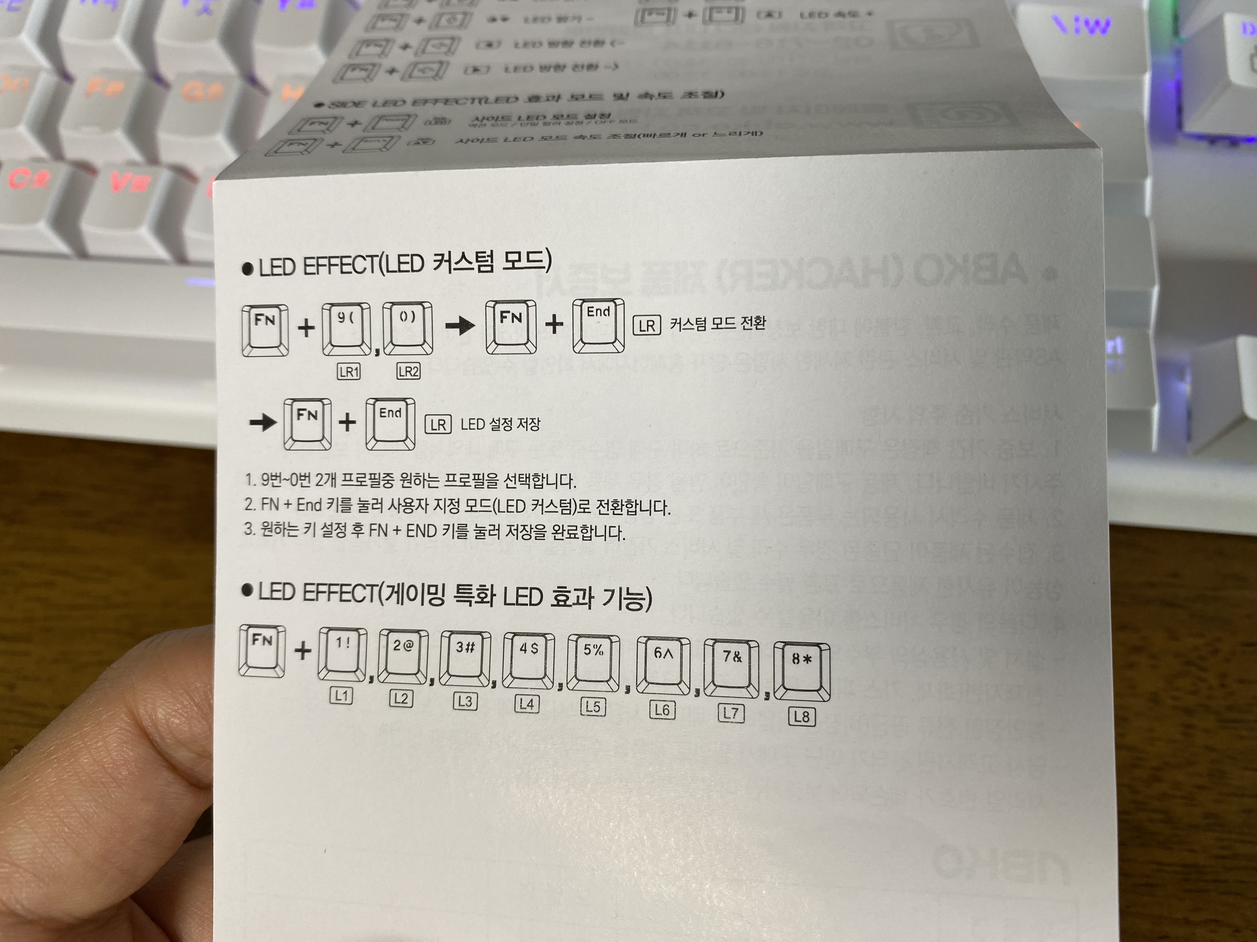 FN 키 조합이나 LED 조절하는 방법은 위 설명서를 참고하세요. 기능이 참 다양하네요. 이렇게 LED가 화려한 키보드는 첨이라 이런저런 스타일로 만드는 재미가 있었습니다.