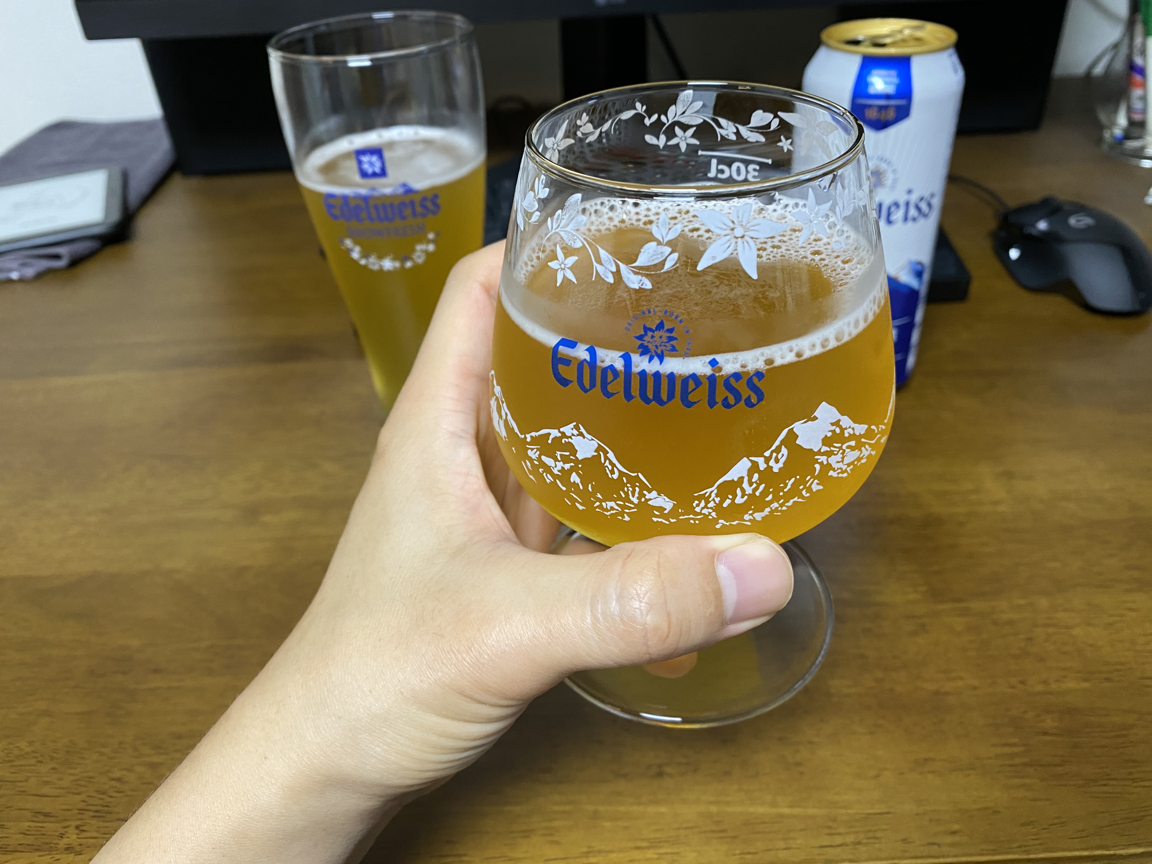 에델바이스 같은 향긋한 밀맥주는 마시기 전에 침전물을 잘 섞어야 합니다. 흔들면 탄산이 폭발하기 때문에 그냥 가볍게 위아래로 회전을 시켜 섞습니다.