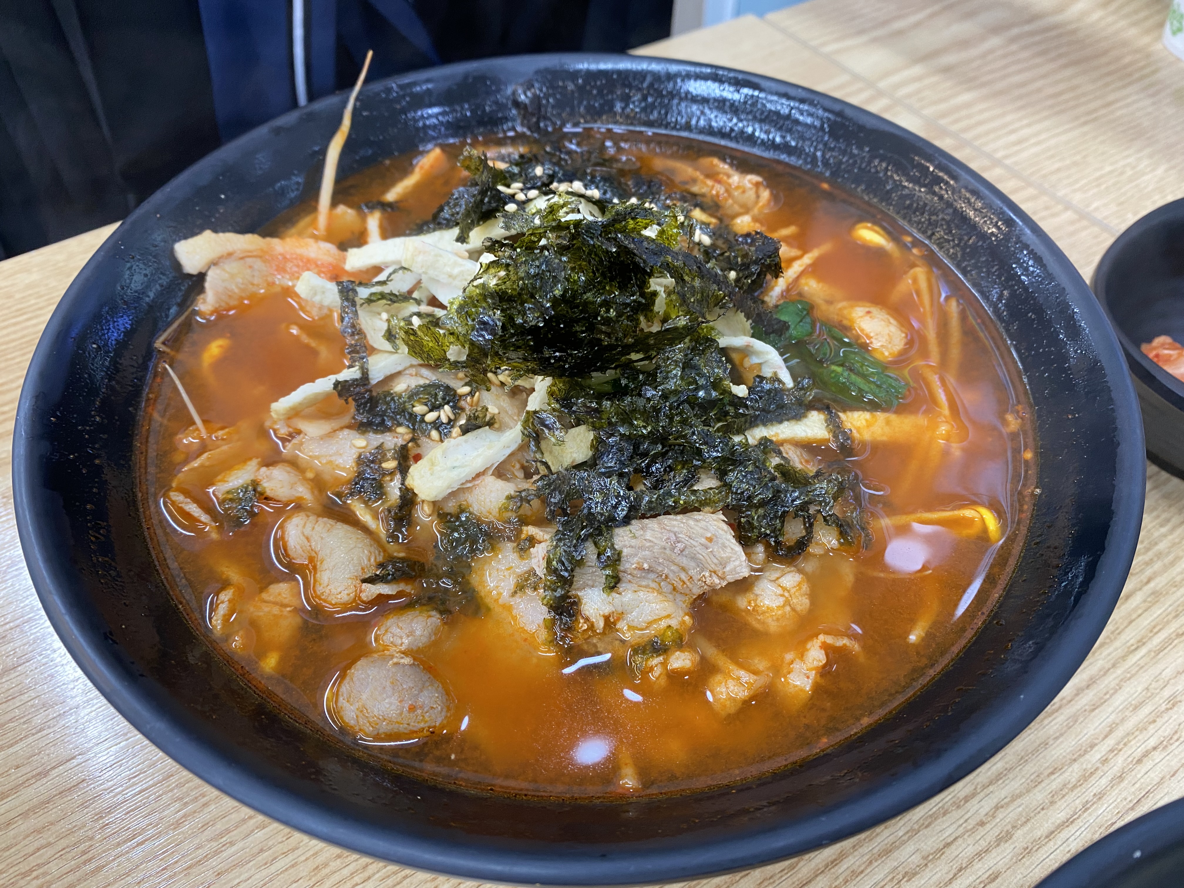 매콤 고기국수의 비주얼. 가격은 7000원. 생각했던 것보다 고기가 많이 들어서 놀랐습니다. 맛도 괜찮고요. 추운 날 뜨끈한 국물이 생각날 때 먹으면 좋을 것 같습니다.