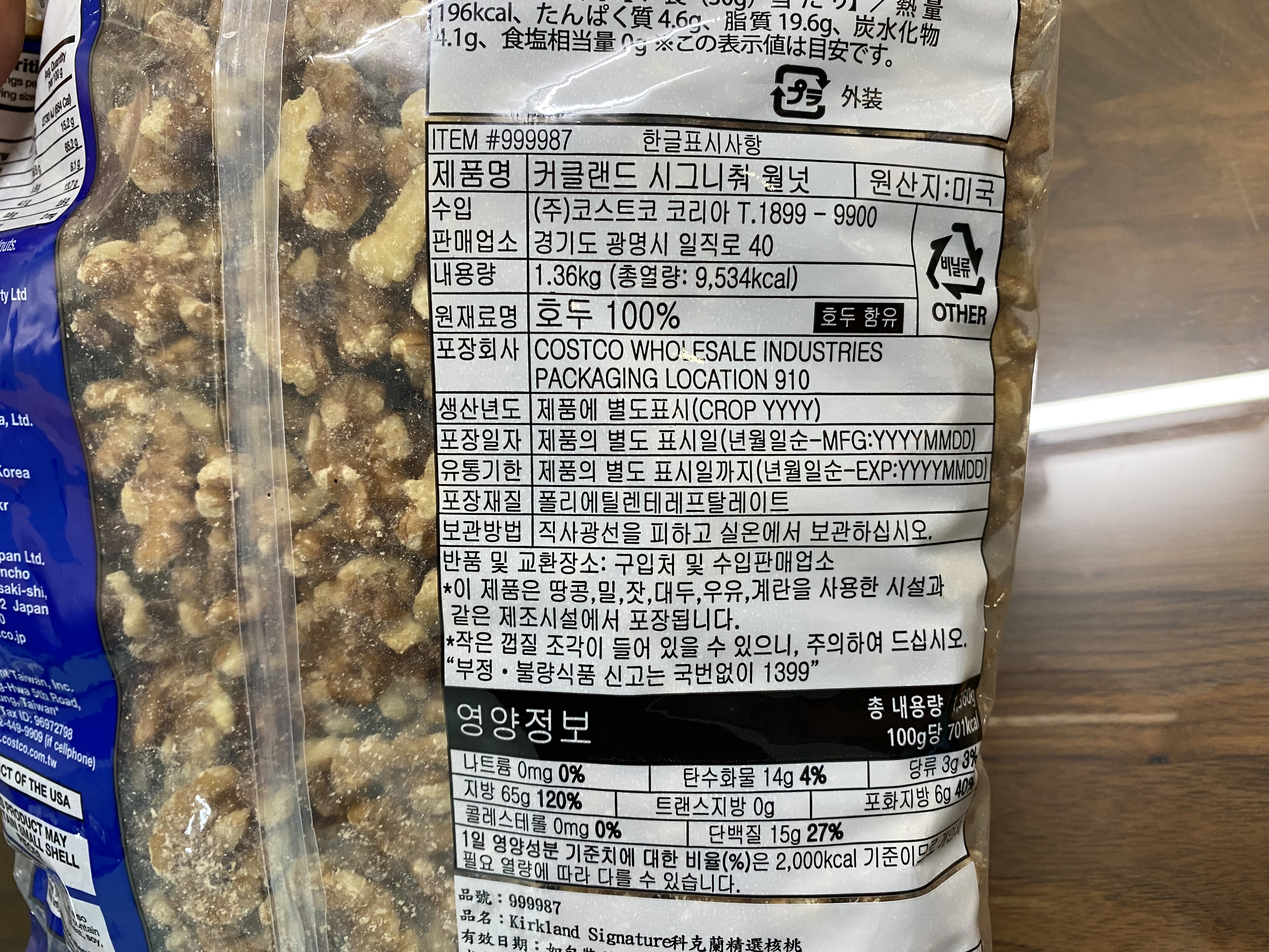 커클랜드 시그니춰 월넛은 미국산 호두 100%입니다. 호두를 기계로 깐 제품이기 때문에 작은 껍질 조각이 들어갈 수 있다고 하네요. 이 제품 말고 좀 더 비싼 '커클랜드 시그니춰 핸드 쉘드 호두'도 있는데 이건 제품명에서도 볼 수 있듯 사람이 손으로 깐 호두입니다. 저는 질보다 양이라 그냥 싼 걸로 샀네요.