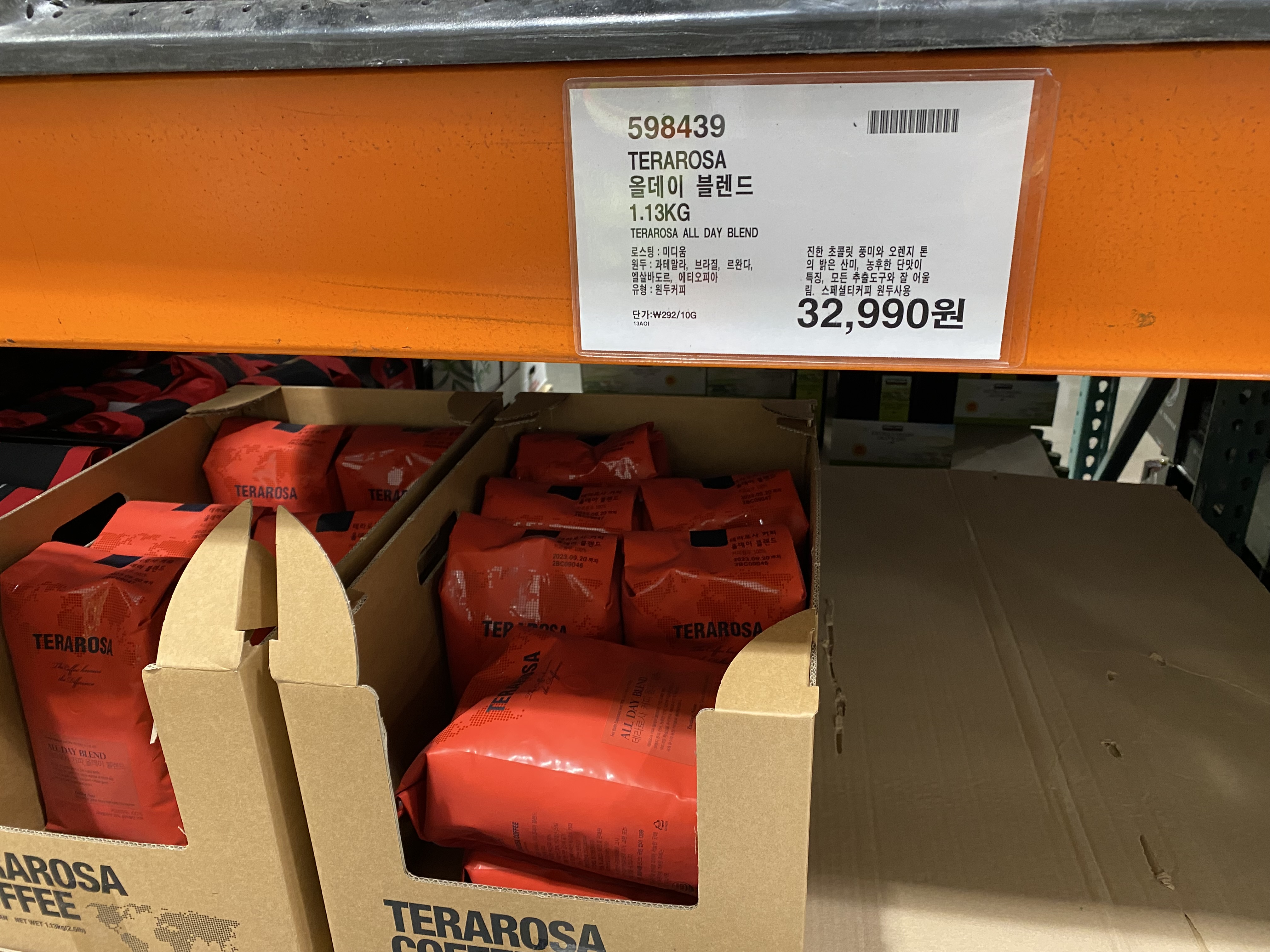 코스트코에서 가격은 좀 비싸지만 가장 먹을 만한 커피 원두로는 테라로사(Terarosa)와 폴바셋(Paul Bassett)이 있습니다. 2개를 동시 먹어본 것은 아니지만 제가 느끼는 차이점은 이렇습니다. 테라로사는 구수한 느낌이 강하고, 폴바셋은 산미가 좋습니다. 생각날 때마다 꾸준히 구매하고 있는 제품이니 믿고 사셔도 괜찮은 원두라 생각합니다. 둘 다 밸런스가 좋은 미디엄 로스팅입니다. 단위 가격은 비슷합니다.