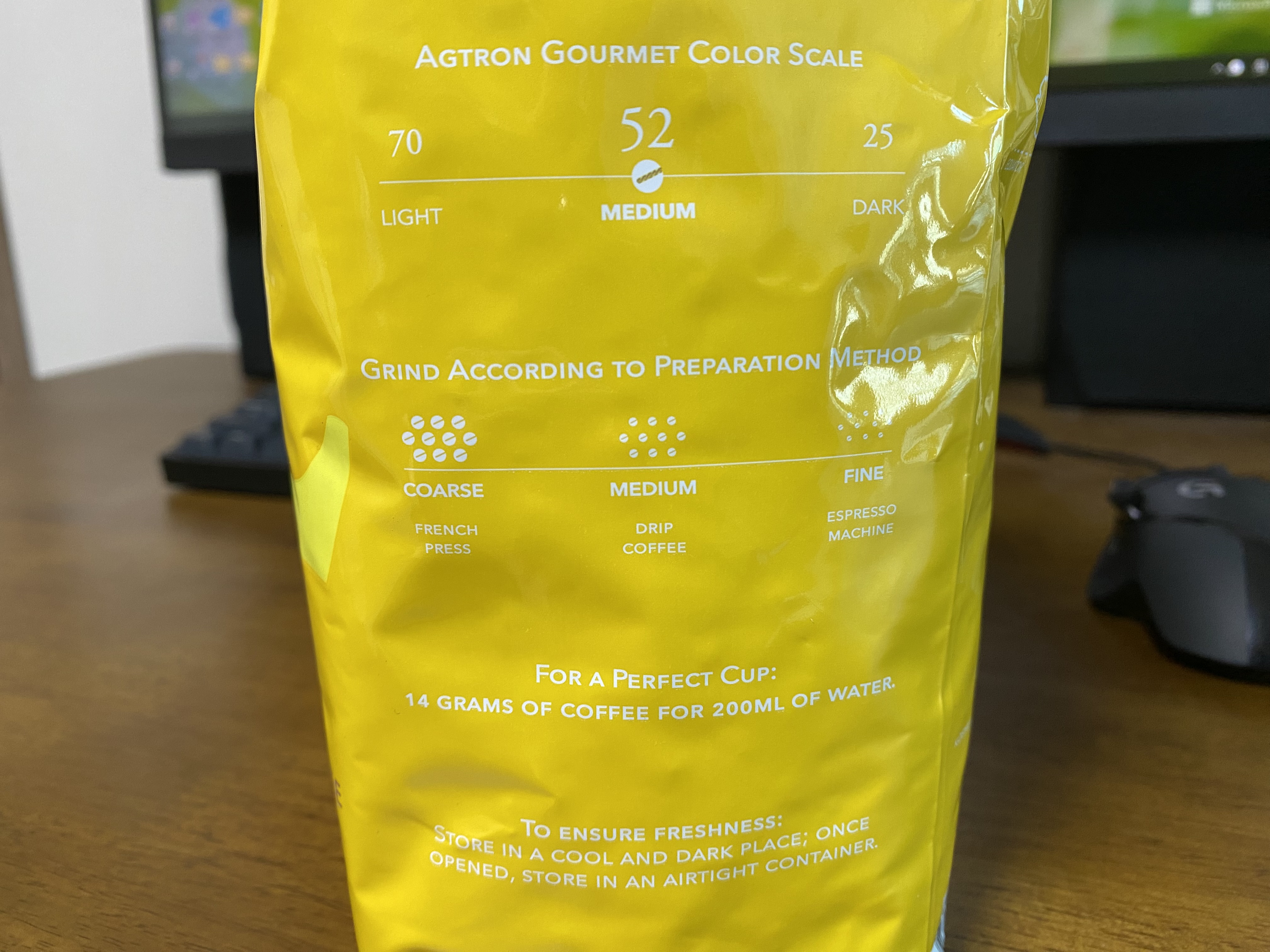 이 우일라 원두 커피는 미디움 로스팅이고 그라인딩은 되지 않은 원두입니다. 완벽한 커피 한잔을 위해 필요한 건 물 200ml에 커피 14그램...이라고 말합니다.