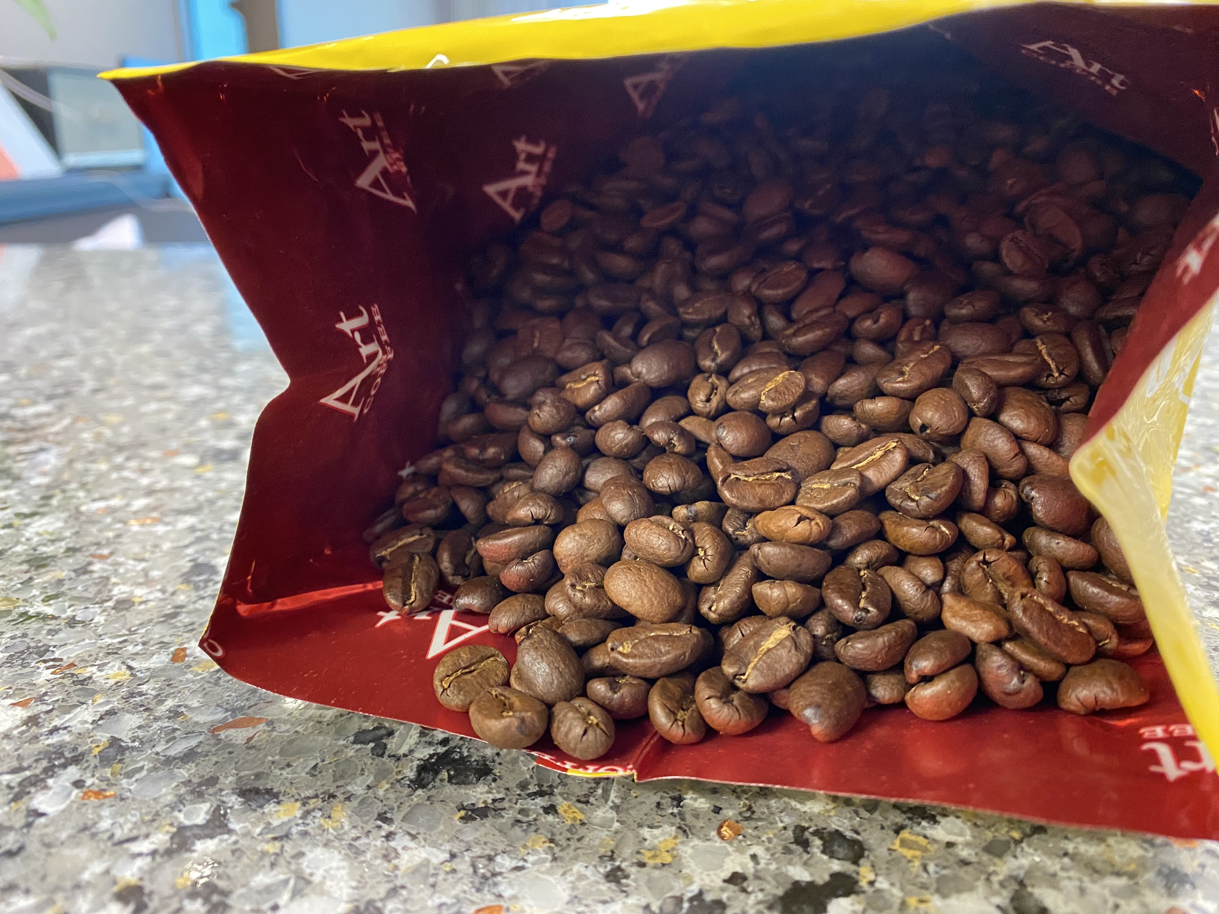ART IS COFFEE 우일라 원두를 개봉한 모습. 원두가 가볍고 밝은 갈색을 띠고 있습니다.