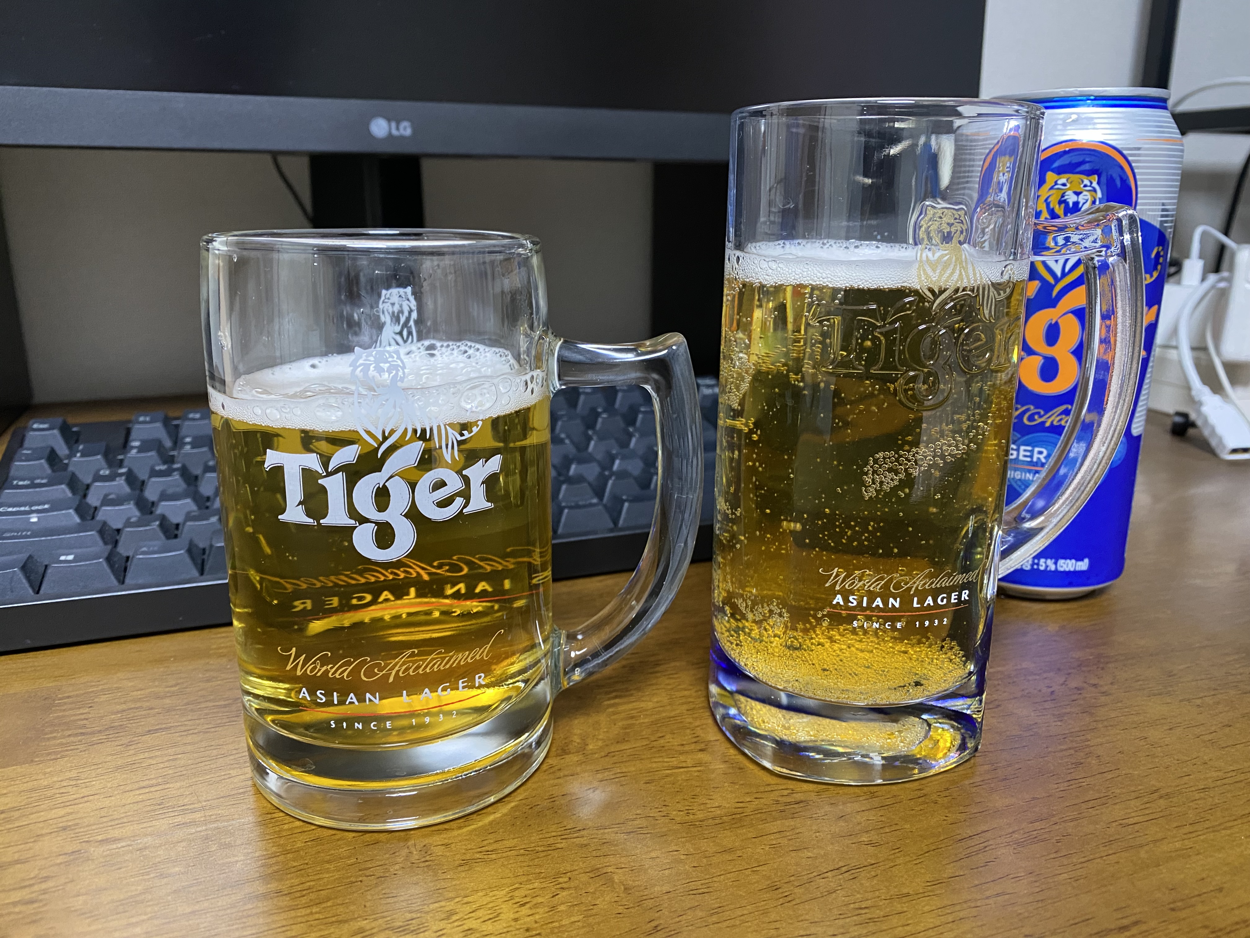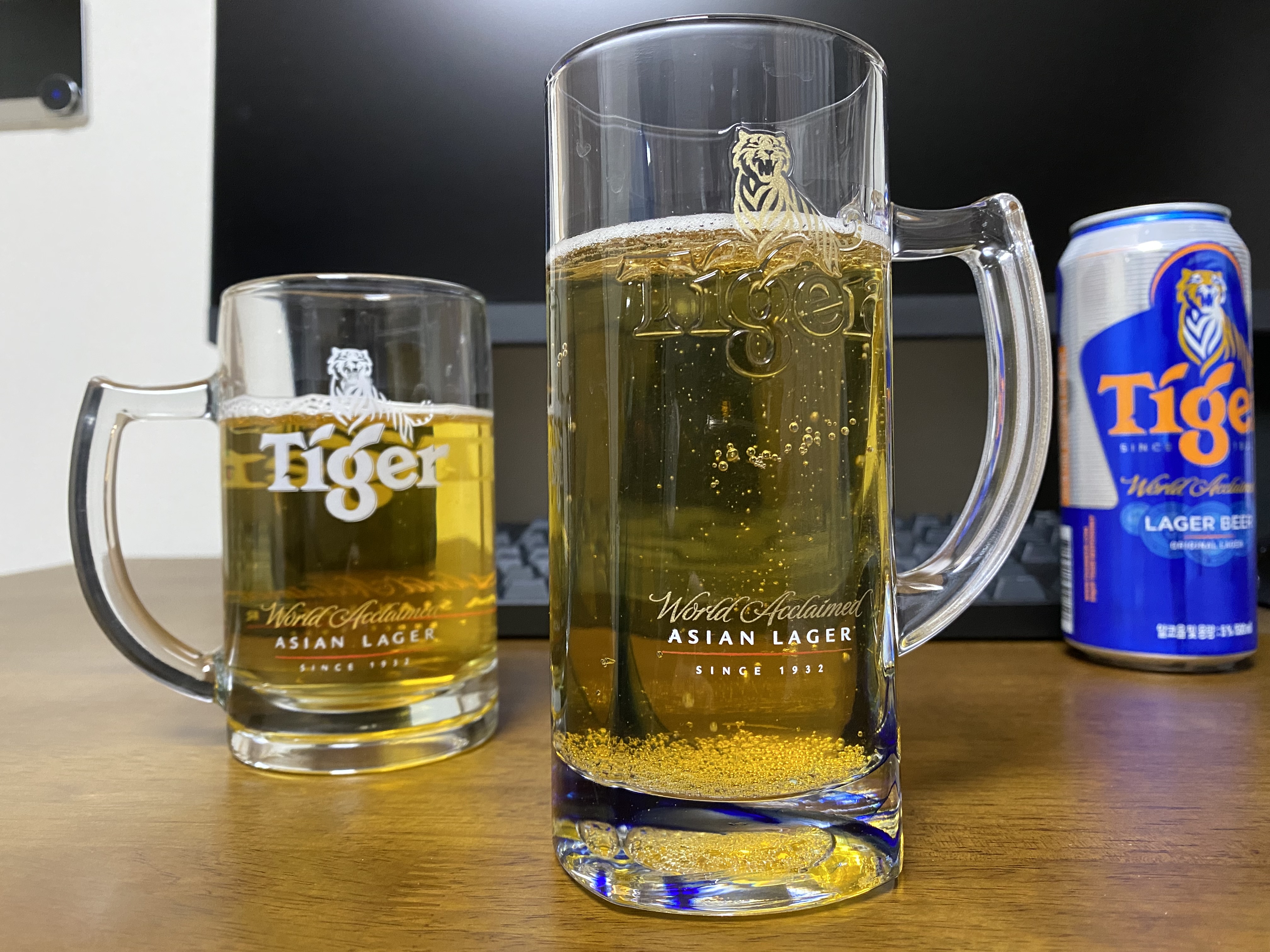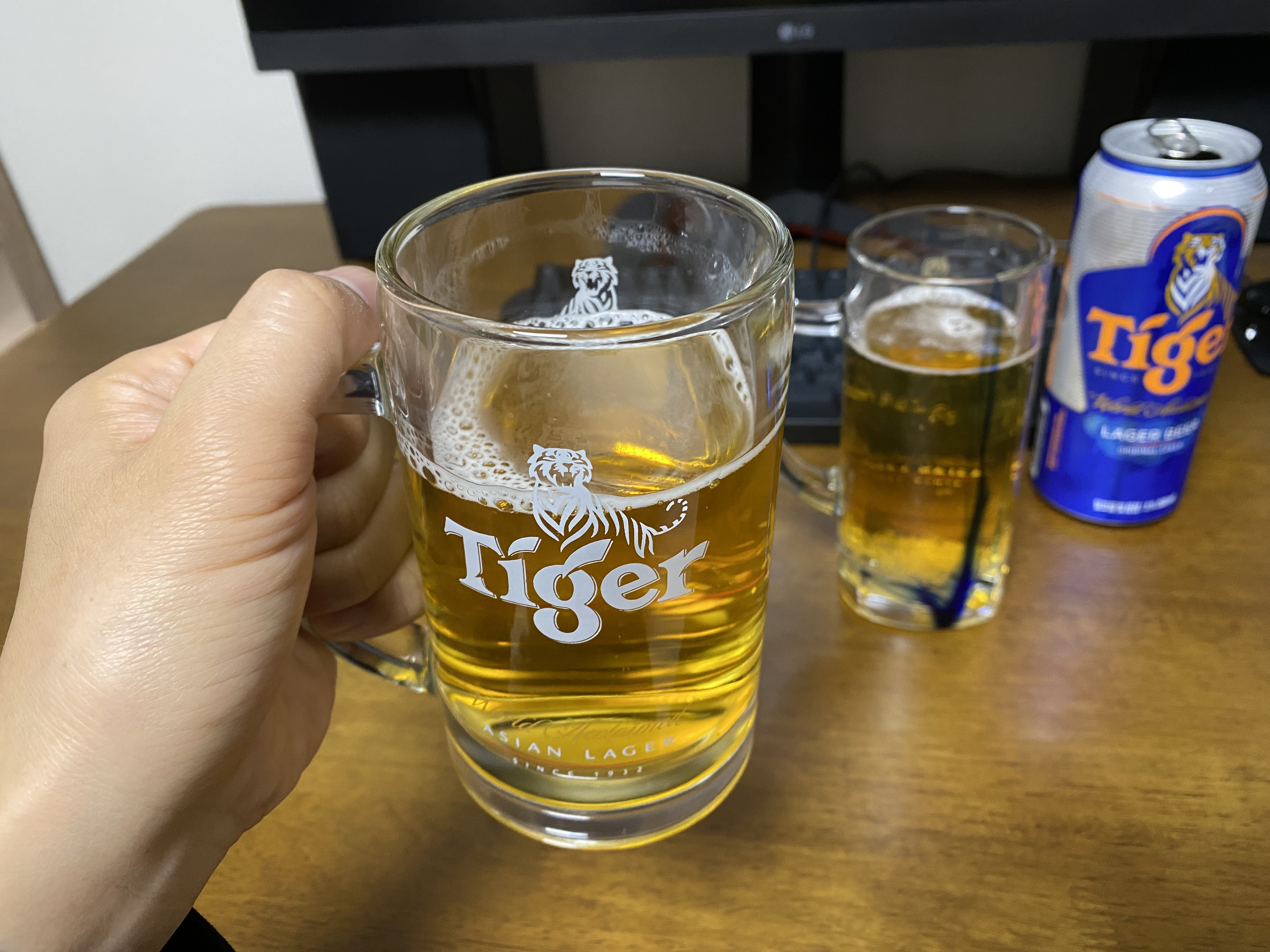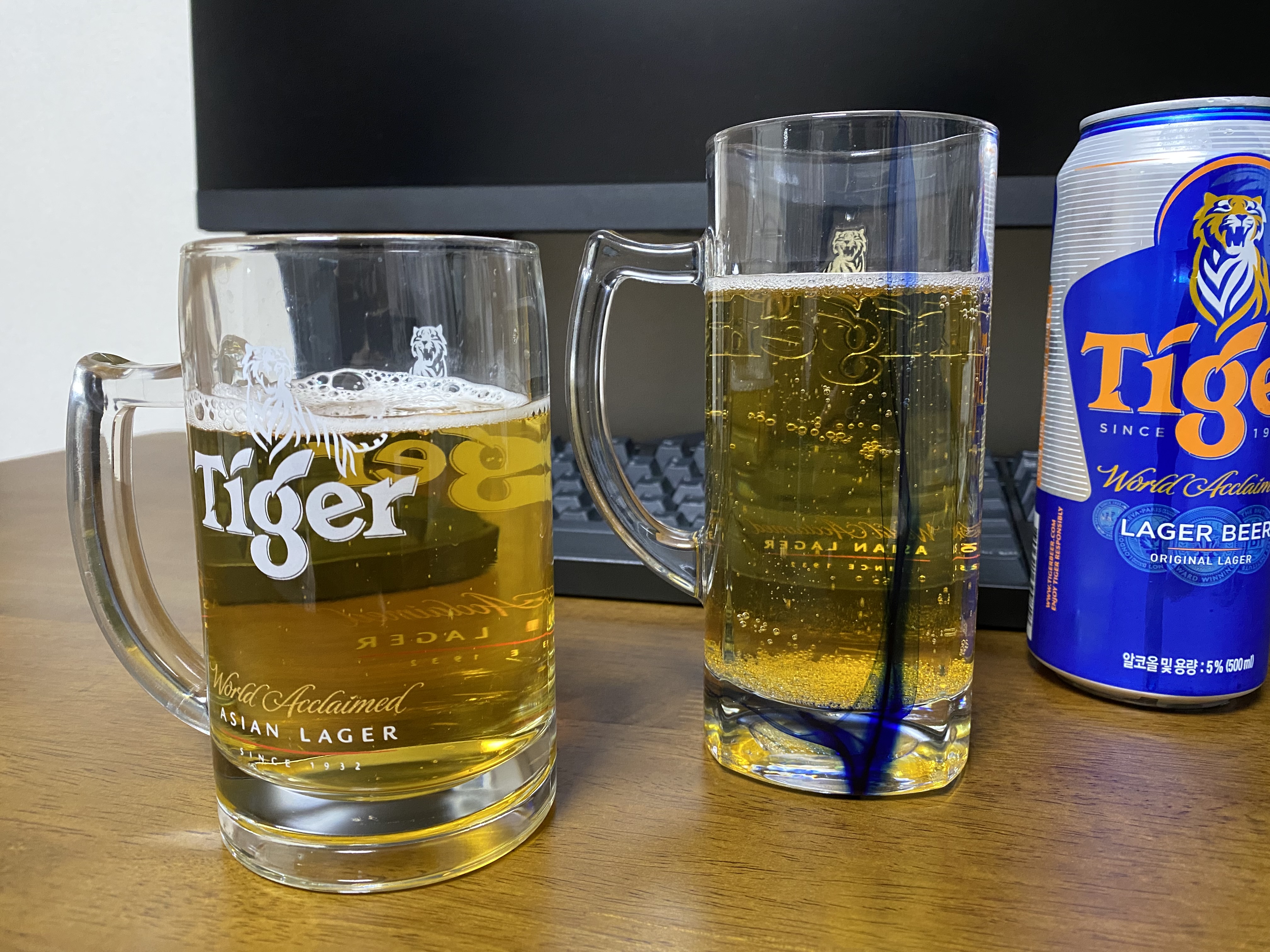 타이거 맥주를 전용잔에 따른 모습. 맥주는 전용잔에 마셔야... 한다는 법은 없지만 그냥 기분이 좋아서 자주 애용합니다. 더울 때는 마시기 전 잔을 미리 냉동실에 넣어두는 치밀함을 보여줍니다.