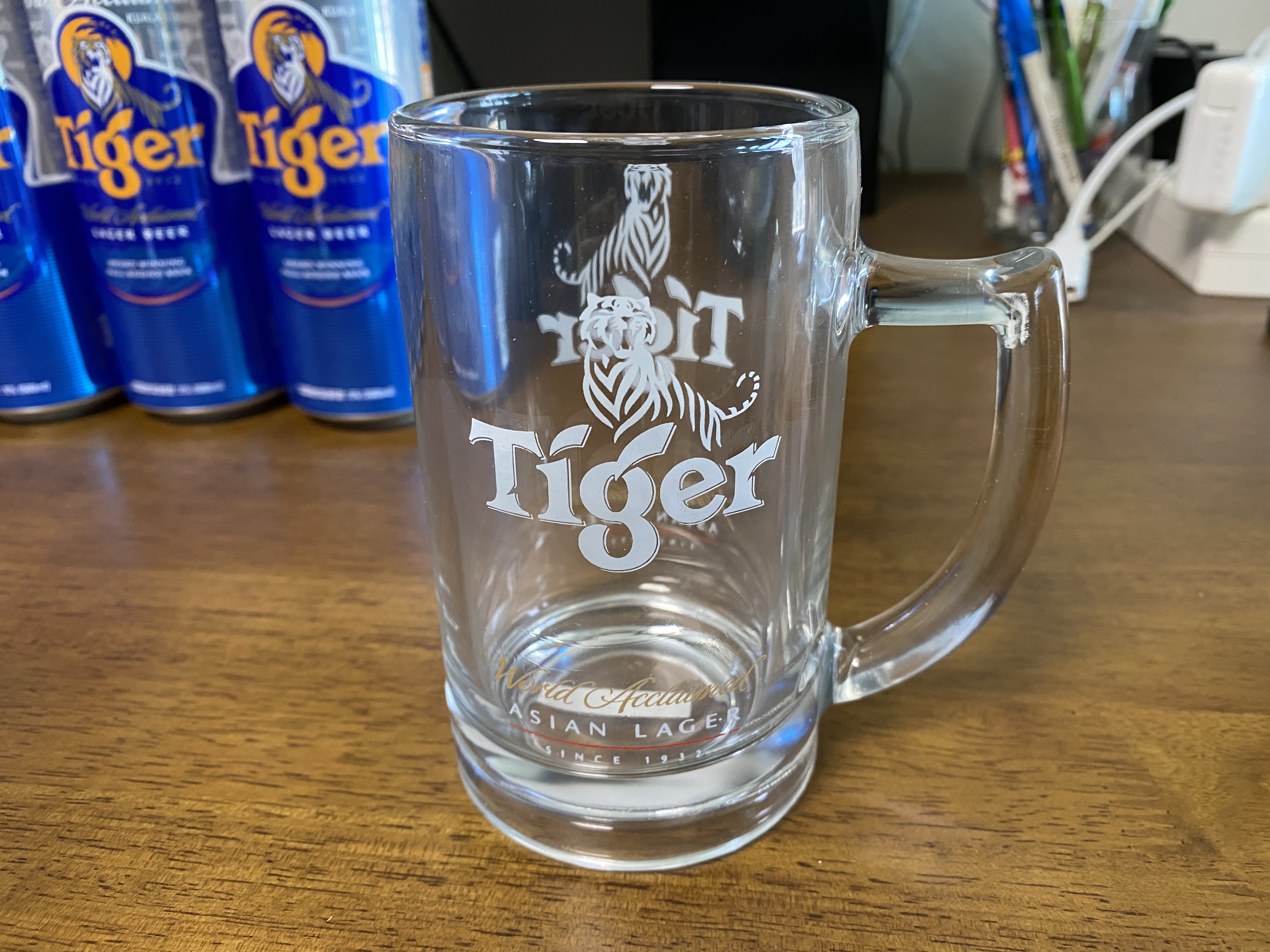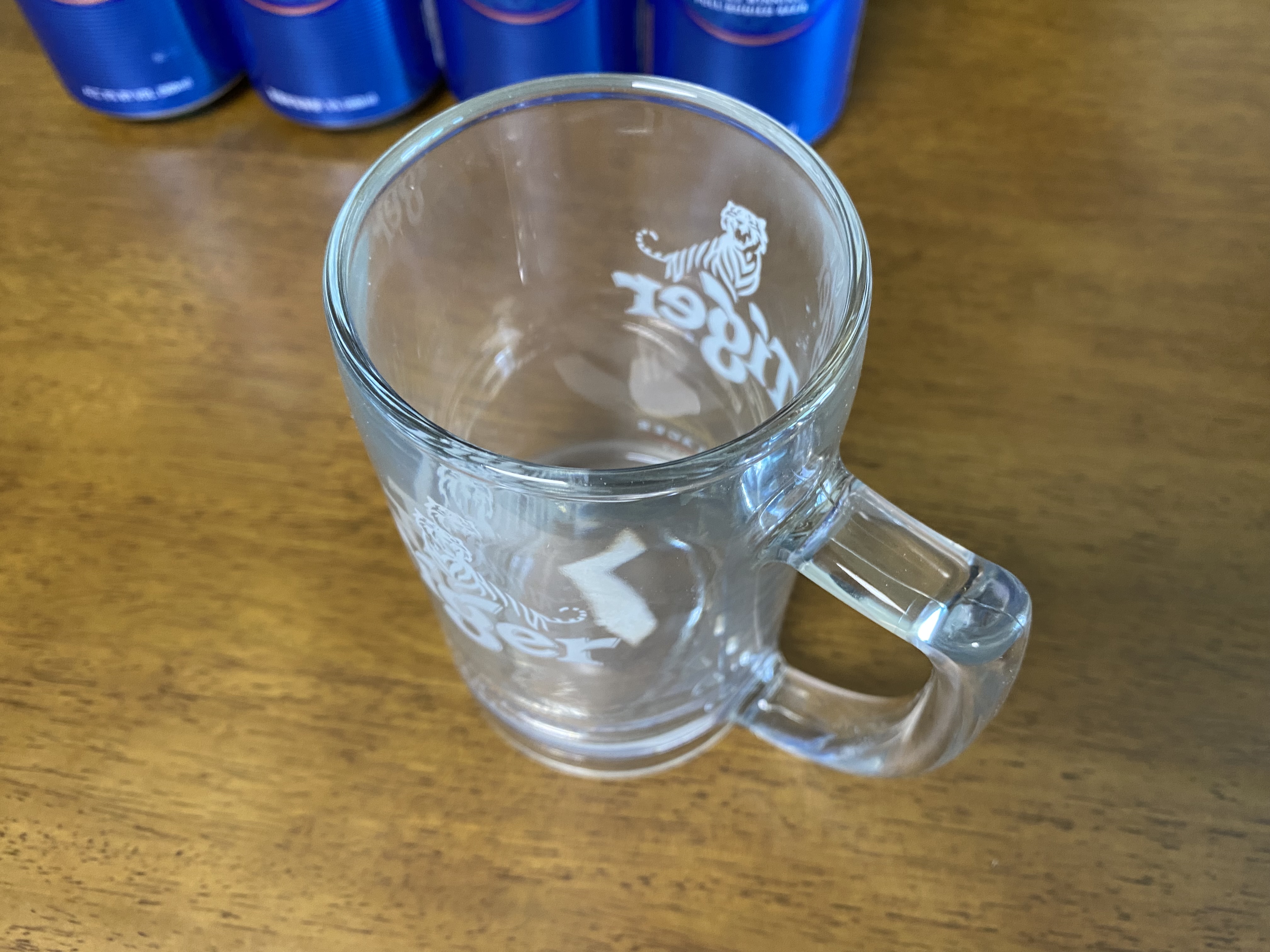 이것이 바로 타이거 전용잔. 위쪽 부분이 안쪽으로 살짝 들어간 것이 포인트. 손잡이 부분도 타이거 전용잔만의 스타일이 있습니다.