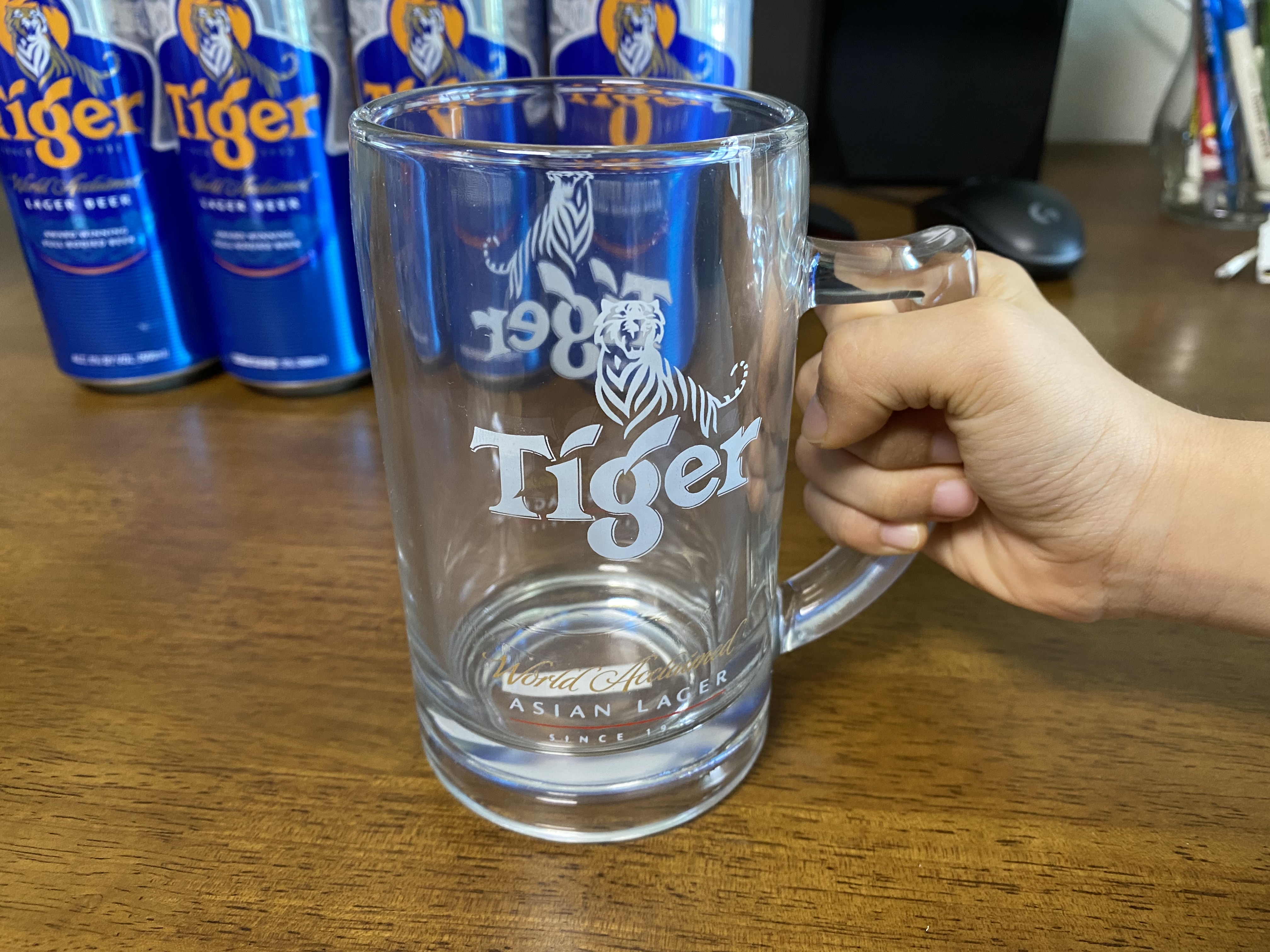타이거 전용잔은 들어보면 묵직합니다. 타이거 맥주 맛은 사실 별다른 게 없어요. 그냥 깔끔한 라거 수준. 개인적으로 타이거보다는 하이네켄, 칼스버그를 선호합니다. 사실 큰 차이는 없어요.