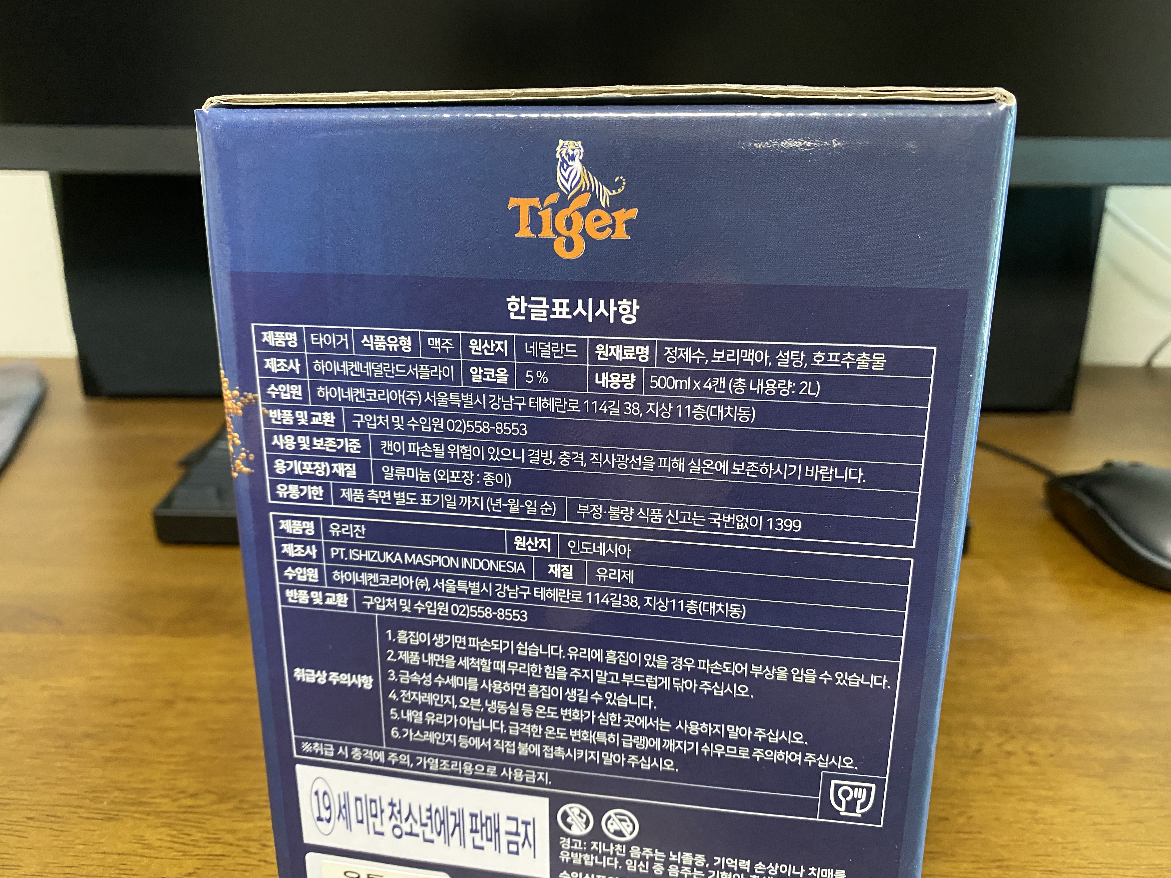 타이거 맥주라면 싱가포르를 대표하는 맥주로 알고 있는데 박스에 있는 원산지는 네덜란드라고 적혀있네요. 요즘은 맥주도 대량 생산하기 때문에 그런 것 같습니다. 제조사가 하이네켄 네덜란드 서플라이. 알코올 도수는 5%.