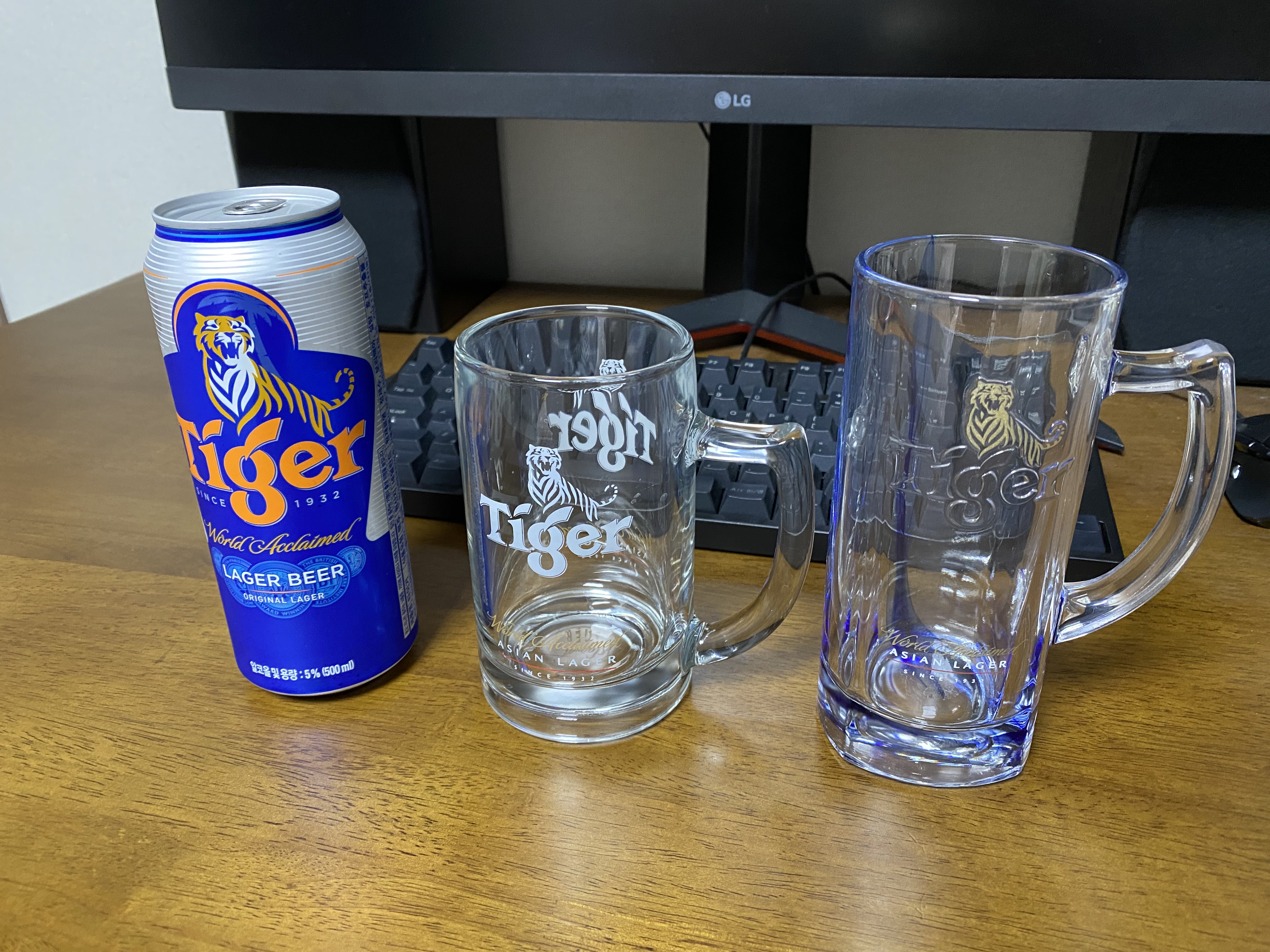 타이거 전용잔은 들어보면 묵직합니다. 타이거 맥주 맛은 사실 별다른 게 없어요. 그냥 깔끔한 라거 수준. 개인적으로 타이거보다는 하이네켄, 칼스버그를 선호합니다. 사실 큰 차이는 없어요.