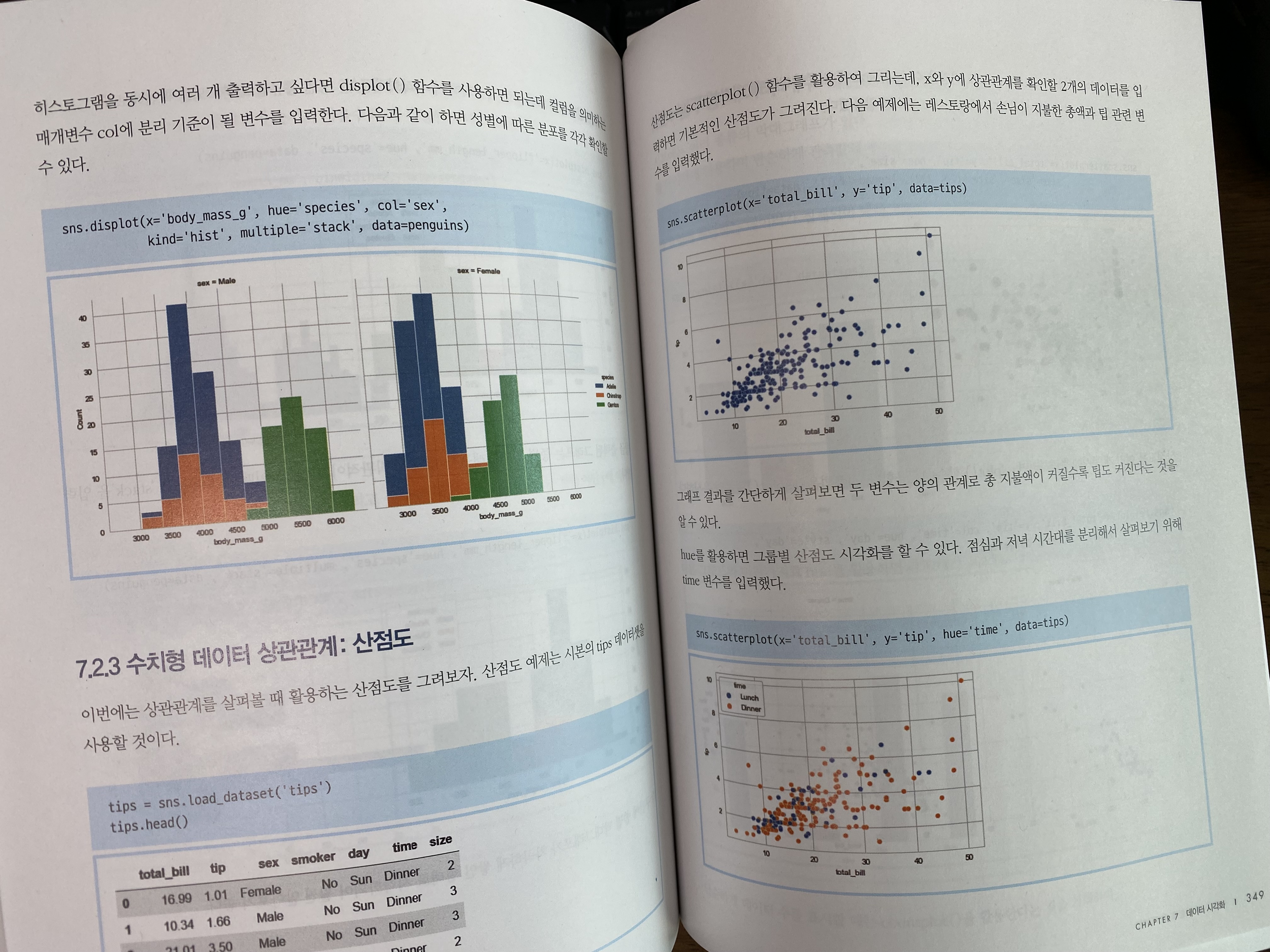 이 책을 읽으며 좋았던 점은 마지막 ‘챕터8 데이터 분석: EDA 실습’ 부분이었습니다. 1장부터 7장까지 보면서 라이브러리가 뭔지는 대강 알겠는데 어떻게 활용할지는 막막했습니다. 근데 마지막 실습을 직접 하나하나 따라 해 보니 확실히 감을 잡을 수 있네요. 아주 고난도 테크닉을 배우는 건 아니지만 자주 사용하는 데이터 분석 방식을 익힘으로서 다음에 다른 데이터를 만나도 비슷하게 따라 할 수 있을 것 같습니다. 챕터8을 하면서 헷갈리는 부분을 앞에서 찾아가며 공부하니 복습도 되고 좋았습니다.
