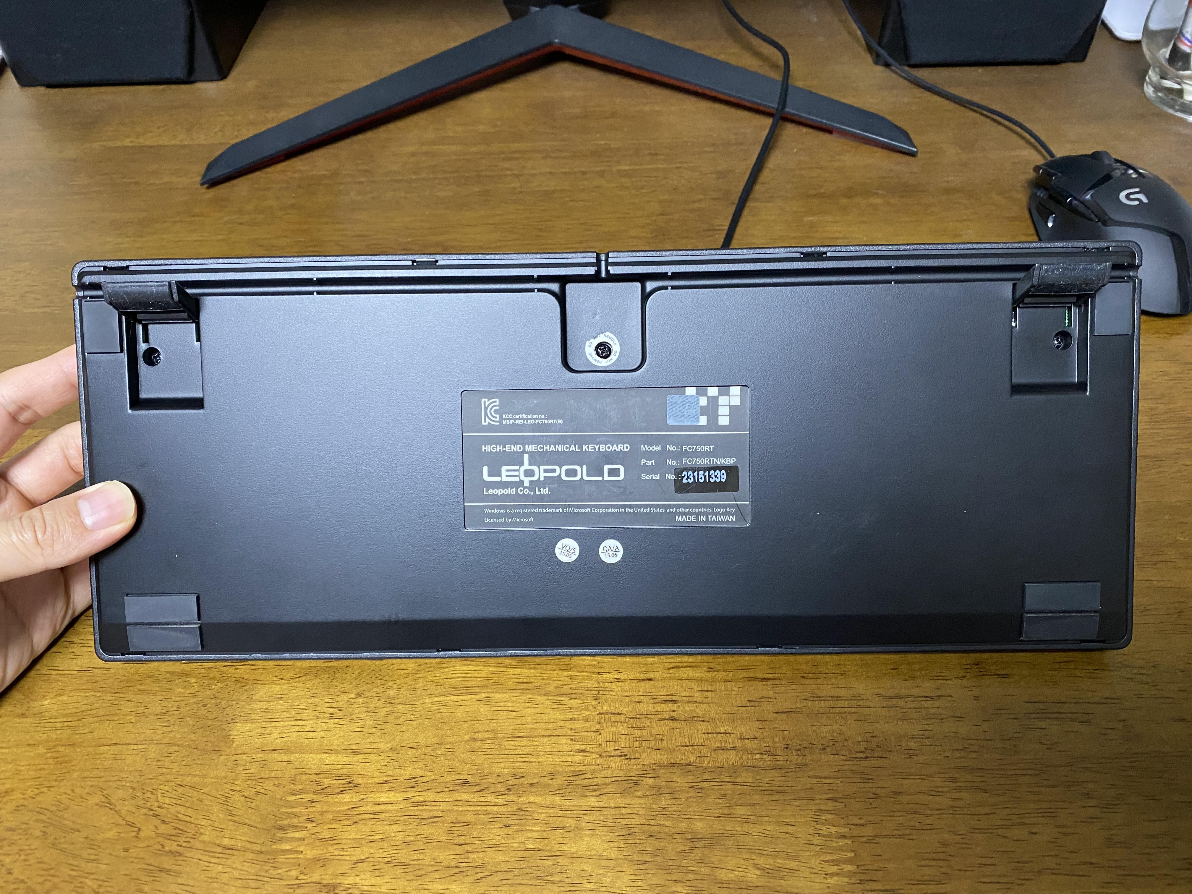 십자 드라이버로 드라이버로 레오폴드 FC750R 기계식키보드 아래에 있는 볼트를 모두 풀어줍니다. 중간 가운데 있는 볼트는 스티커를 제거하면 보입니다.