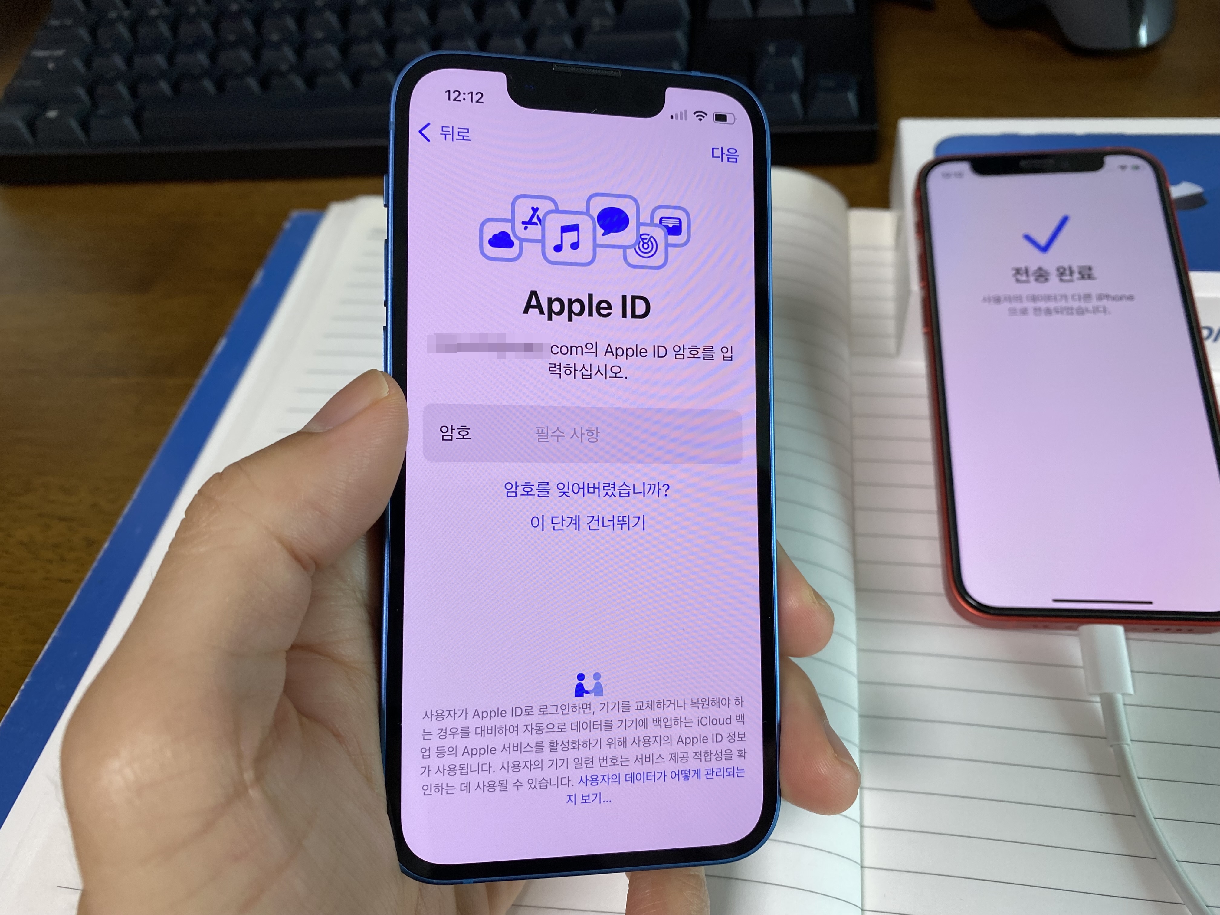 유심 교체 후 데이터를 옮기기 위해 두 아이폰을 켭니다.