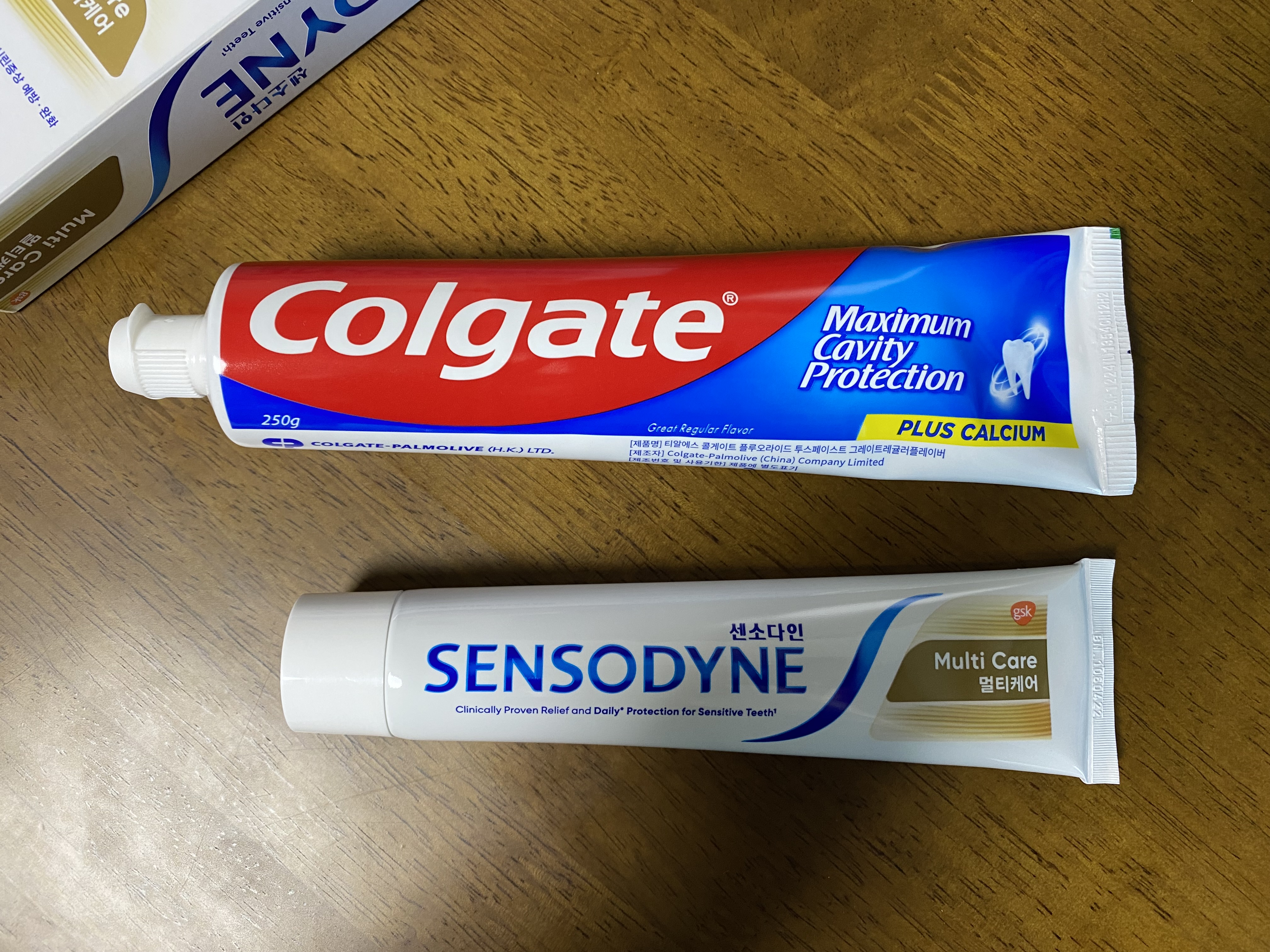센소다인 치약과 콜게이트 치약의 크기 차이입니다. 지금 현재 코스트코 온라인몰 기준 센소다인 멀티케어 치약 5개 20490원(10g당 410원), 콜게이트 치약 8개 30990원(10g당 221원)입니다. 그램당 단가로 보면 센소다인이 콜게이트보다 2배 정도 비싼 것을 볼 수 있습니다.