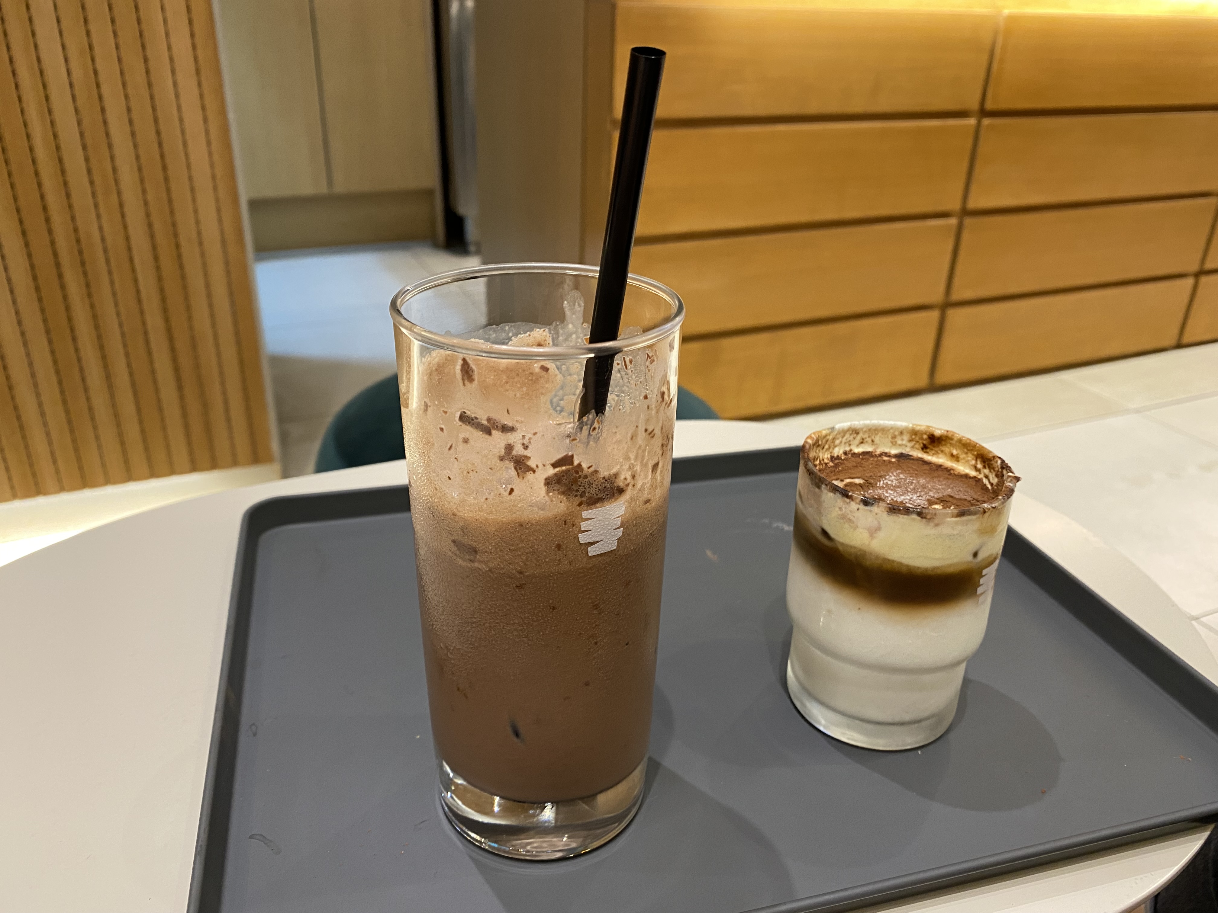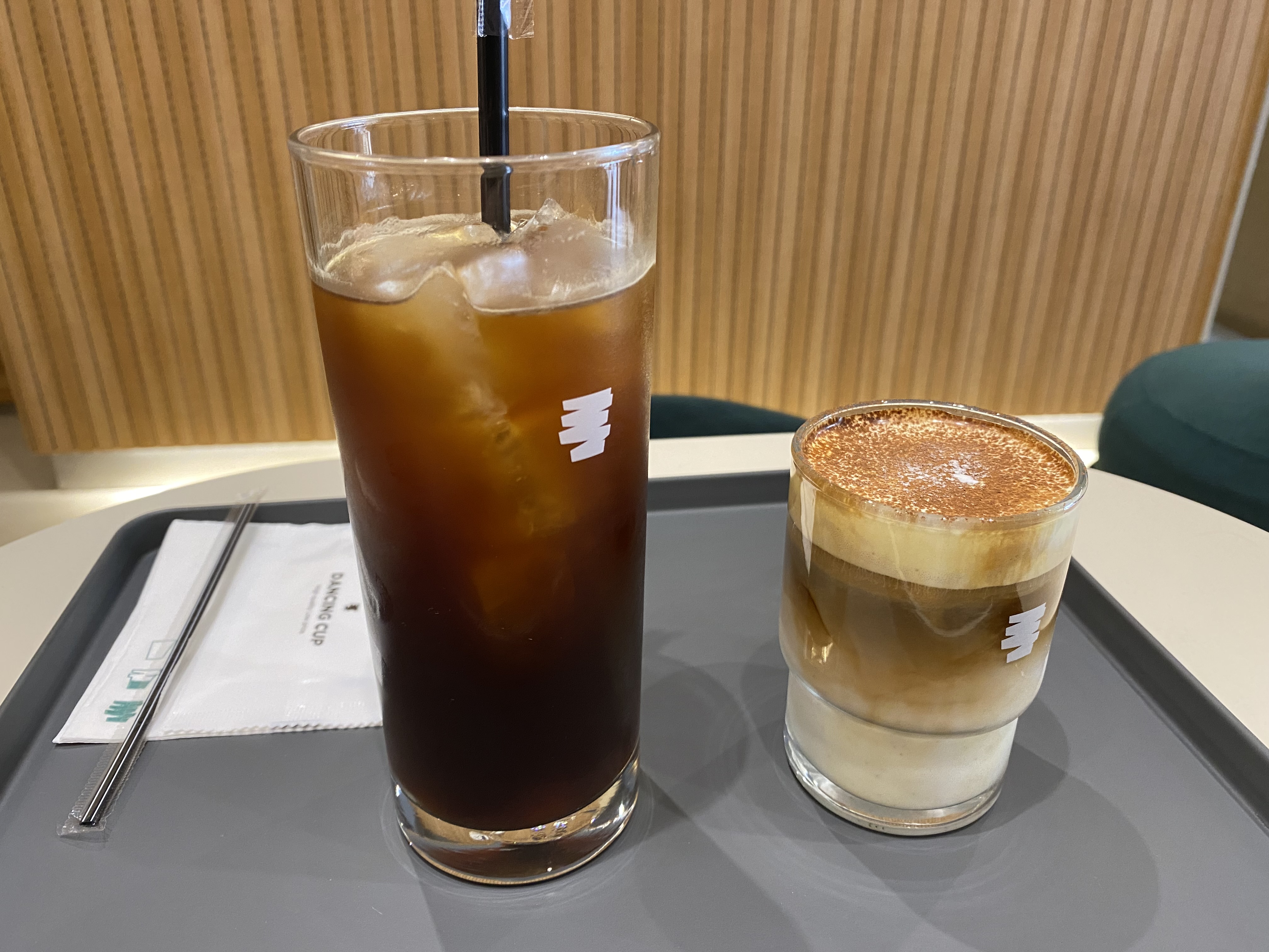 딥 초콜릿 라떼 4300원, 댄싱 커피 3500원의 비주얼입니다. 맨날 둘이 가서 아메리카노, 댄싱커피 조합으로만 먹다가 이날을 특이하게 처음으로 딥 초콜릿 라떼를 주문해봤습니다. 참고로 여기 댄싱컵은 스탬프 적립도 됩니다. 스탬프 7개 모으면 1개 쿠폰이 발행됩니다. 가격도 착한데 쿠폰까지 정말 좋은 것 같습니다.