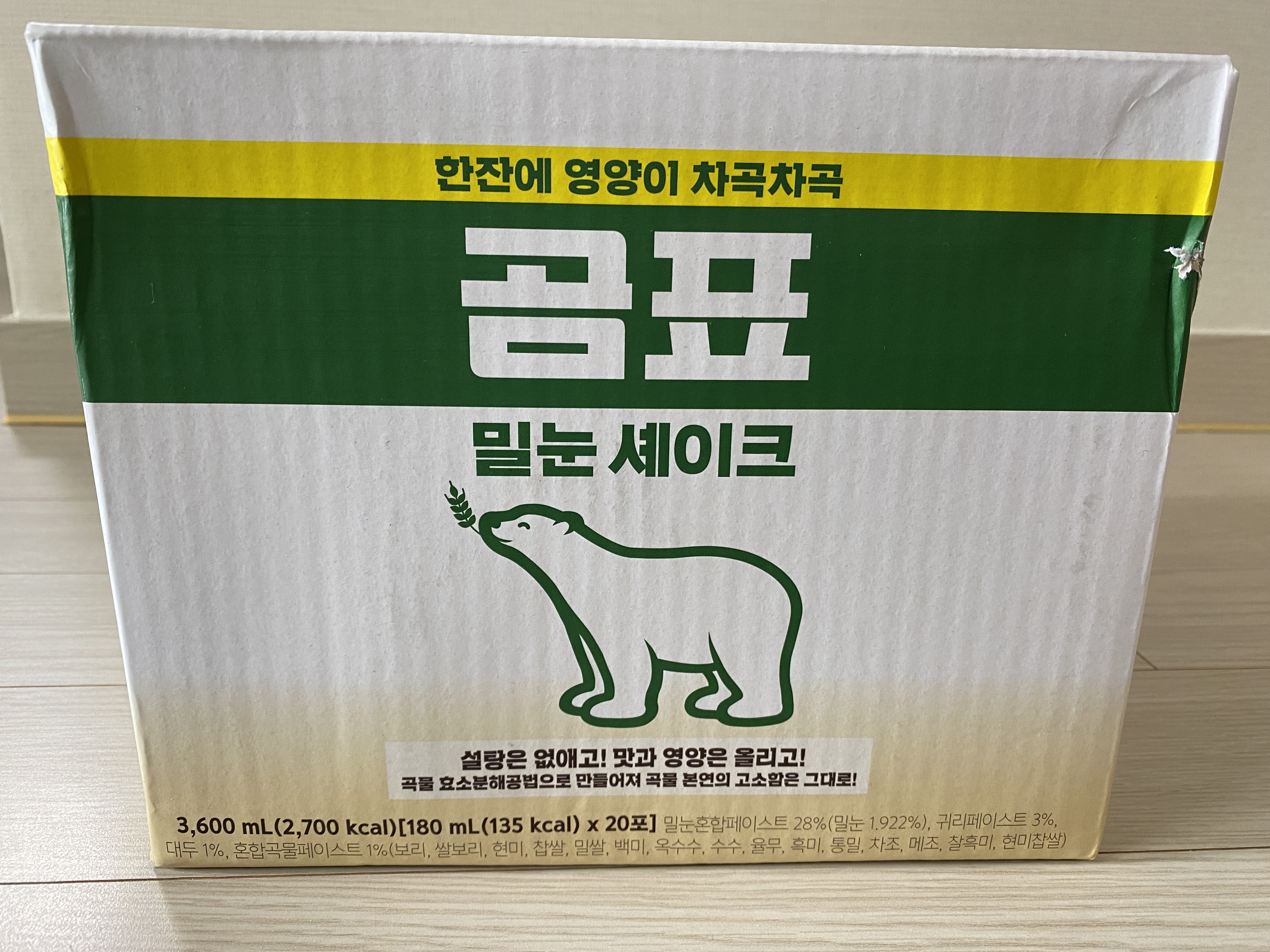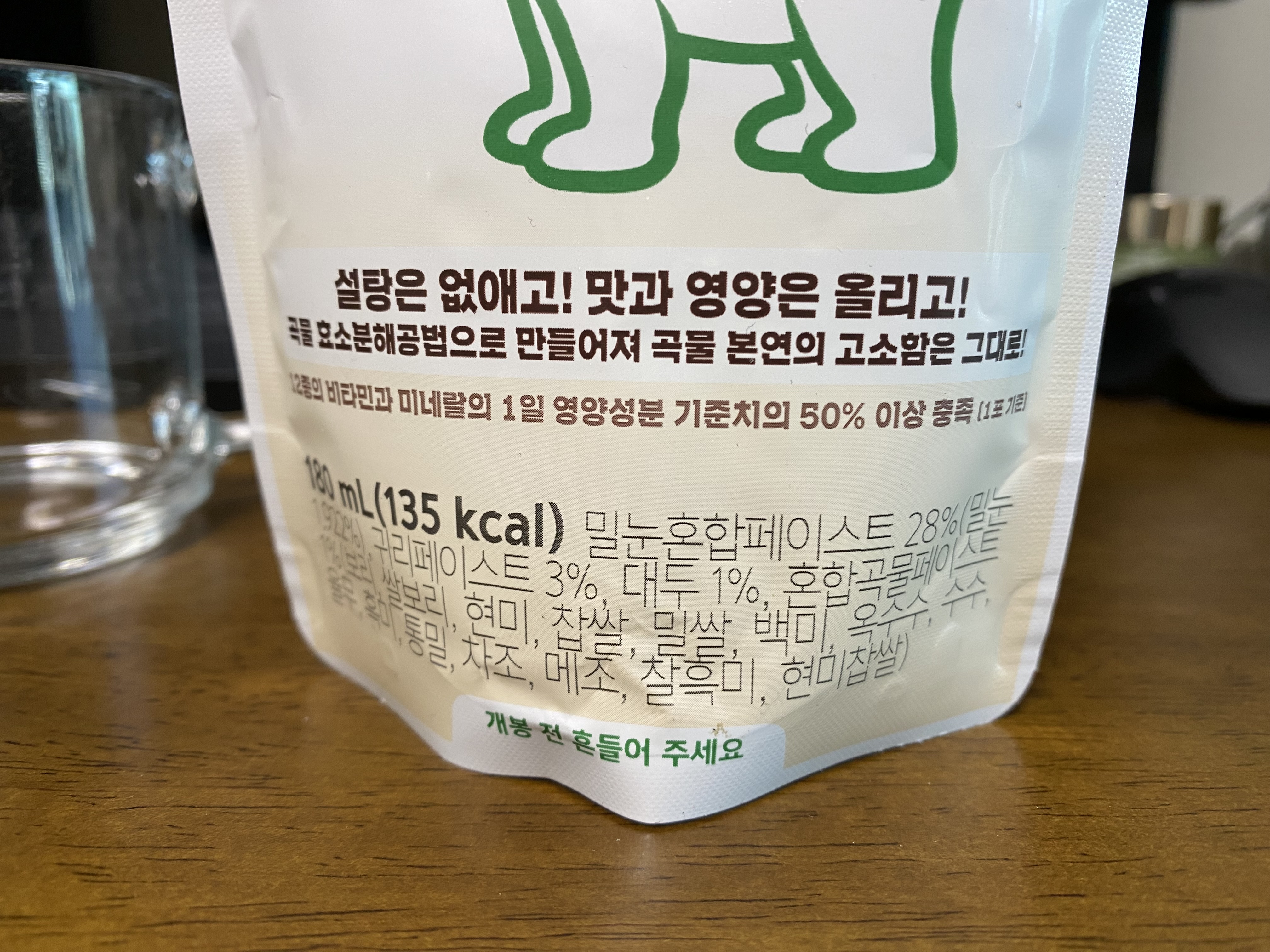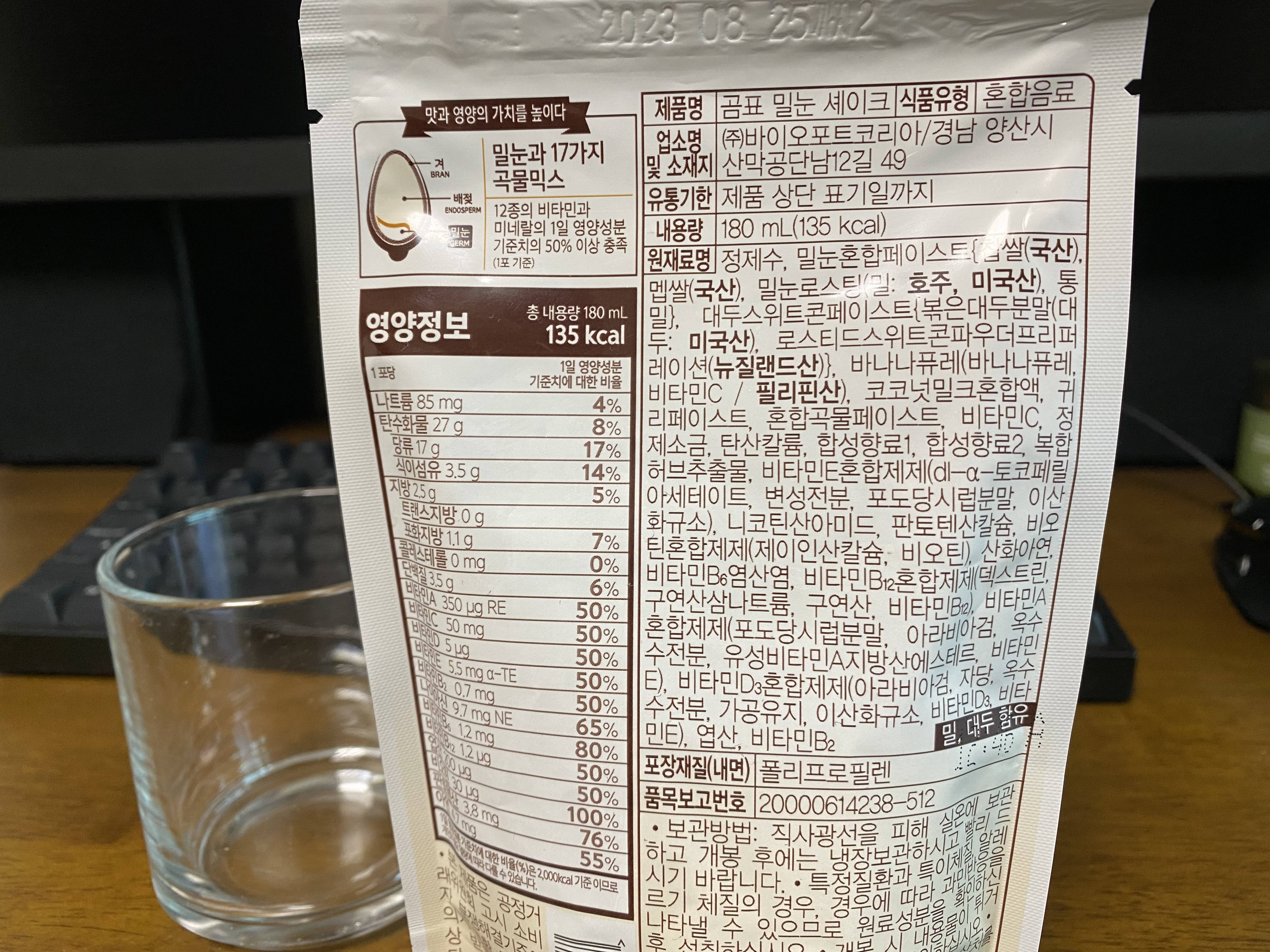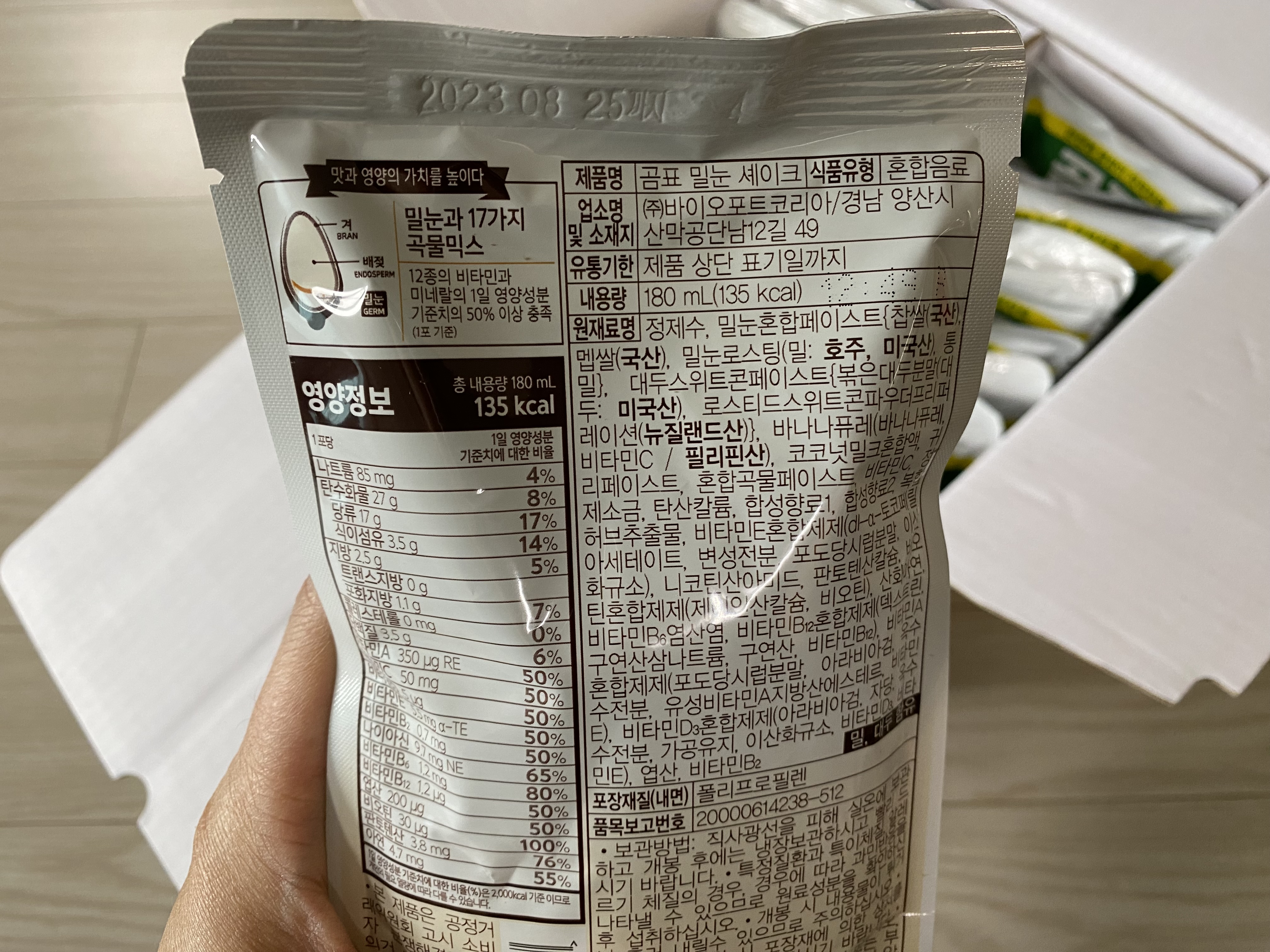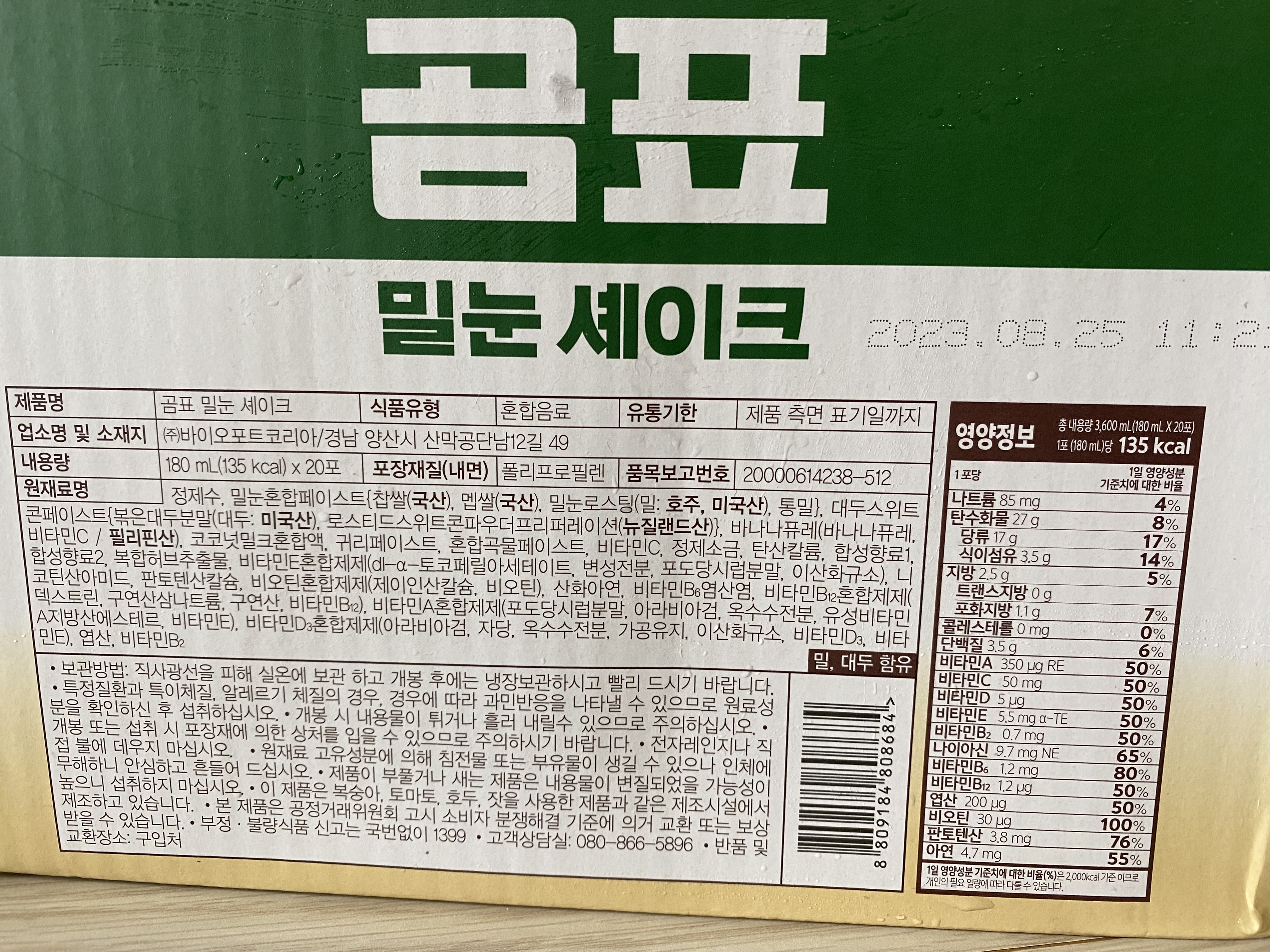 곰표 밀눈 쉐이크 1포는 180ml, 135kcal입니다. 공기밥 절반 정도의 칼로리네요.
