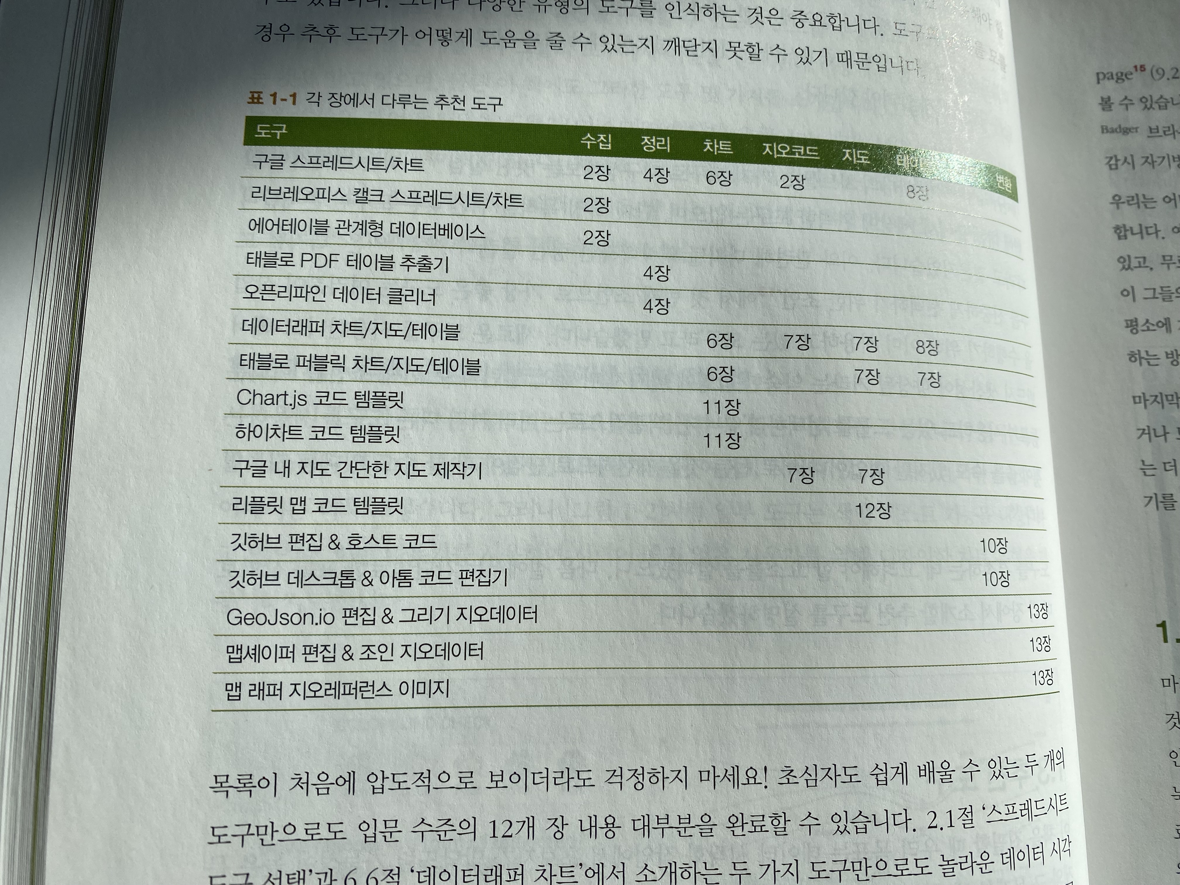 핸즈온 데이터 시각화. 이 책은 데이터 시각화를 처음 배우 싶은 사람에게 딱 어울리는 그런 책입니다. 보통 데이터 시각화를 다루는 책이 파이썬의 판다스, 맷플롯립 같은 라이브러리를 활용하는 경우가 많은데 이 책은 이런 프로그래밍적인 내용을 빼고도 정말 제대로 데이터 분석, 시각화를 설명합니다. 물론 10장부터 코딩을 조금 맛보게 되는데 아주 기초적인 내용이라 따로 공부하지 않아도 따라 할 수 있는 수준입니다. 초보자도 따라 할 수 있는 책이라고 하지만 그 내용은 아주 방대합니다. 대학 교재로 사용한다면 한 학기 또는 1년 정도의 내용이라 생각합니다. 꼼꼼하게 공부하면 시간이 제법 많이 들 것 같습니다.