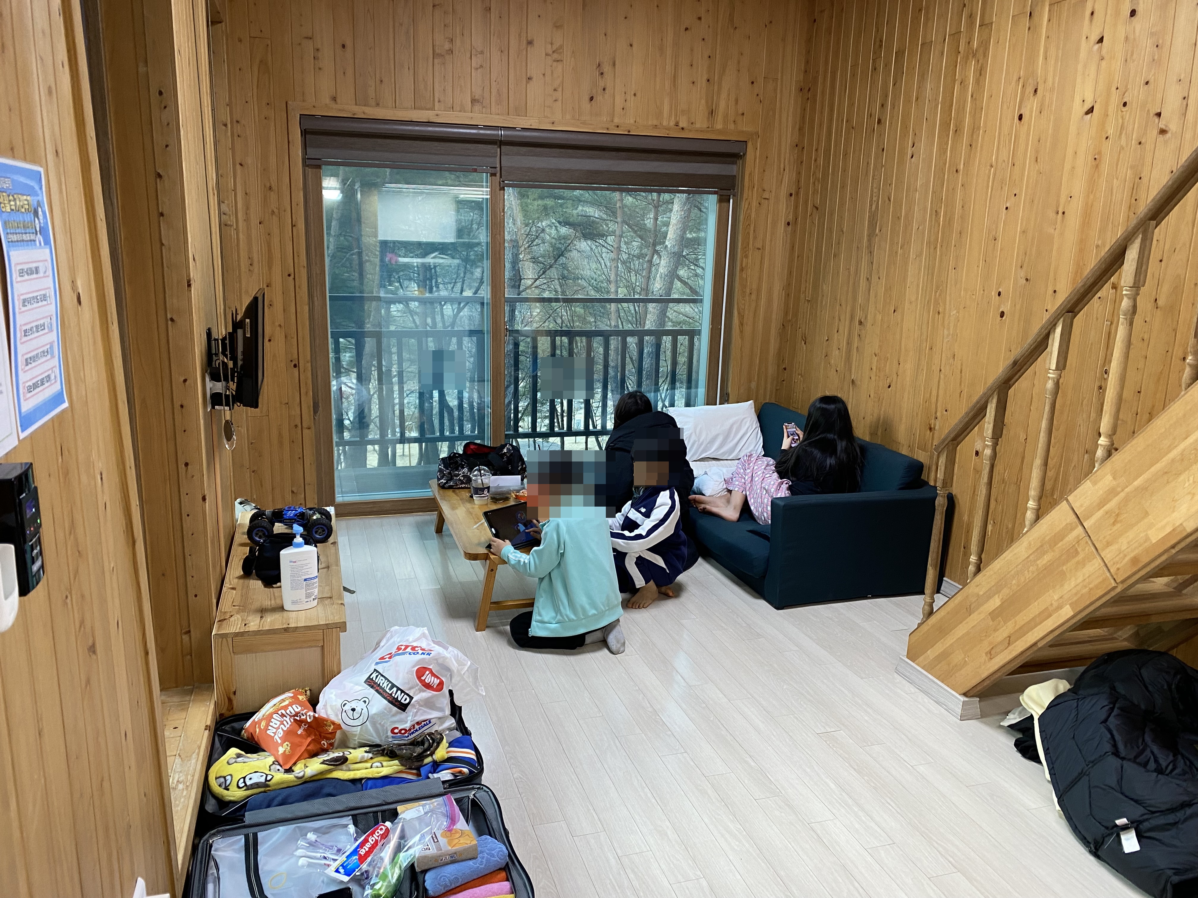 여기가 캐빈하우스 거실입니다. 낮은 소파와 테이블이 있습니다. 어린 아이들은 2층 방에서 떨어질 수도 있으니 밑에서 이불 깔고 자면 될 것 같습니다. 자연 속에서도 아이들의 스마트폰, 아이패드 사랑은 멈출 줄을 모릅니다.