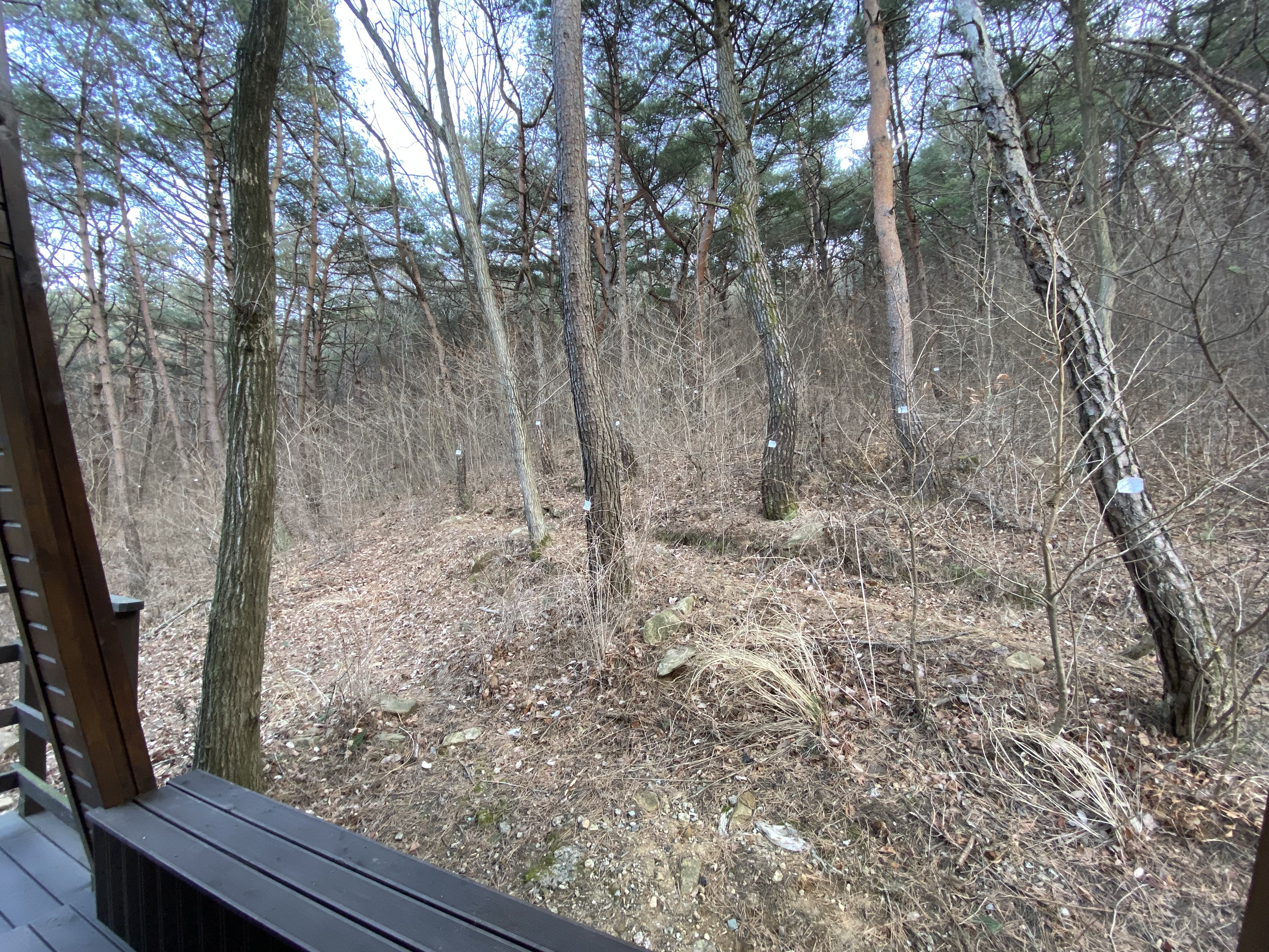 출입문 맞은편은 바로 산. 나무들로 가득합니다. 가끔 고양이들이 출몰합니다.