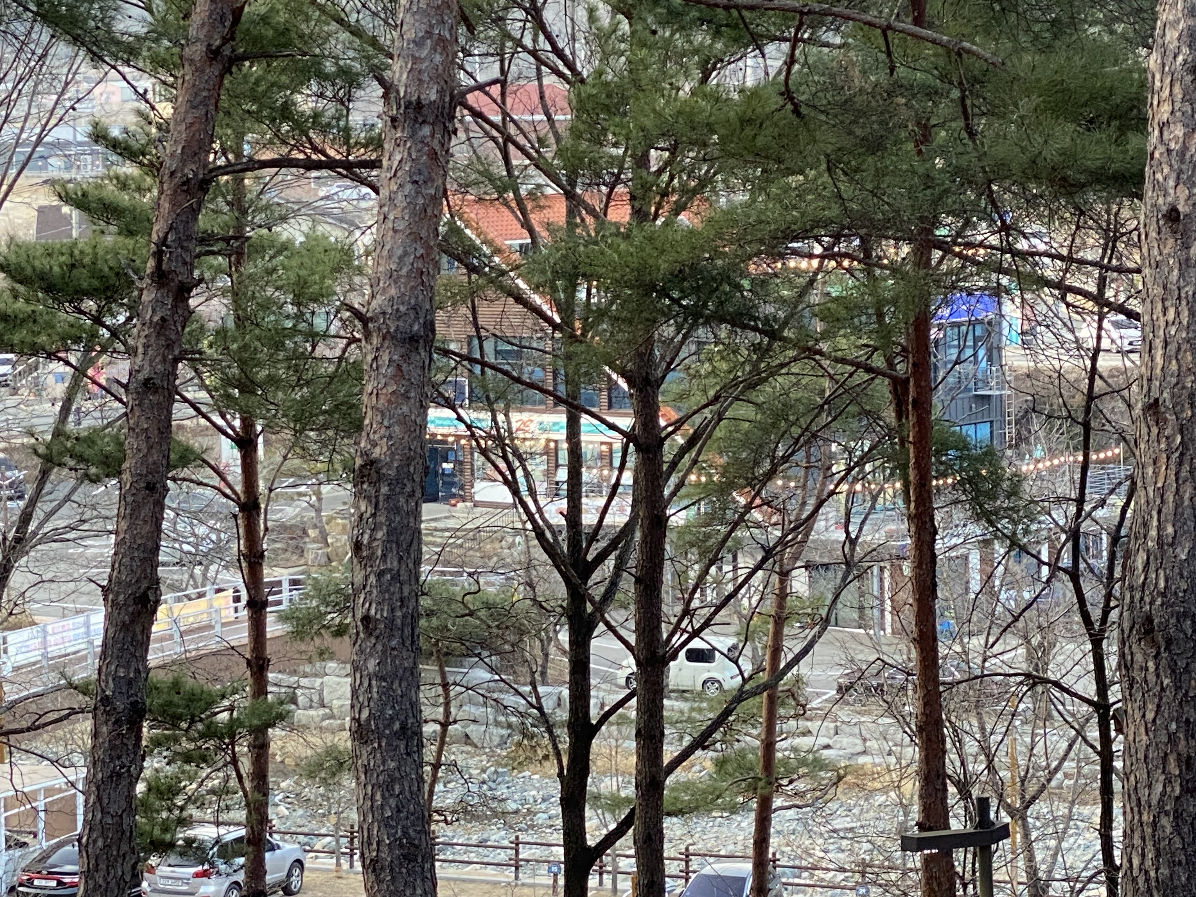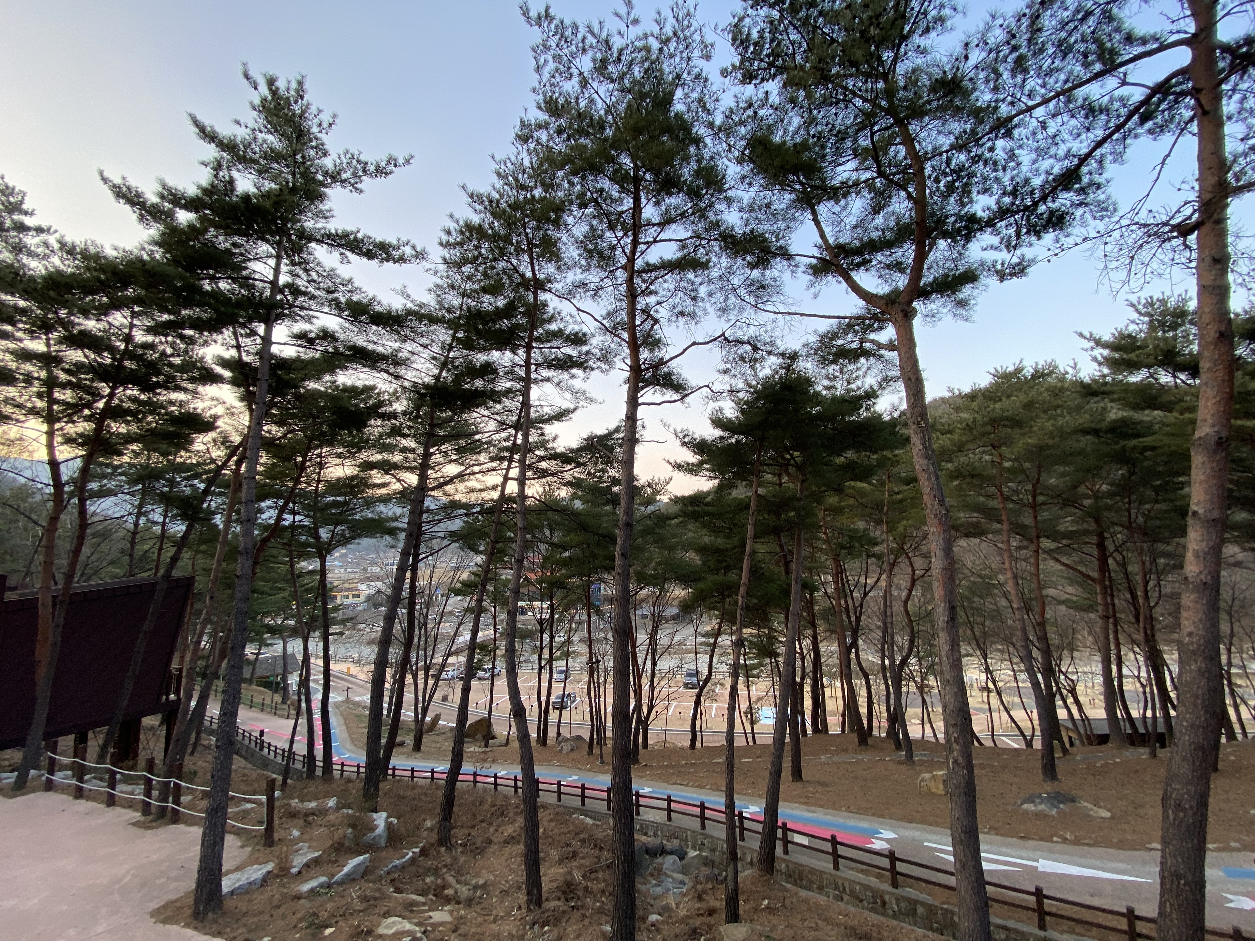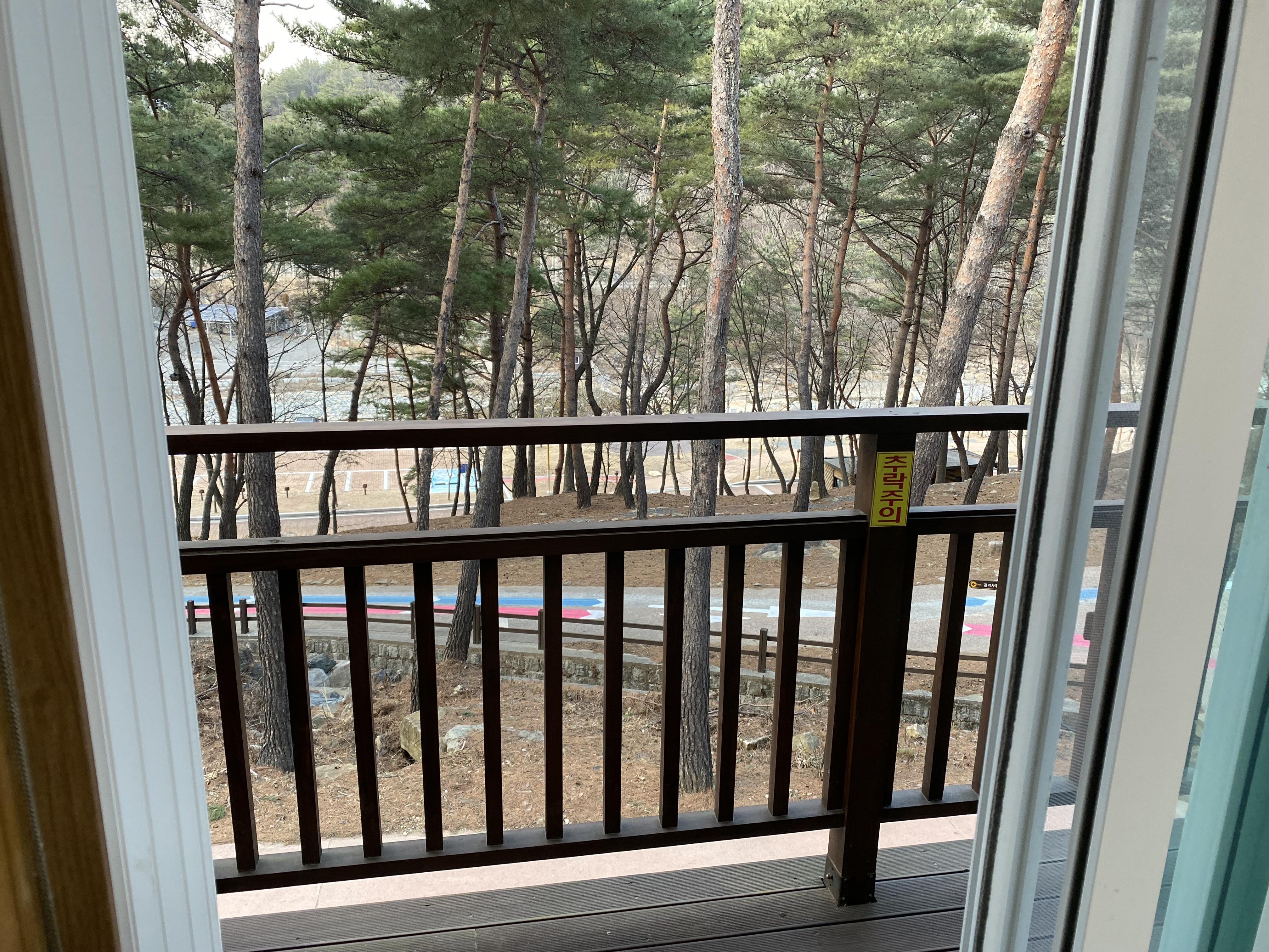 출입문 맞은편은 바로 산. 나무들로 가득합니다. 가끔 고양이들이 출몰합니다.