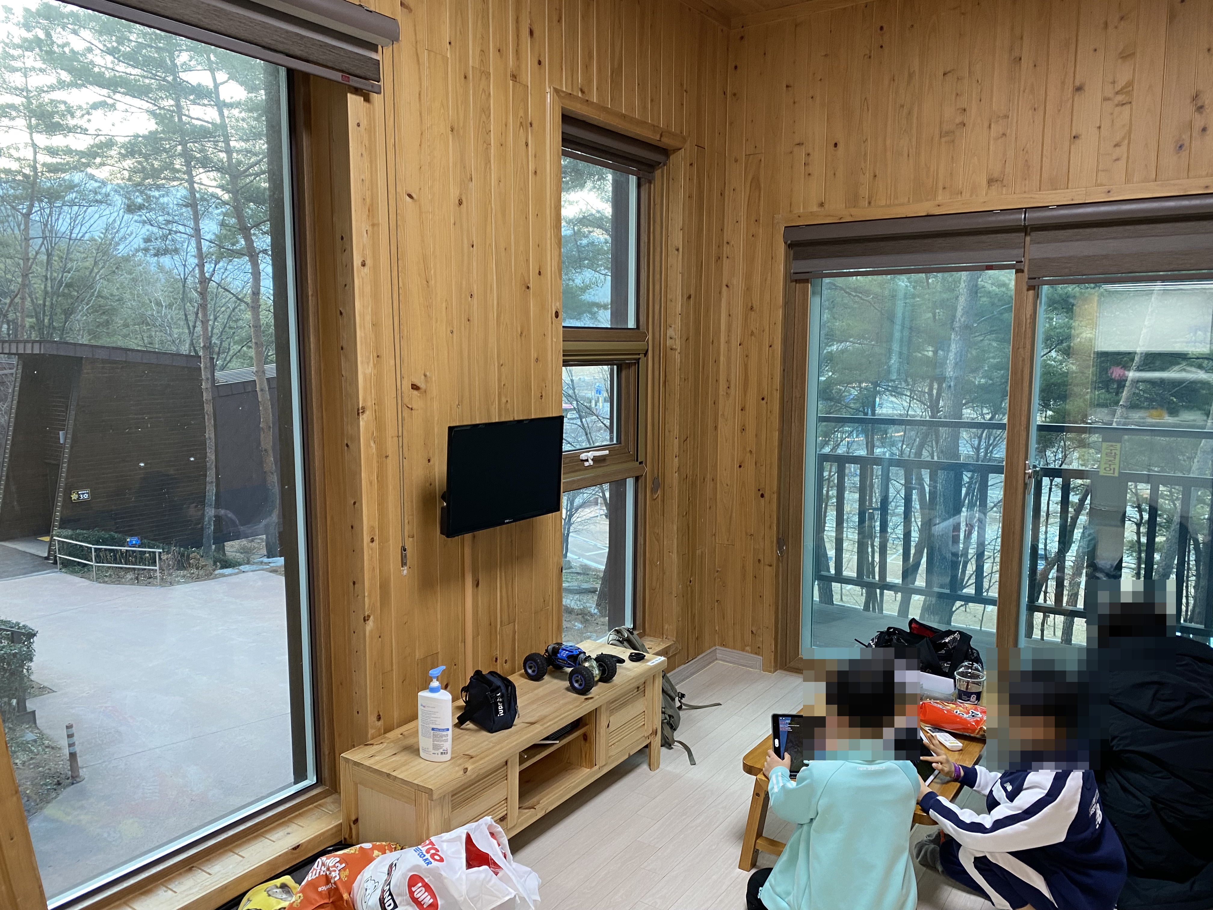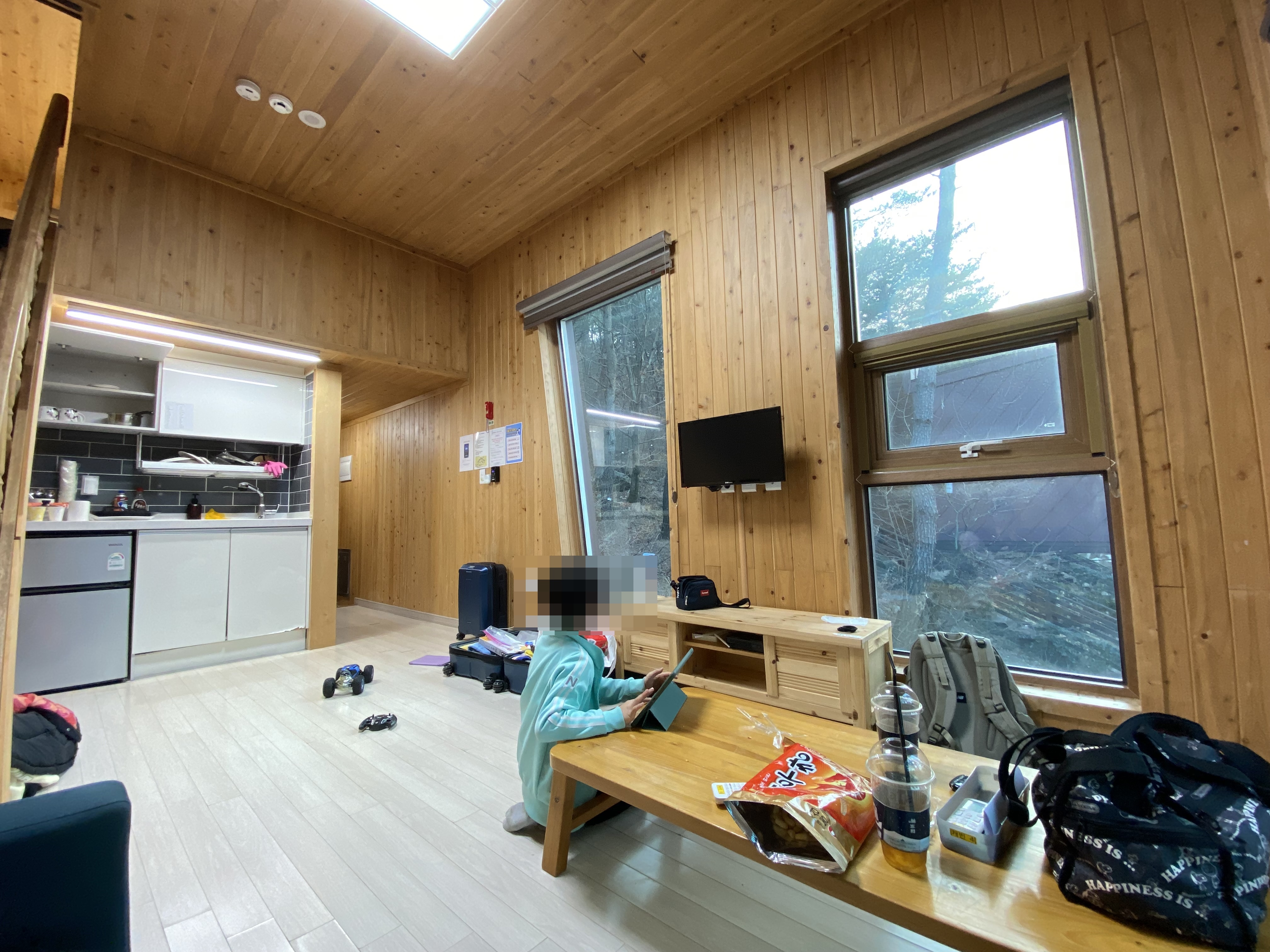 여기가 캐빈하우스 거실입니다. 낮은 소파와 테이블이 있습니다. 어린 아이들은 2층 방에서 떨어질 수도 있으니 밑에서 이불 깔고 자면 될 것 같습니다. 자연 속에서도 아이들의 스마트폰, 아이패드 사랑은 멈출 줄을 모릅니다.