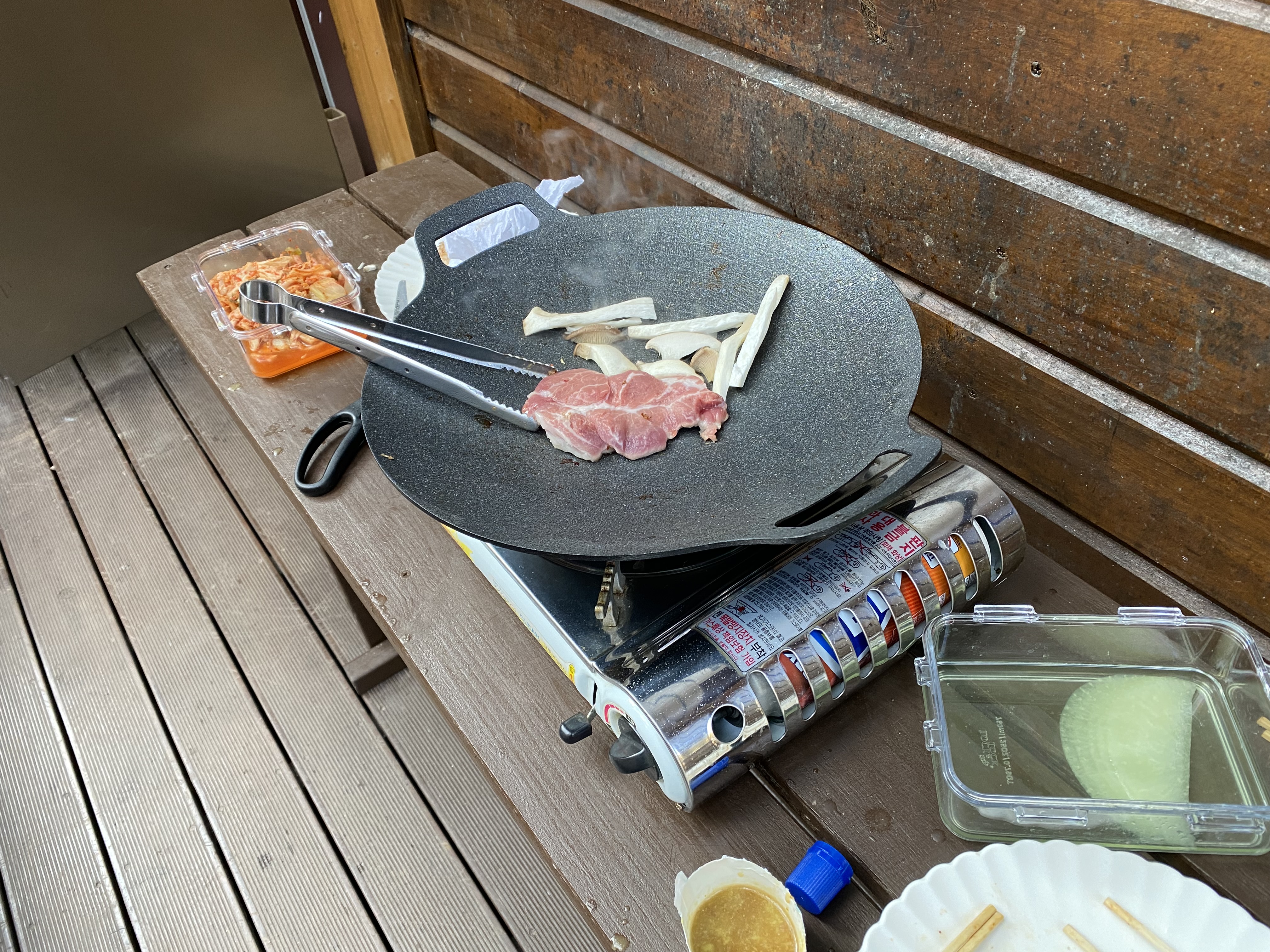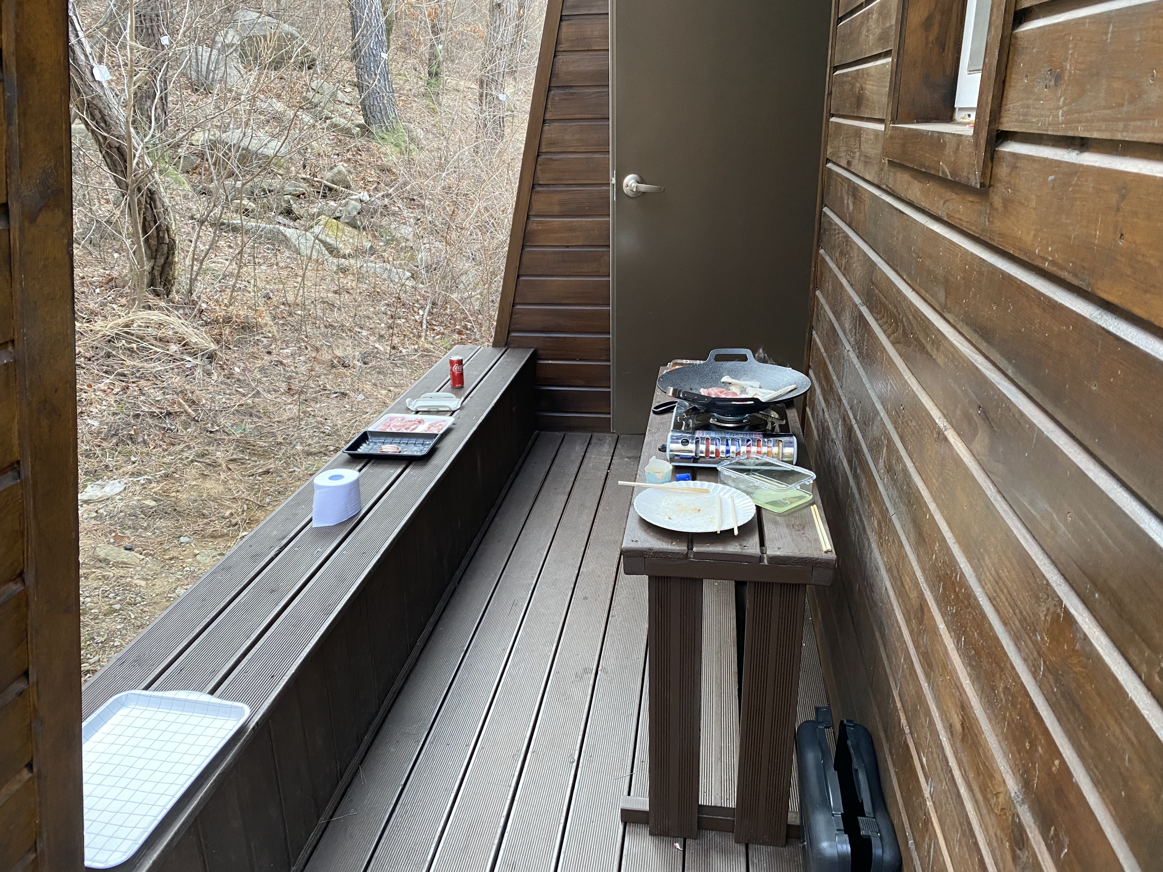 캐빈하우스에서 유일하게 고기를 구워 먹을 수 있는 곳은 바로 여기. 협소한 공간이지만 고기를 구워 먹기에는 크게 무리가 없었습니다. 캐빈하우스 실내나 발코니에서는 고기를 구워 먹으면 안 된다고 합니다. 참고하세요. 혹시 이러한 정책이 바뀔지도 모르니 버너를 사용하기 전에 한번 더 알아보고 사용하시기 바랍니다. 버너는 몰라도 숯이나 장작은 사용불가입니다. 뒤에 바로 산이기 때문에 산불 조심 또 조심.