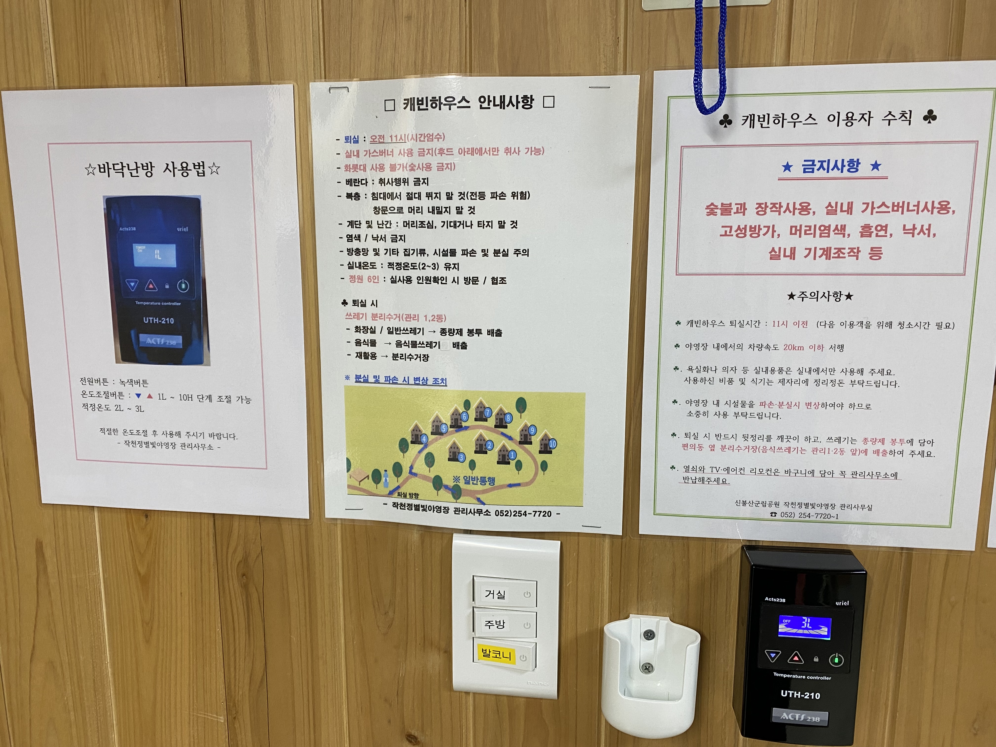나름 추운 날이었는데 난방이 잘돼서 따뜻하게 지낼 수 있었습니다. 보일러 사용법이나 자세한 캐빈하우스 이용 수칙은 위 사진을 참고하세요. 참고로 캐빈하우스 입실은 2시, 퇴실은 11시입니다.