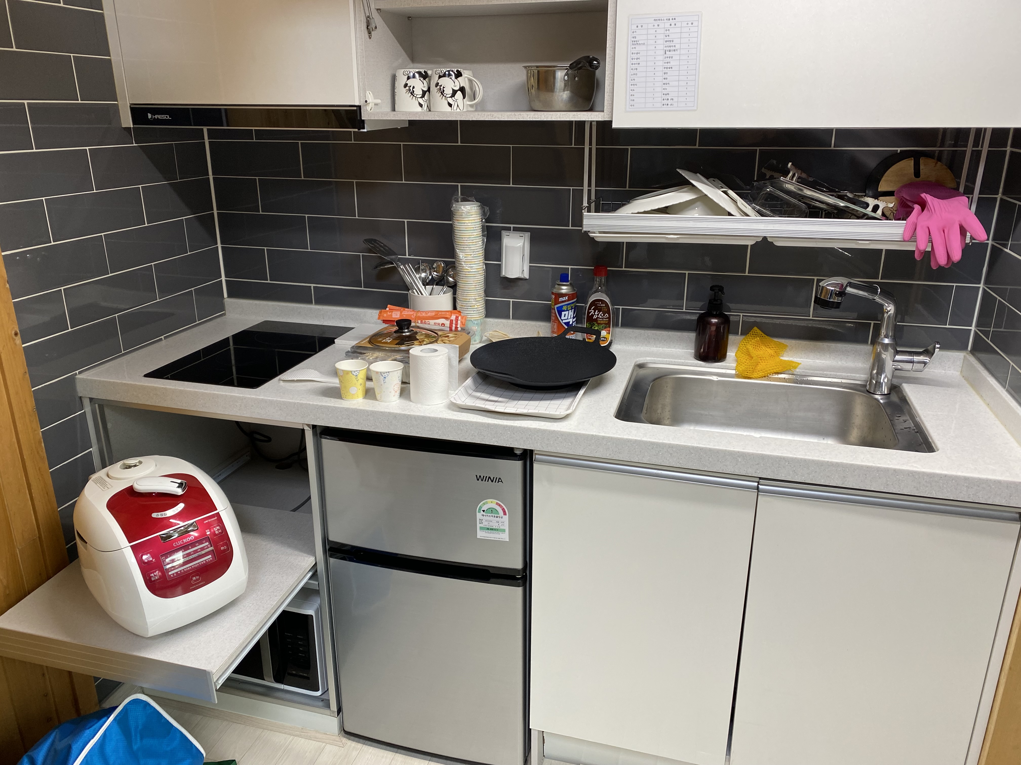 여기는 부엌. 있을 건 다 있습니다. 사실 야외에 놀러 와서 냉장고, 전자레인지만 있으면 괜찮다고 생각합니다. 가끔 전자렌지가 없는 곳이 있는데 정말 답답하지요. 커피포트는 없었던 것 같습니다.