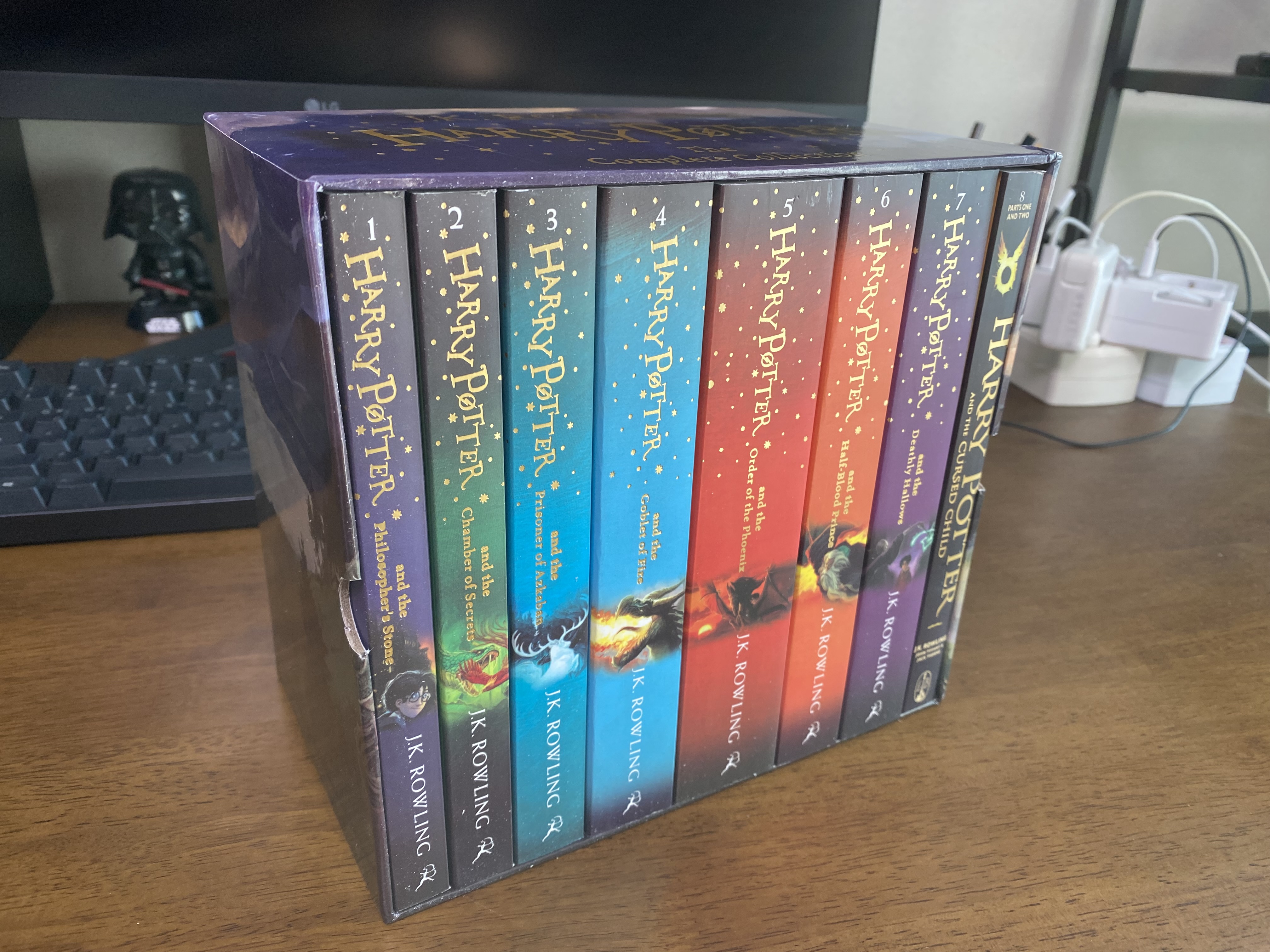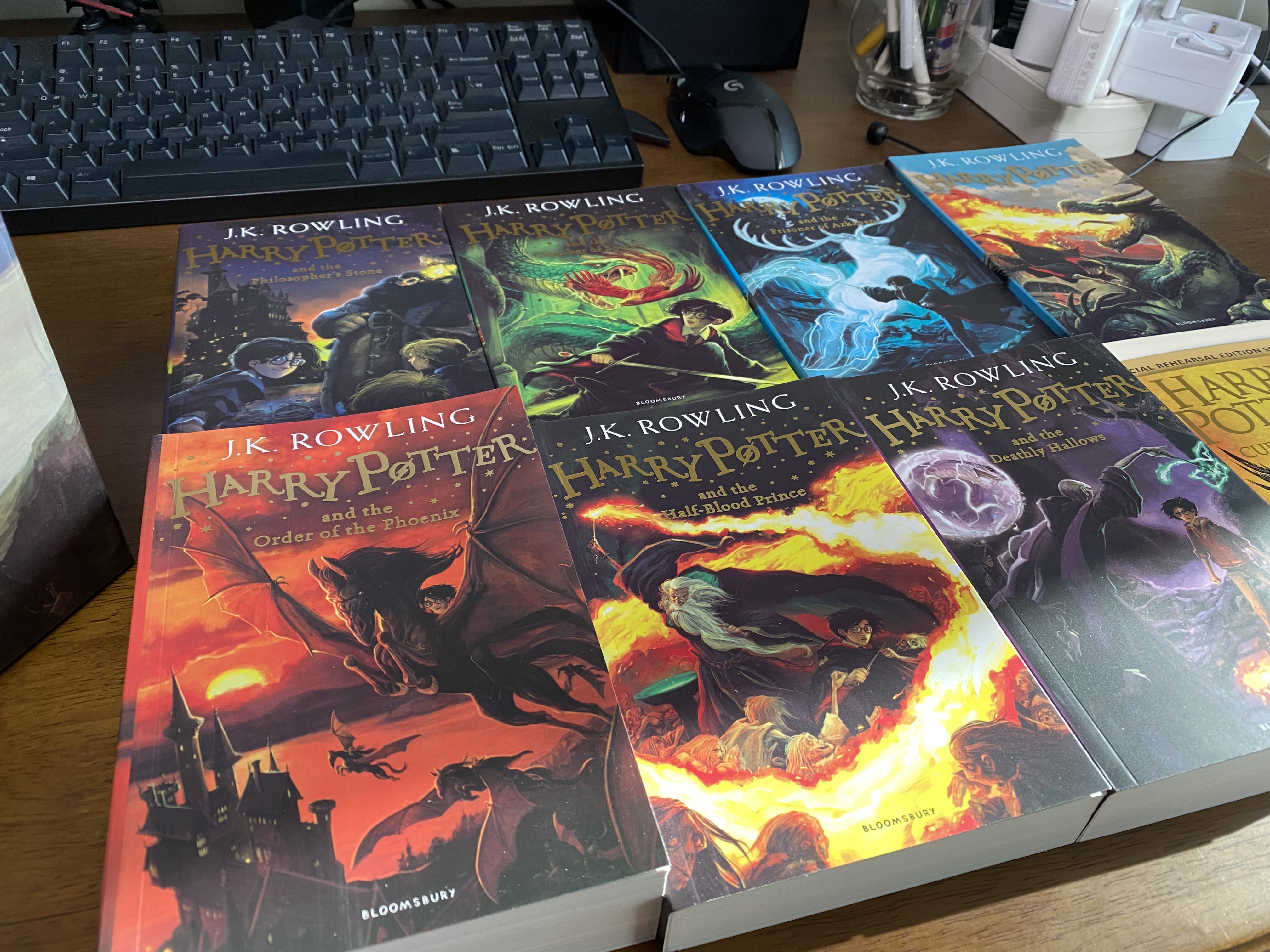 해리포터 시리즈 완결 7권과 연극 대본이 포함된 세트입니다. 해리포터 시리즈 영어 원서도 영국판, 미국판 2가지가 있는데 제가 구매한 제품은 읽다 보니 영국판인 것 같네요. 영국판에서는 center를 centre라고 적는 등 단어에서 약간의 차이가 있는데 좀 더 편안하게 읽으려면 미국판이 나을 것 같습니다. 사실 별 차이가 없어서 그냥 저렴한 걸로 구매하면 되고 가격이 같으면 그냥 미국판으로 구매하셔서 편안하게 읽으시기 바랍니다. 해리포터 덕후라 저자 J.K. 롤링이 적은 그대로 읽고 싶다면 영국판을 사야겠죠.