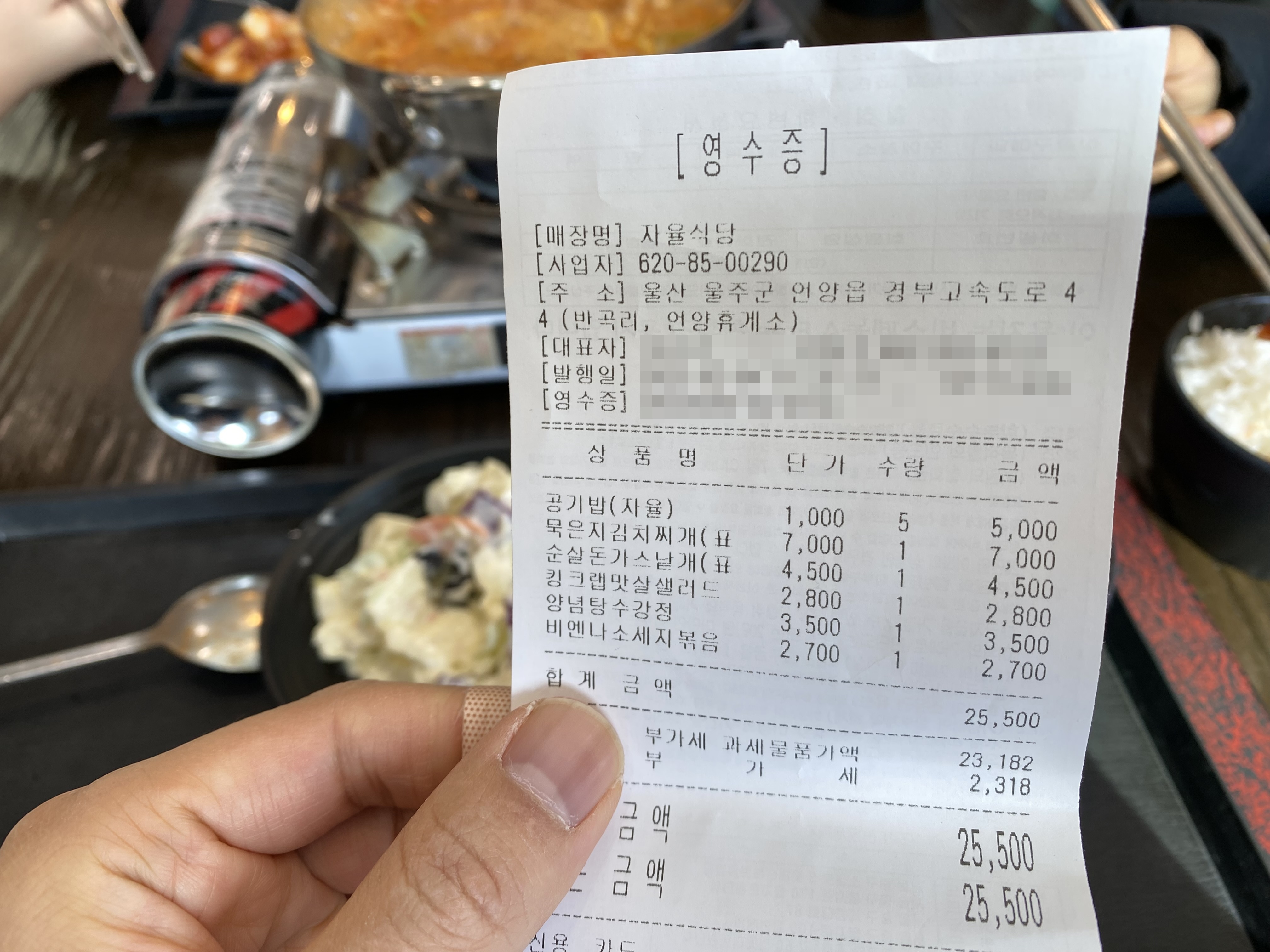 경부고속도로 서울방향 언양휴게소 자율식당. 5명이서 점심을 먹었는데 25,500원이면 괜찮은 가격이라 생각합니다. 다음에도 여기를 지나다 배가 고프면 먹을 생각입니다. 언양휴게소에 여기 말고도 다른 먹거리가 많으니 화장실 갈 때 한번 들러서 구경해 보는 것도 괜찮다 생각합니다. 휴게소 식당이 예전이랑 많이 달라진 것 같습니다. 일단 저는 대만족!