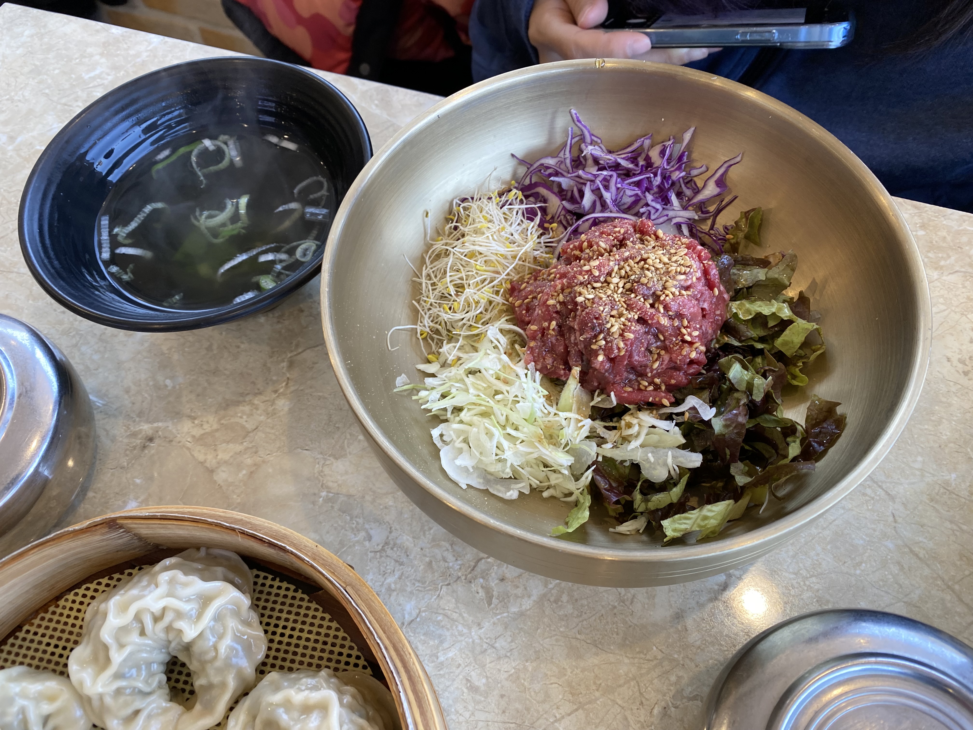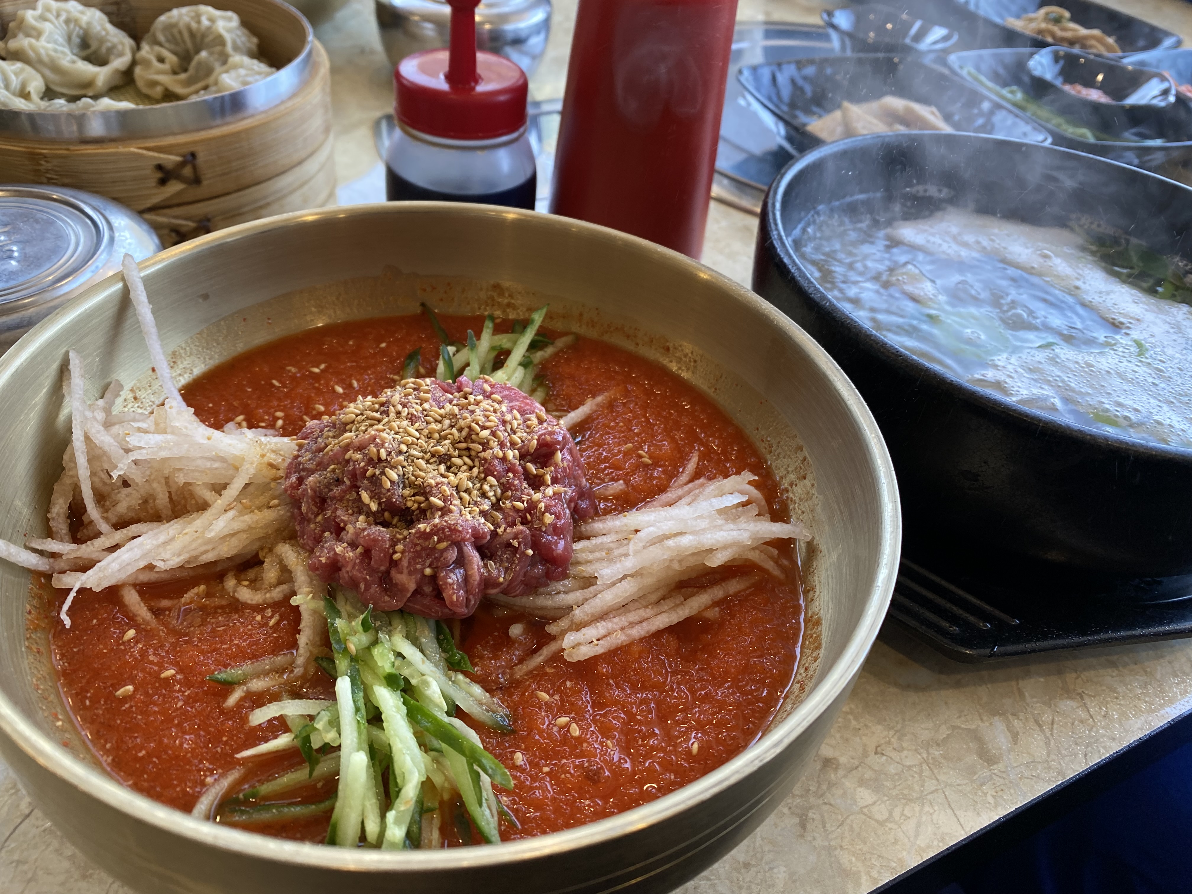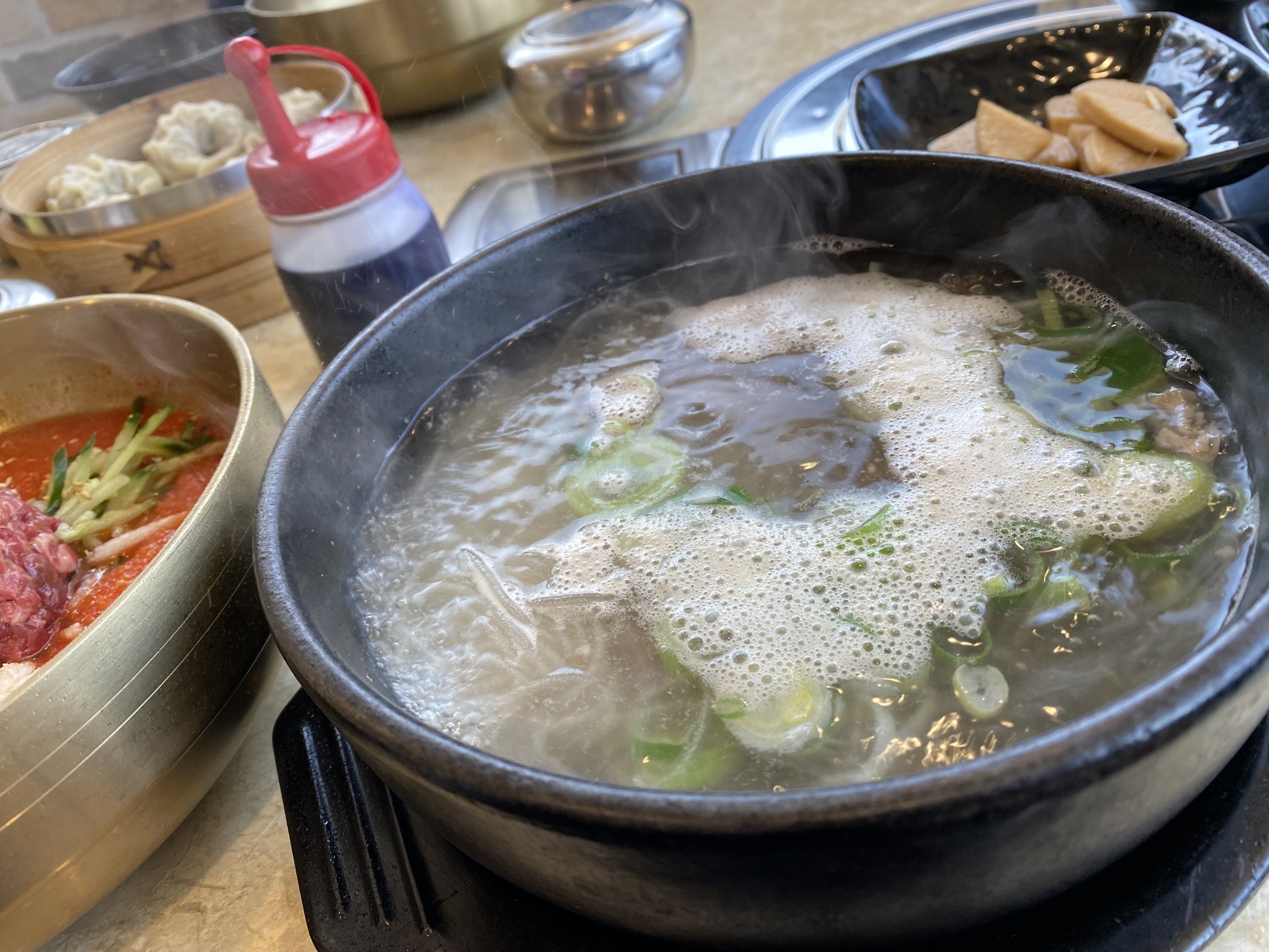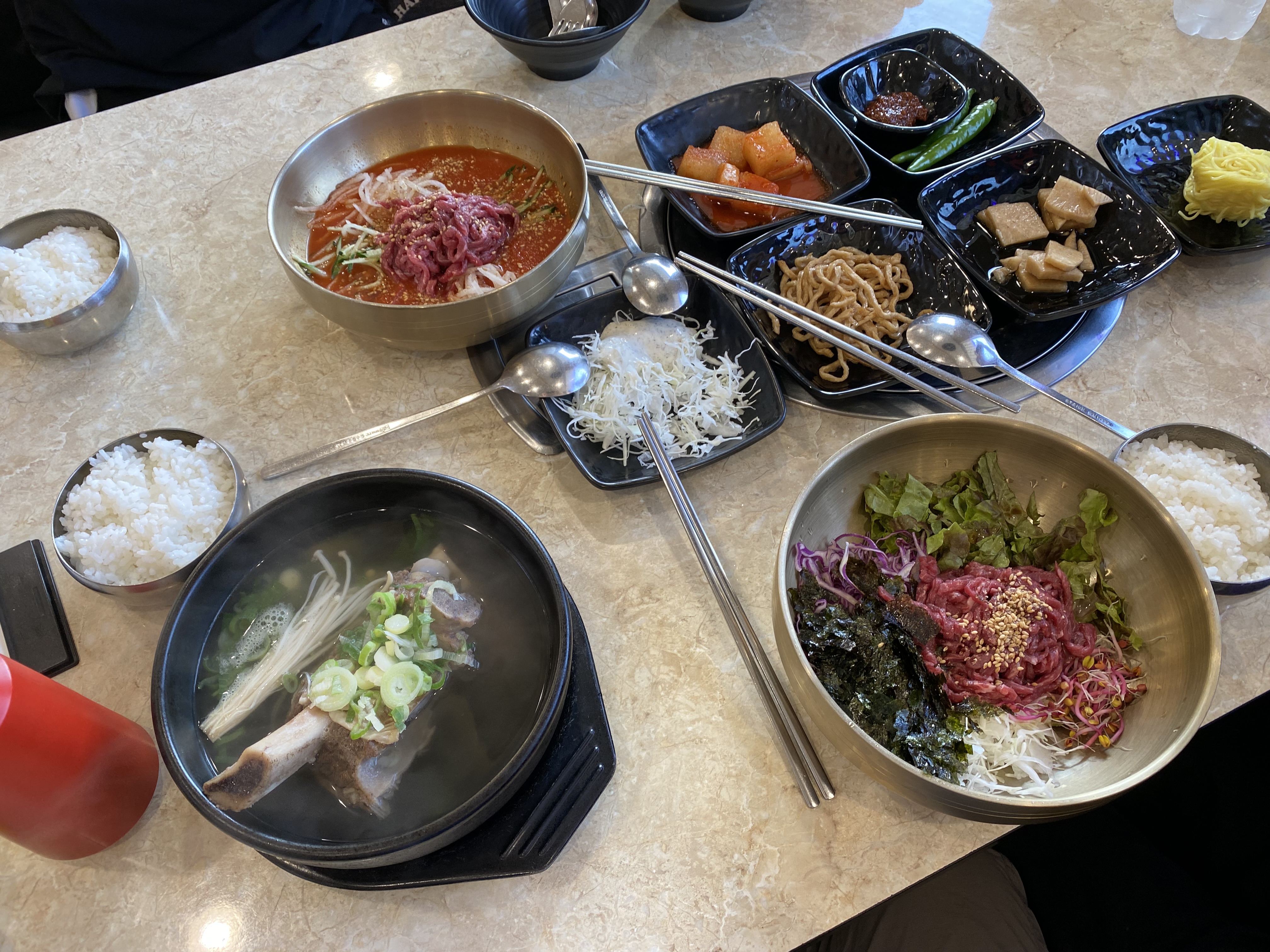 인플레이션 때문일까 가격이 조금씩 오른 것을 볼 수 있습니다. 골프채 갈비탕을 그대로인데 한우탕, 한우물회, 육회비빔밥에 얇은피만두까지 모두 1000원씩 인상된 가격을 볼 수 있었습니다. 세 번째 방문에서는 한우물회, 육회비빔밥, 한우탕 그리고 얇은피만두를 주문했습니다.