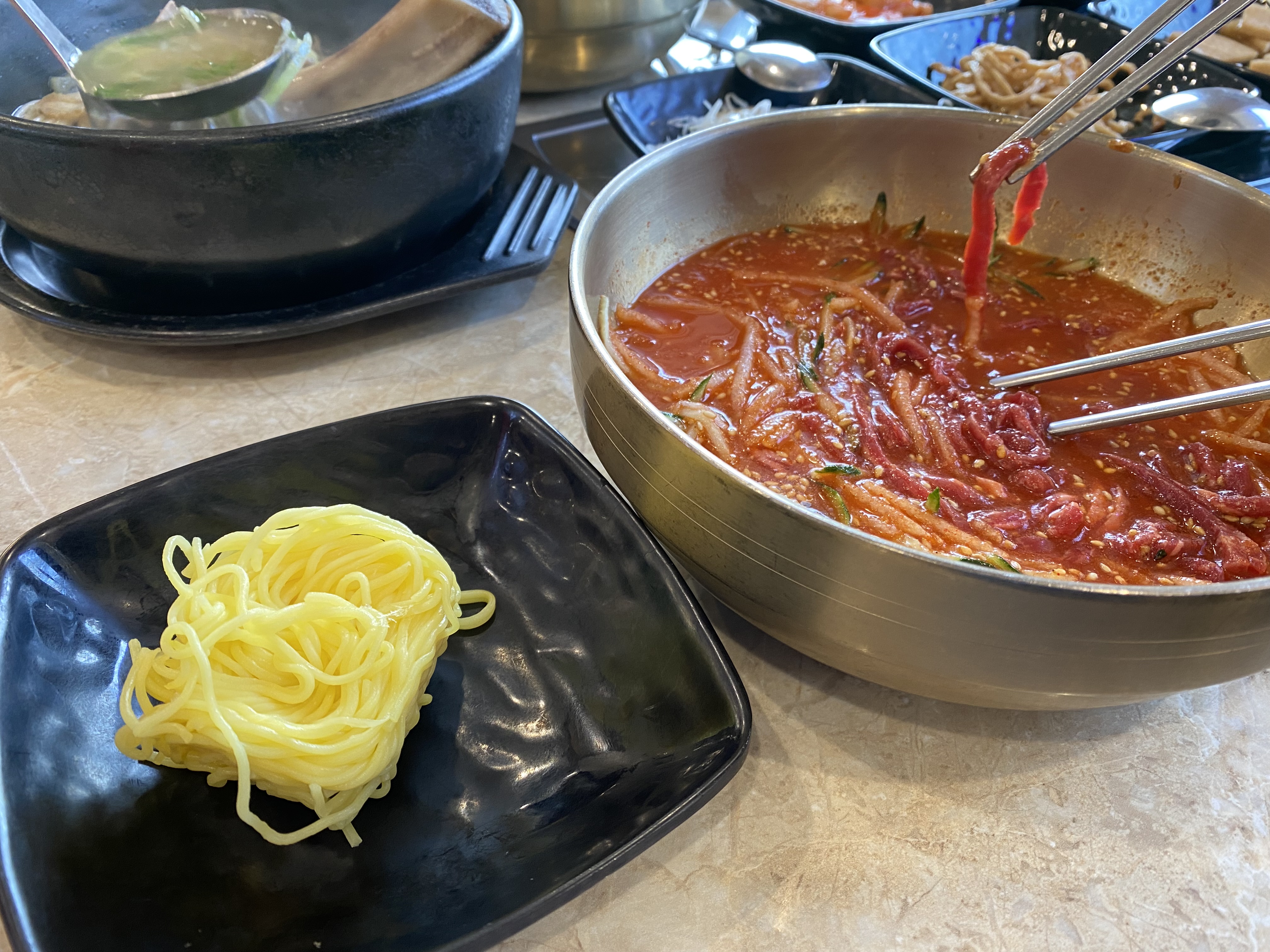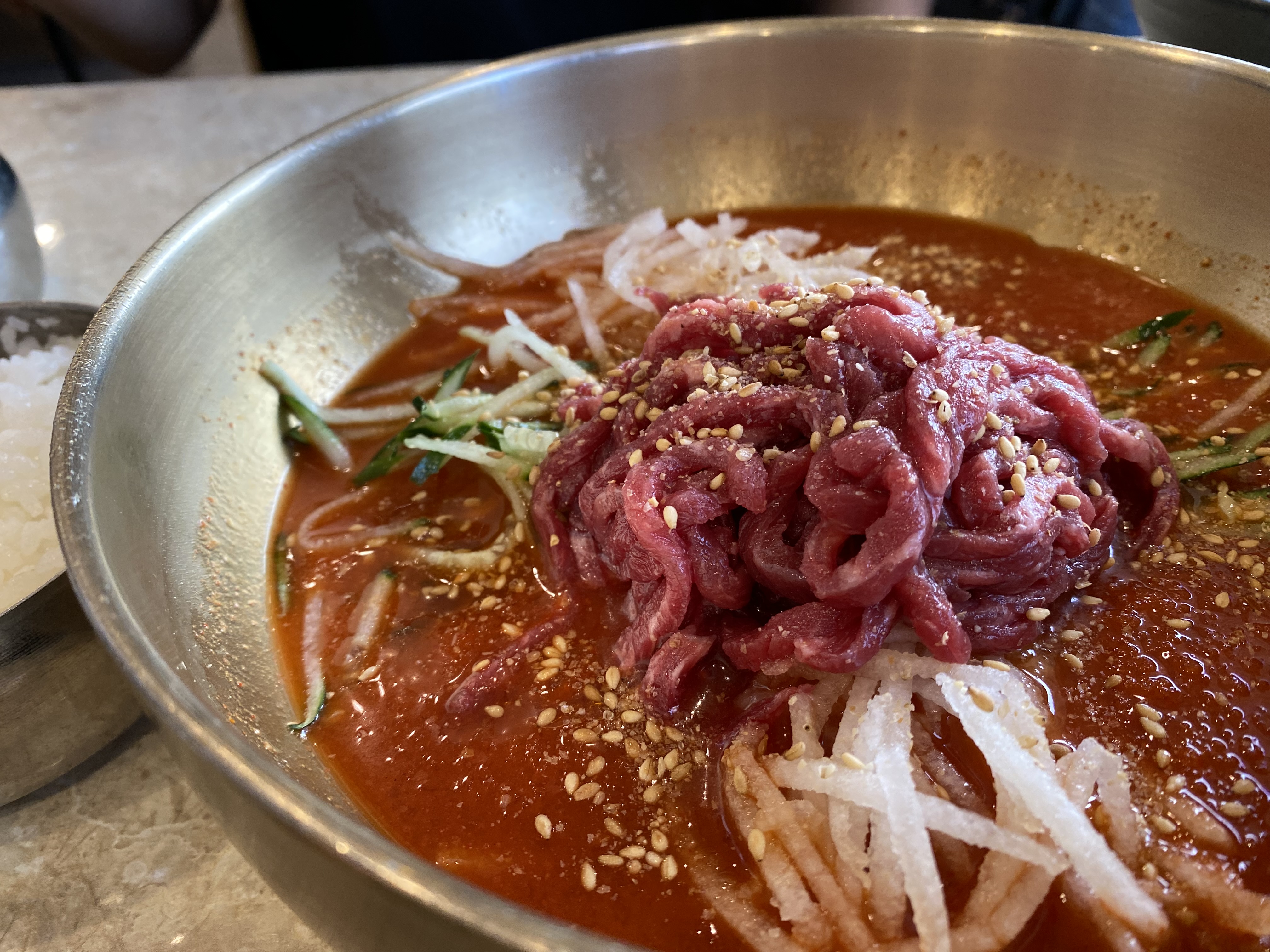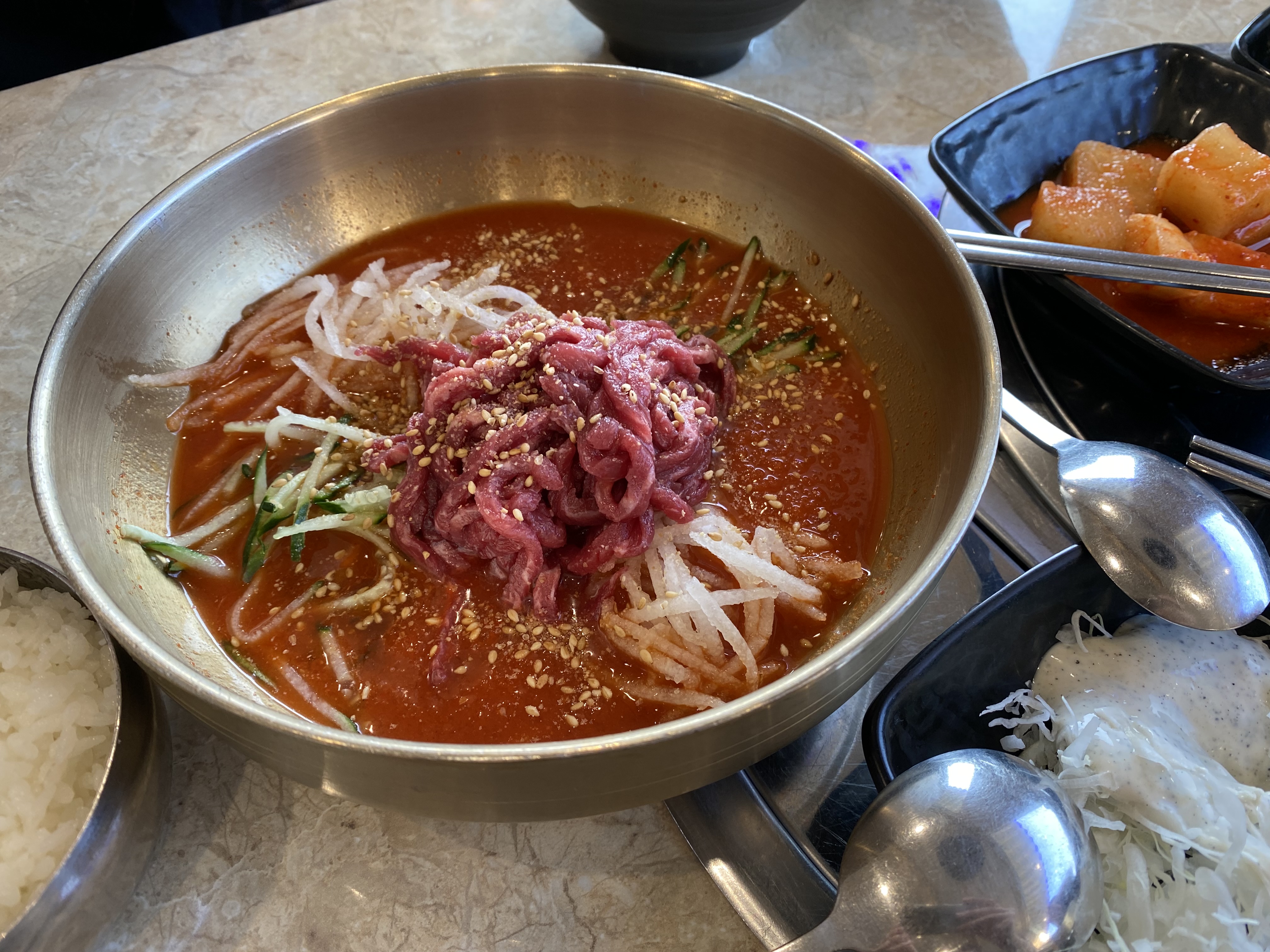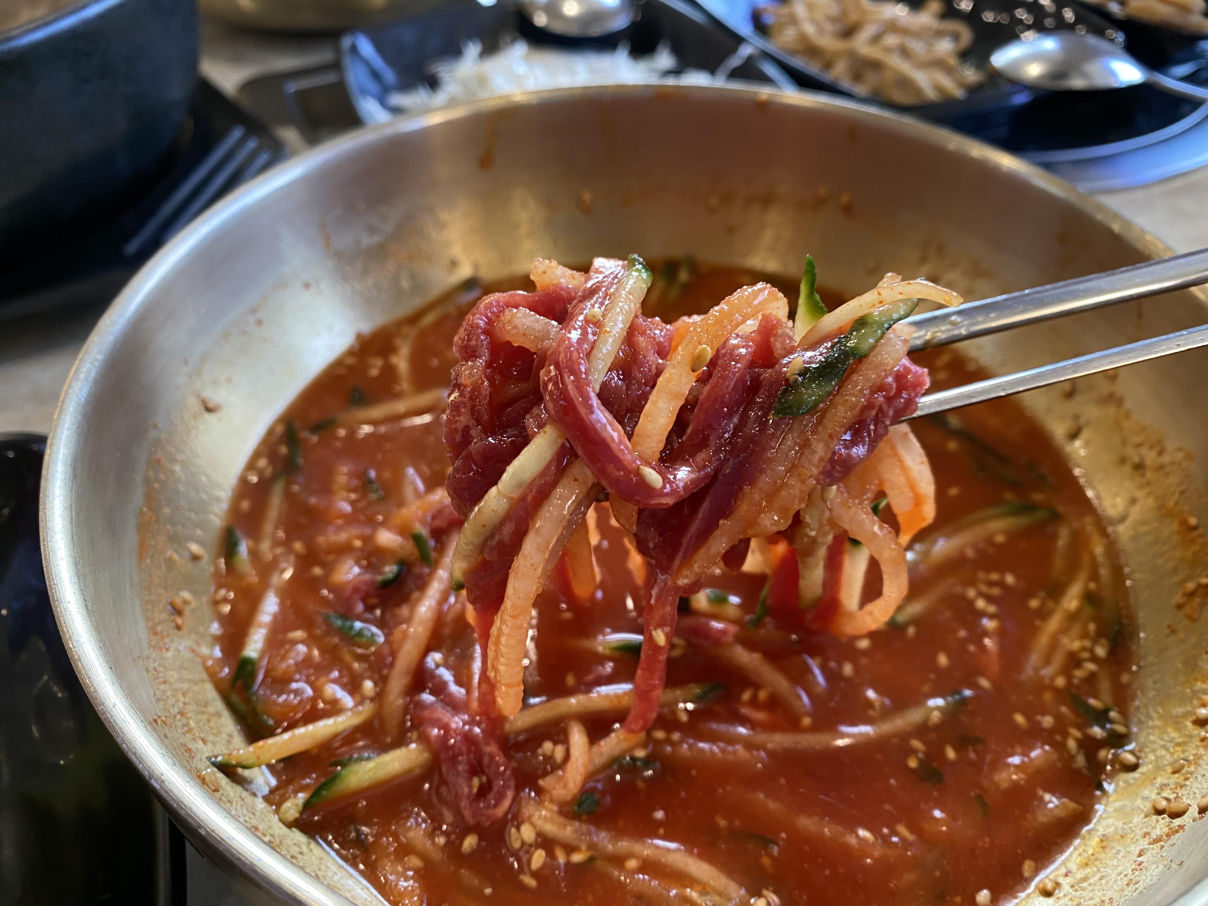 제가 어떻게 먹어야 할지 고민하고 있으니 여기 일하시는 분이 한우물회 먹는 법을 알려주셨습니다. 처음에는 살짝 비벼서 한우와 야채를 즐깁니다. 그리고 나서 면을 넣어먹고 마지막에 국물에 공깃밥을 말아먹으면 끝. 제가 해보니 이게 정석인 것 같습니다. 글을 쓰면서도 맛이 생각나네요.