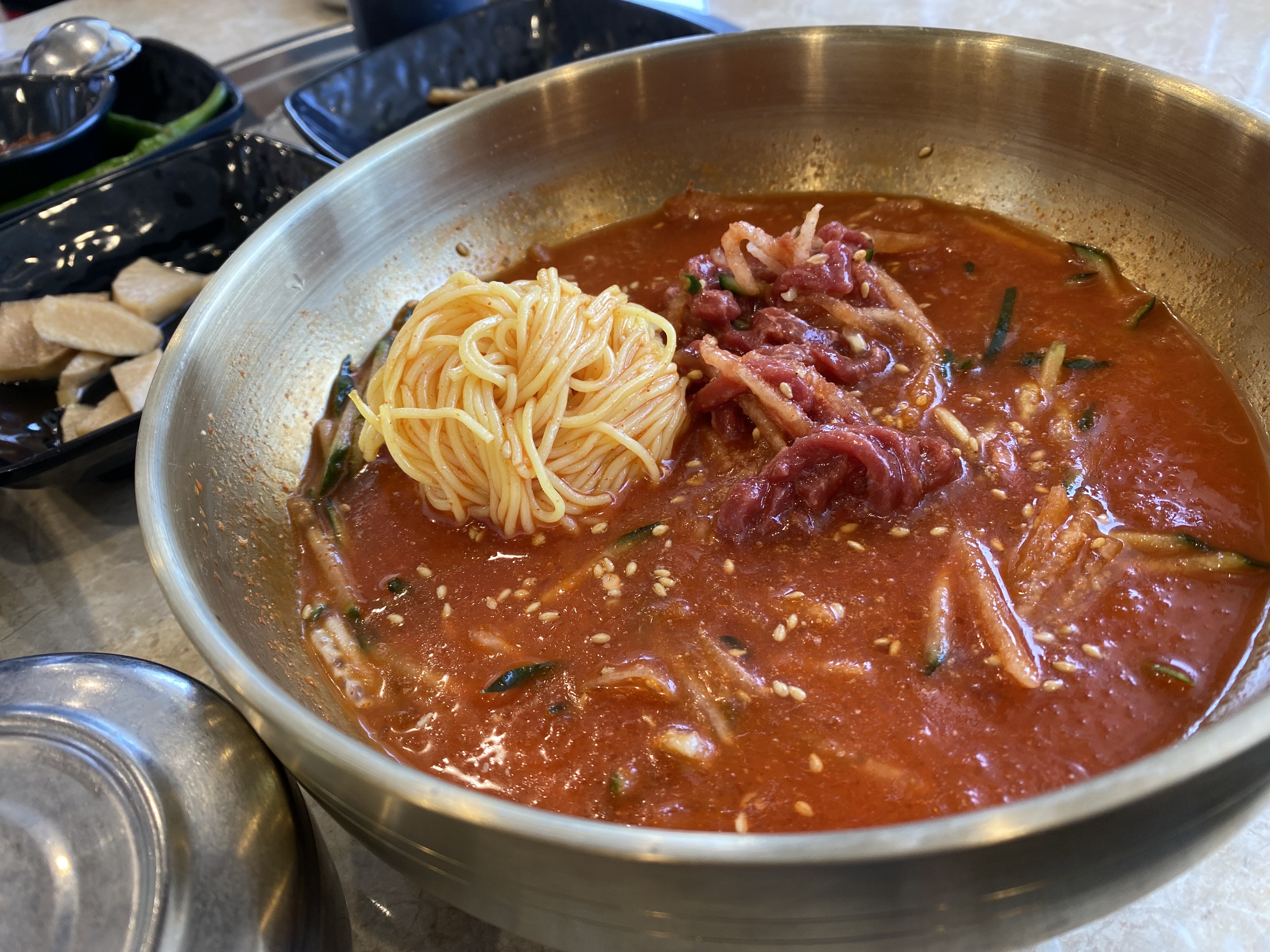 경주 우마왕 한우 물회의 모습입니다. 저는 이게 정말 맛있었습니다. 생선회가 들어간 물회를 그리 좋아하지 않아서 이것도 큰 기대를 하지 않았는데 역시 고기 아니 한우는 다르네요. 물회 특유의 소스맛과 한우가 어우러지니 거의 밥도둑 수준이네요. 흰쌀밥도 좋지만 육회비빔밥과 함께 먹으면 완벽한 담백짠 조합이 완성됩니다.