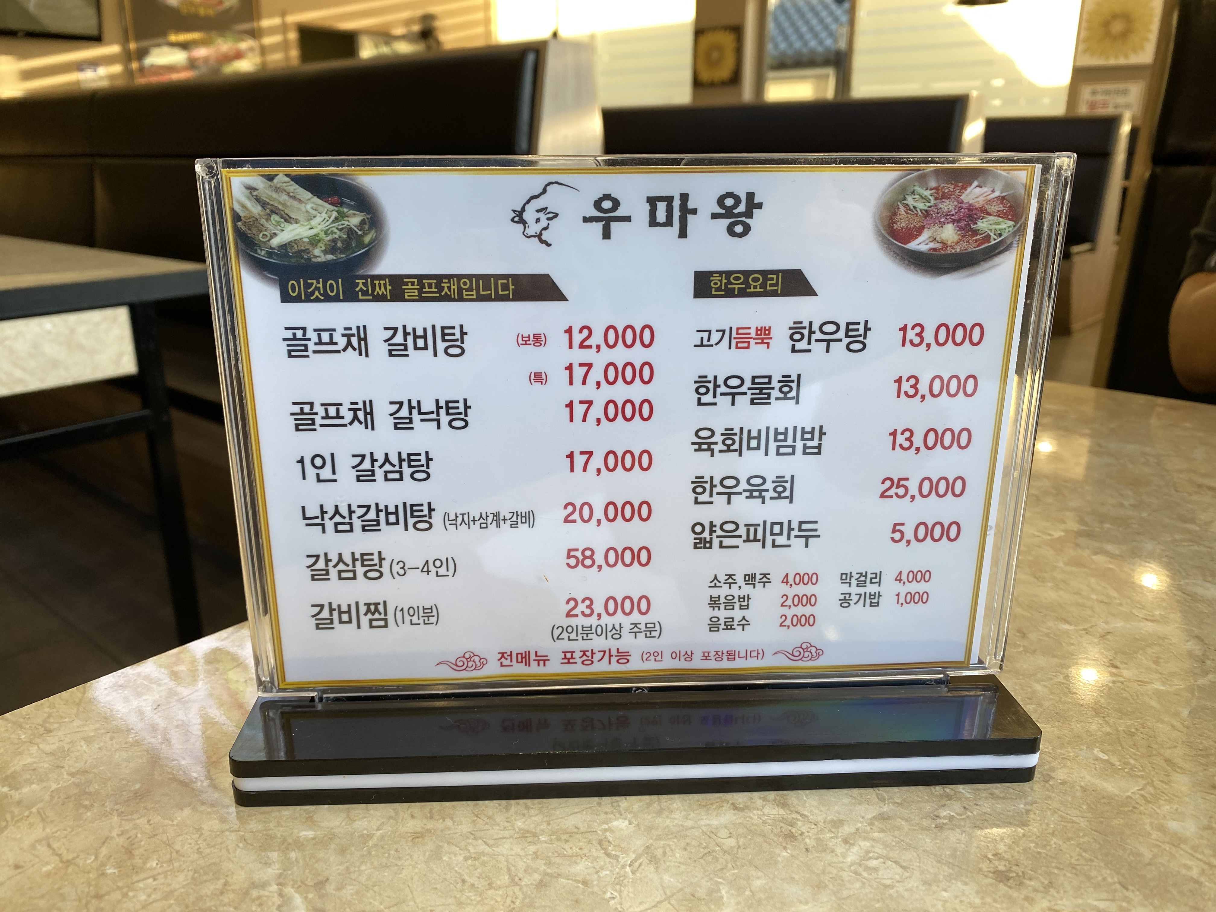 예전에 찾아 갔을 때는 메뉴 가격이 위와 같았습니다. 최근에는 1000원 정도 오른 메뉴가 좀 있었습니다. 최근 메뉴 사진은 밑에 있으니 그것도 참고하세요. 저는 여기서 골프채 갈비탕, 한우물회, 육회비빔밥을 주문했습니다. 공기밥도 따로 팔기 때문에 부족하면 더 주문해서 먹으면 됩니다. 1000원이면 괜찮지요. ㅎㅎ
