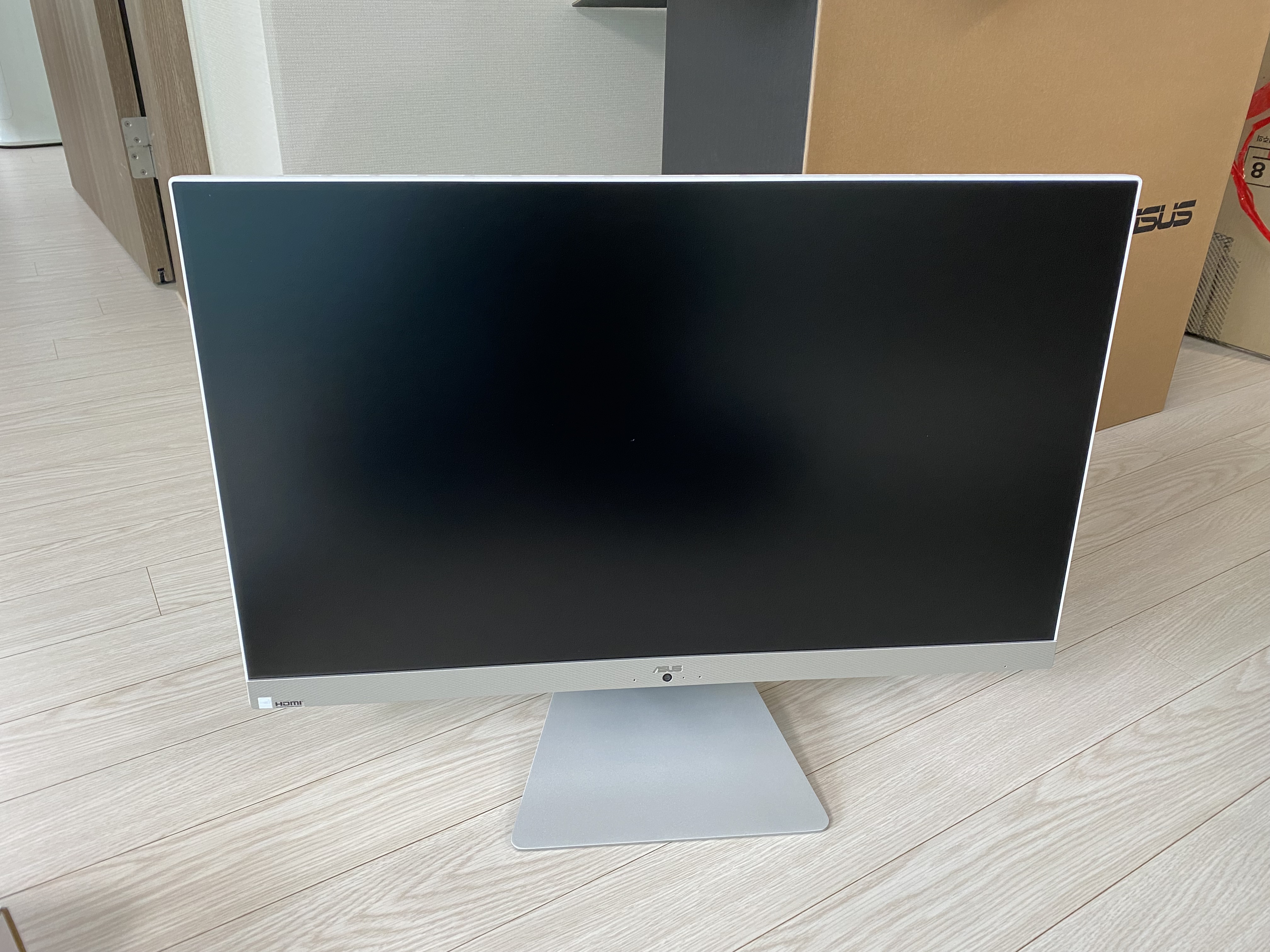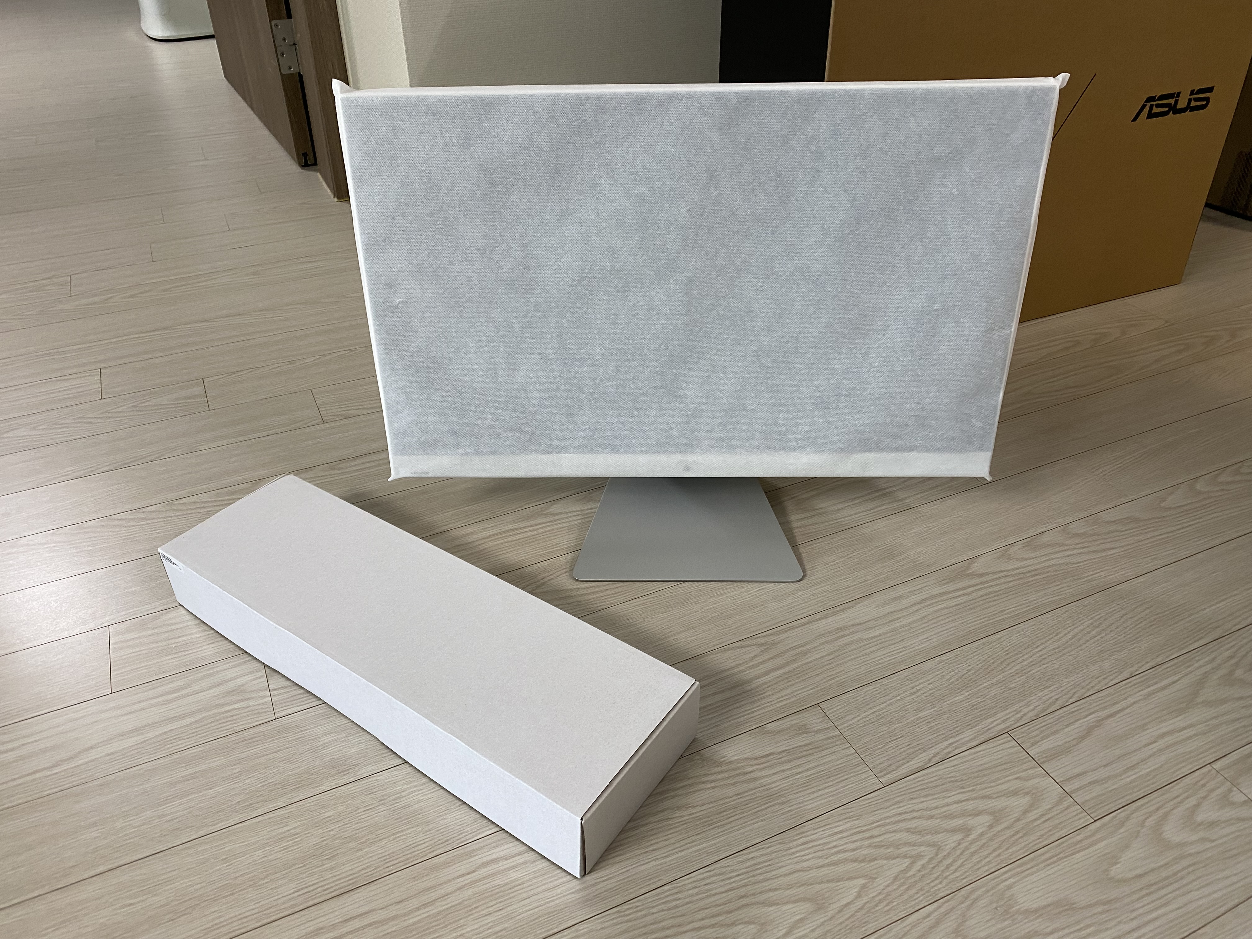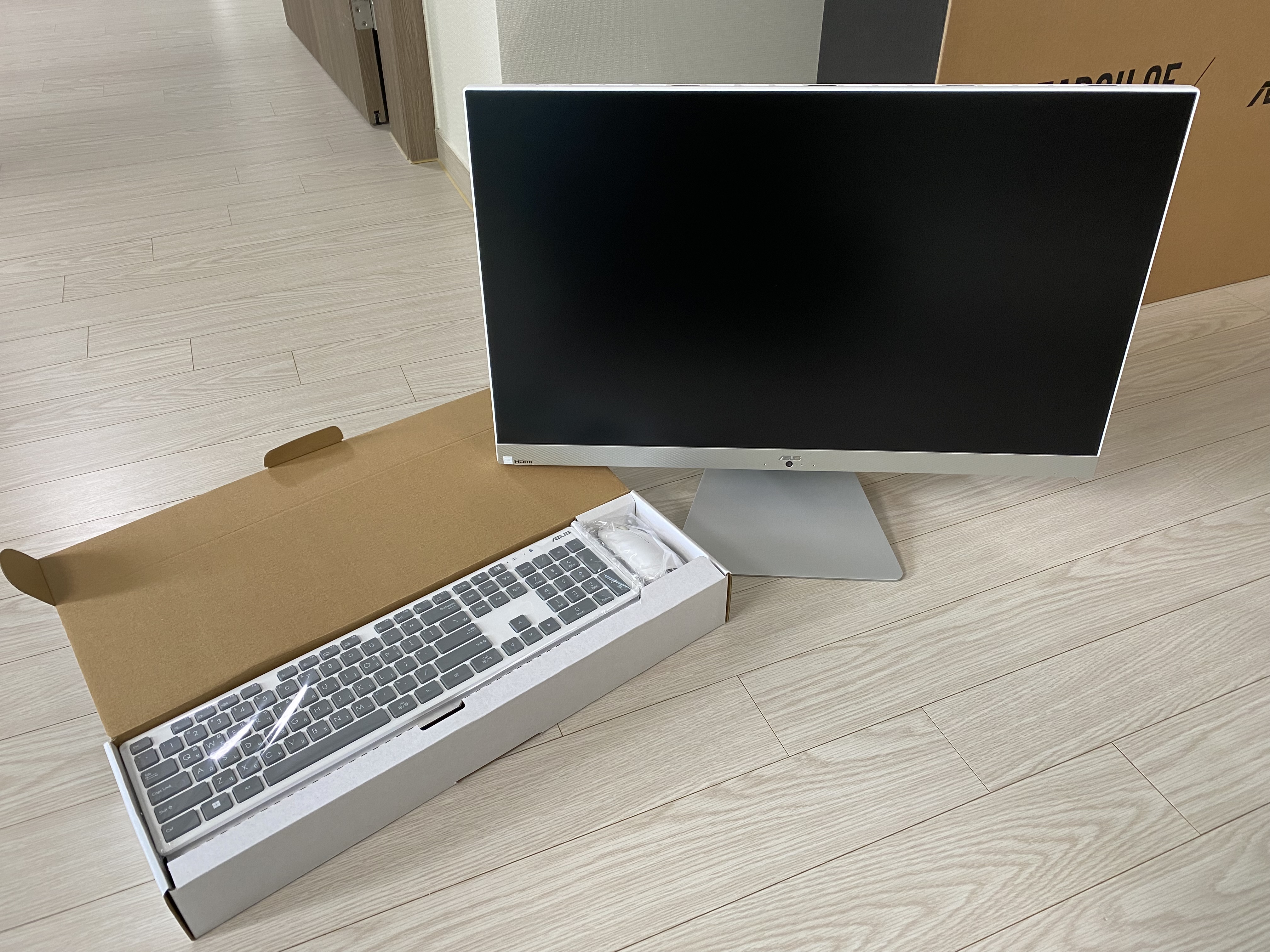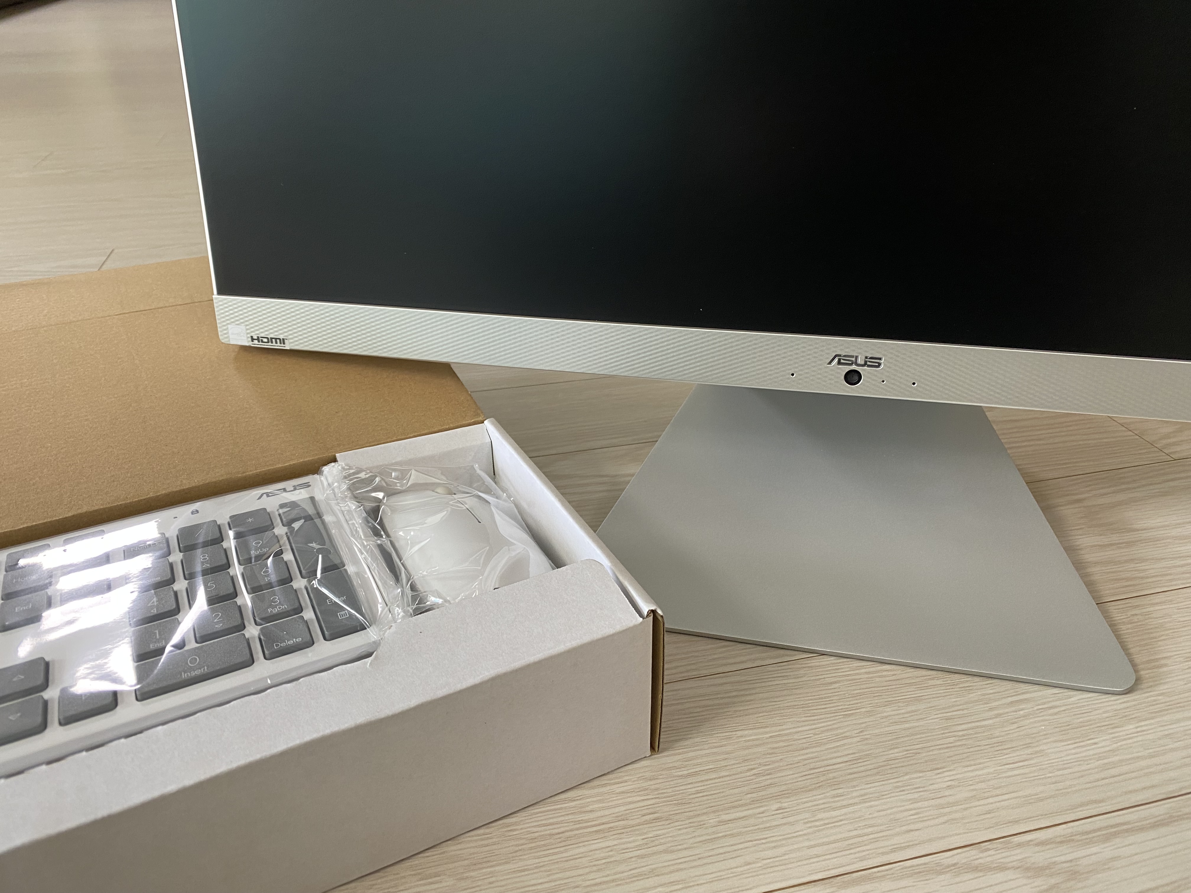 본체가 포함된 모니터, 키보드, 마우스가 들어있는 구성입니다. 모니터 밑 ASUS 로고 밑에 영상통화를 할 수 있는 캠이 보이며 옆에 작은 점들은 마이크가 아닐까 싶네요.