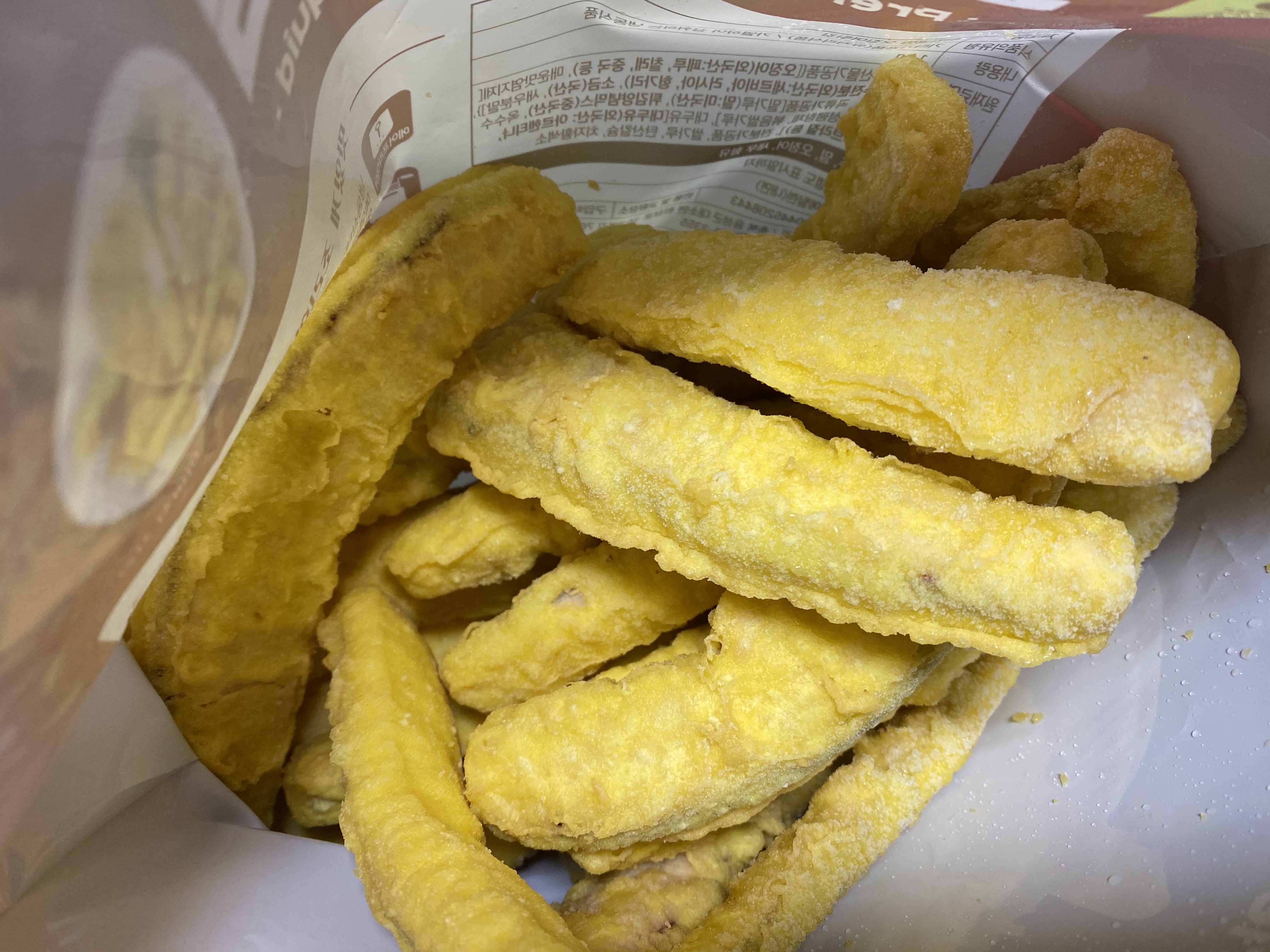 코스트코 사옹원 튀김공방 오징어튀김. 에어프라이어에 돌려서 먹으니 정말 맛있네요. 평소 분식점에서 사 먹는 오징어 튀김보다 안에 든 오징어가 커서 놀랐습니다. 우리나라 오징어는 아닌 것 같고 봉지에 있는 오징어 원산지를 보니 페루, 칠레, 중국 등이라고 나와있네요. 역시... 우리나라 오징어보다는 쫄깃한 맛은 떨어지지만 한입 베어 물었을 때 입속에 들어오는 오징어 양은 상당합니다. 호불호가 있을지 모르겠지만 저는 나름 괜찮았습니다. 오징어 튀김을 좋아하는 분이라면 한 번쯤 사 먹어보는 것도 괜찮을 것 같습니다.