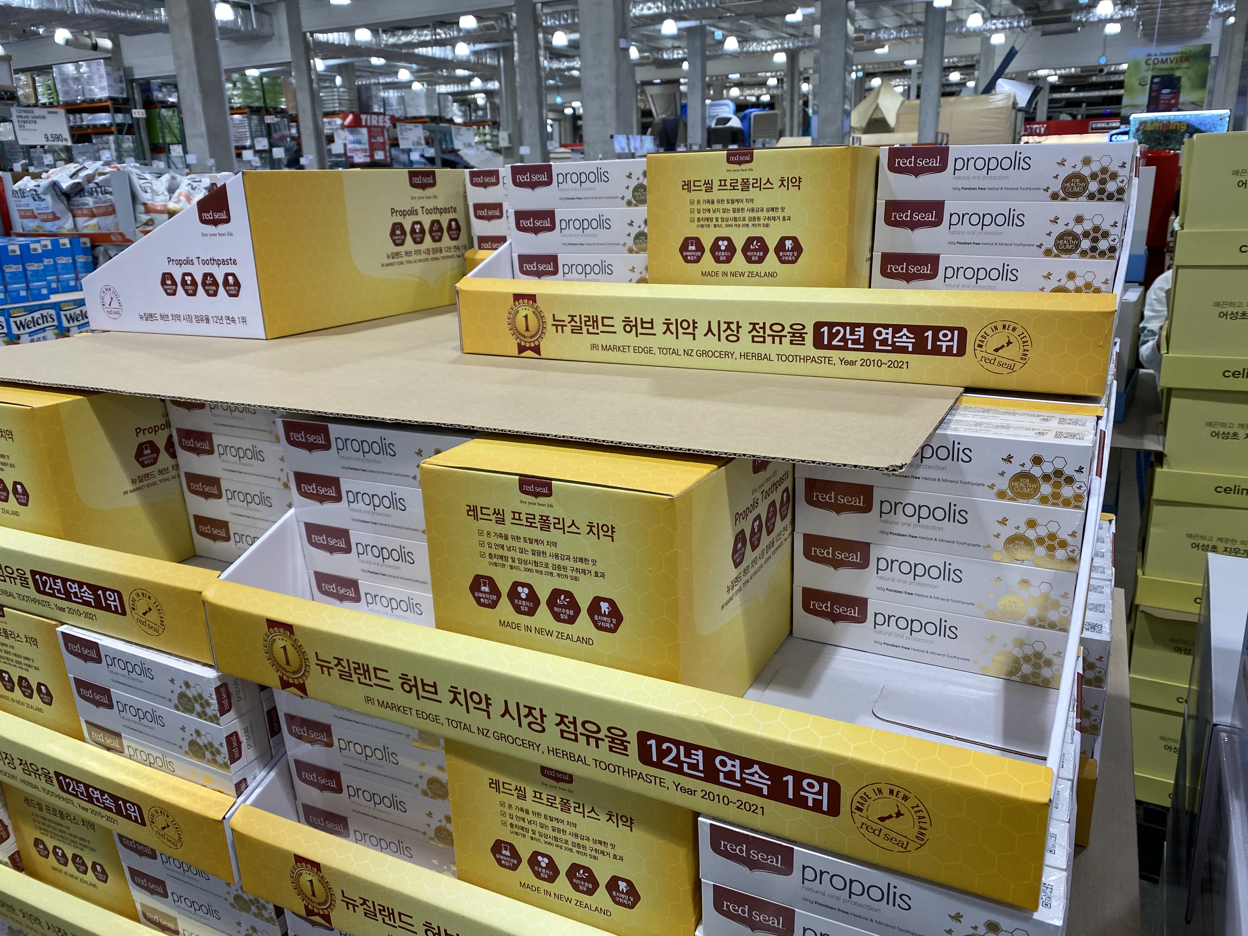 생필품은 코스트코에서 대량으로 구매를 하는 편입니다. 치약도 코스트코에서 사는데 콜게이트를 매번 사다가 이번에는 새로운 치약이 할인하기에 한번 카트에 담아 봤습니다. 'RED SEAL 레드씰 프로폴리스 치약'으로 박스를 보니 뉴질랜드 허브 치약 시장 점유율 12년 연속 1위라고 광고를 하고 있네요.
