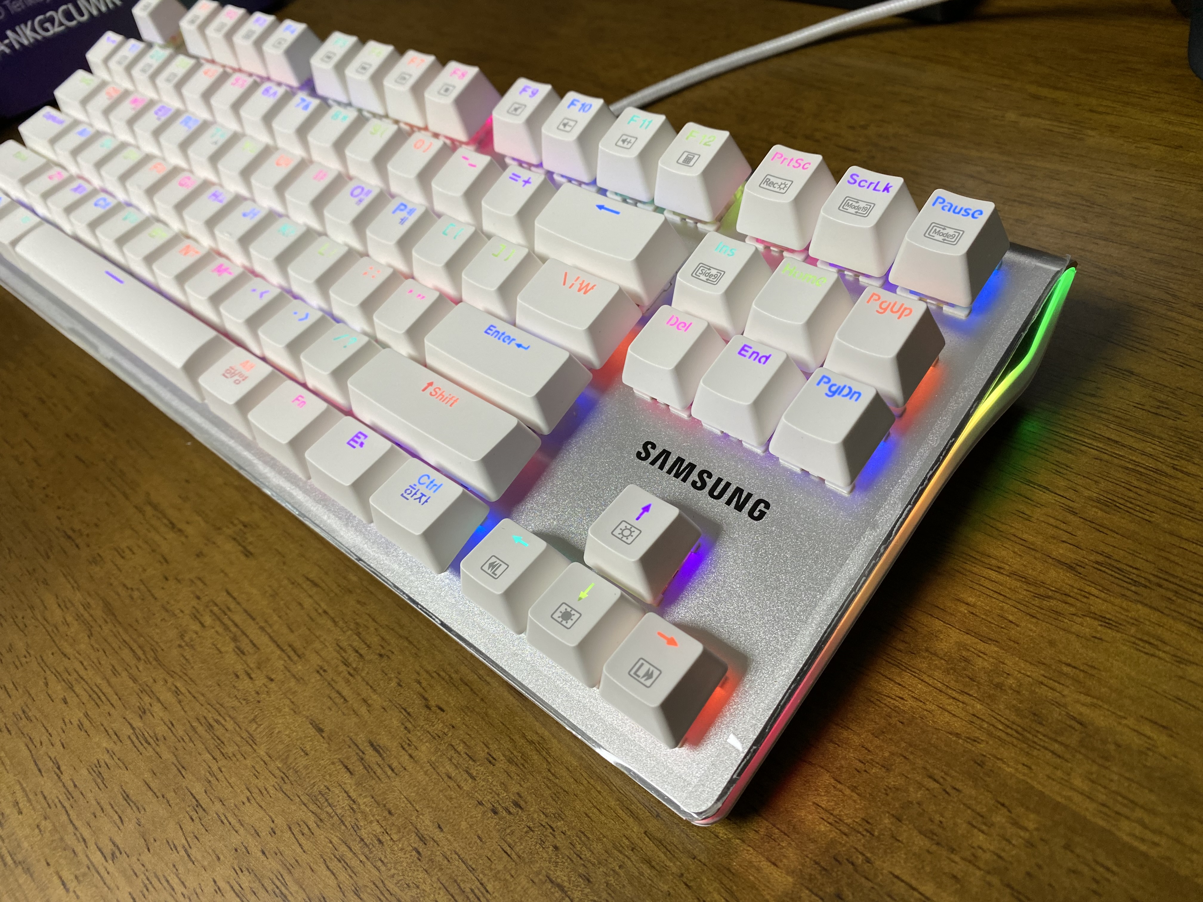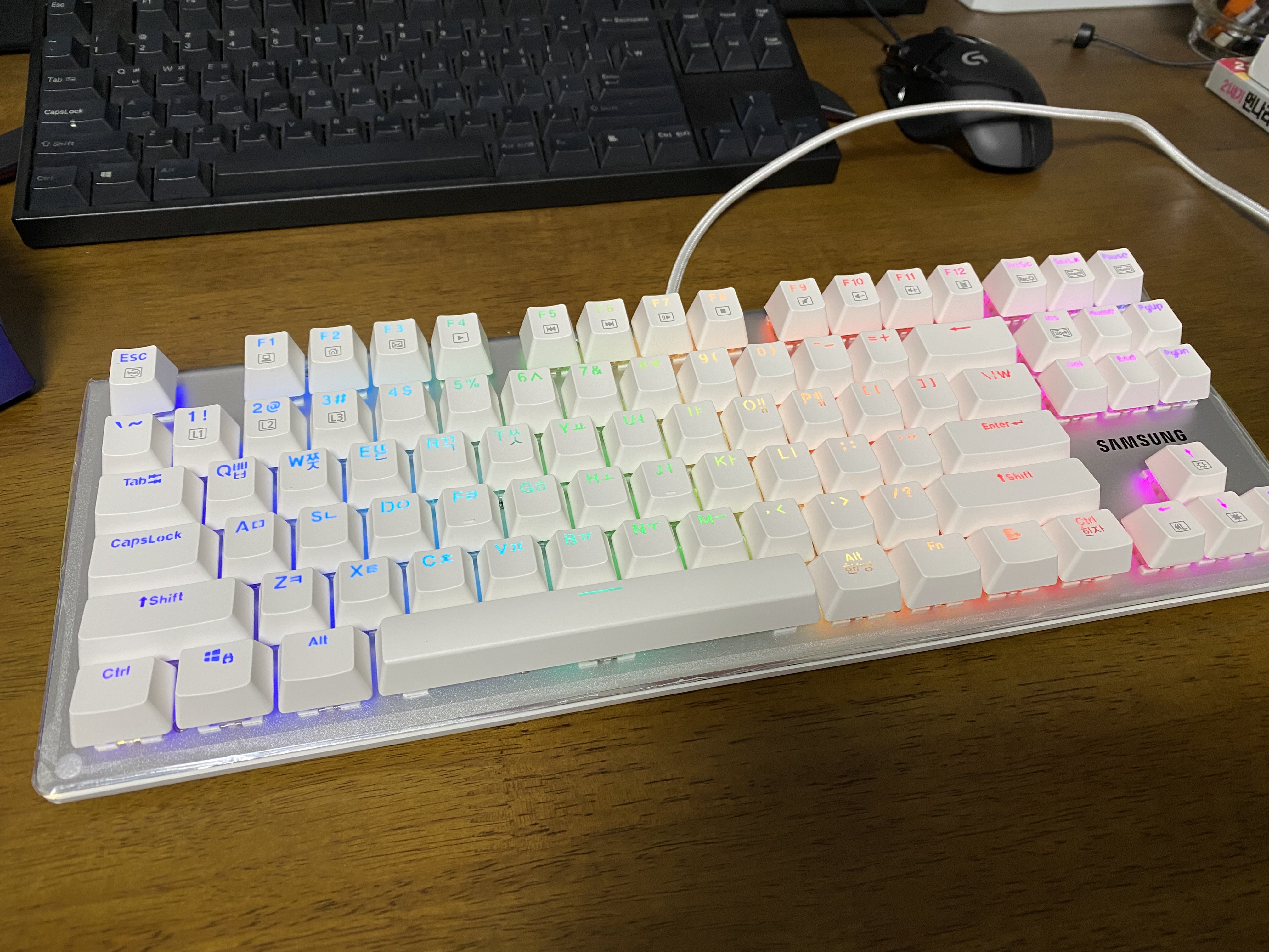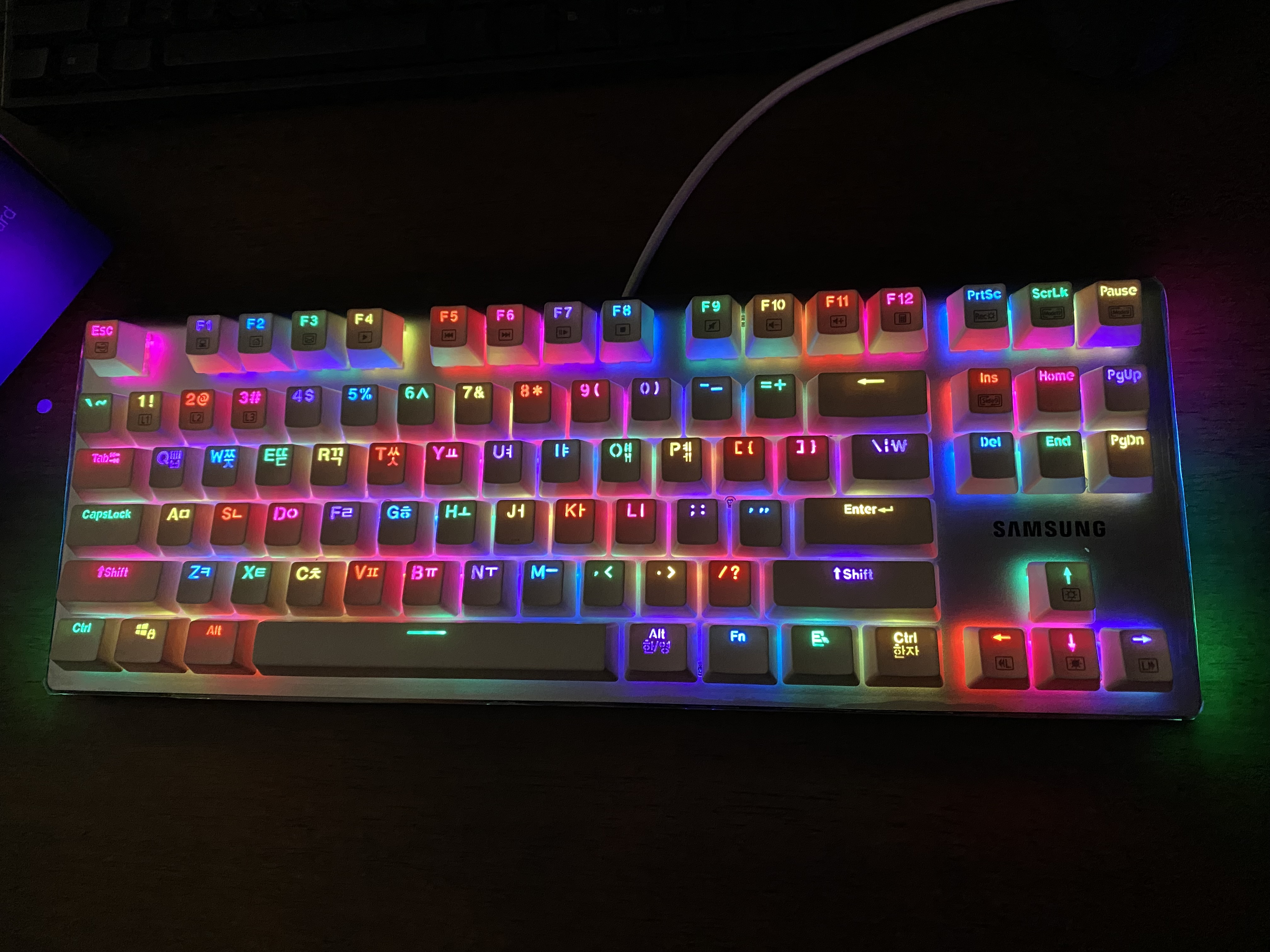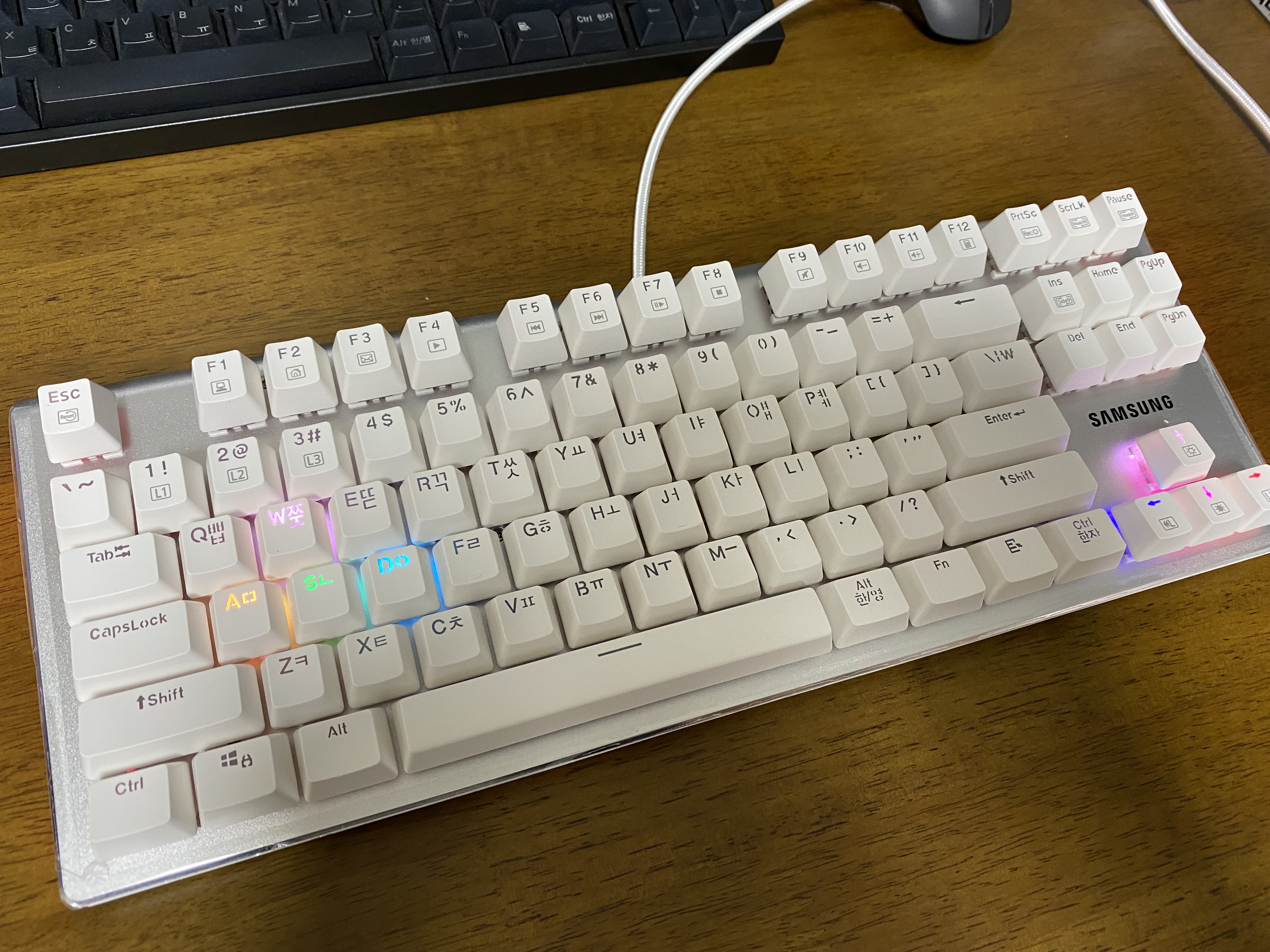 삼성전자 유선 기계식키보드 SPA-NKG2CUWR에 전원을 연결한 모습입니다. LED가 정말 화려하네요.