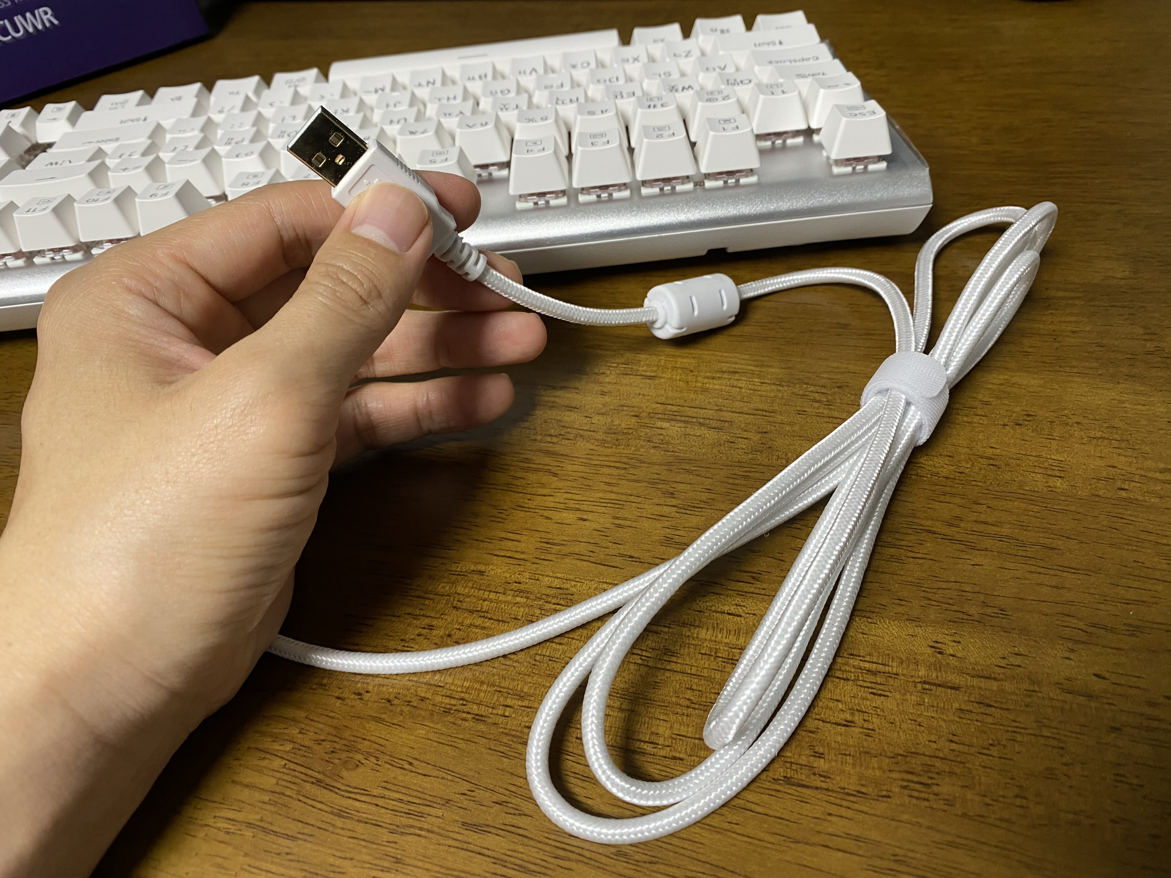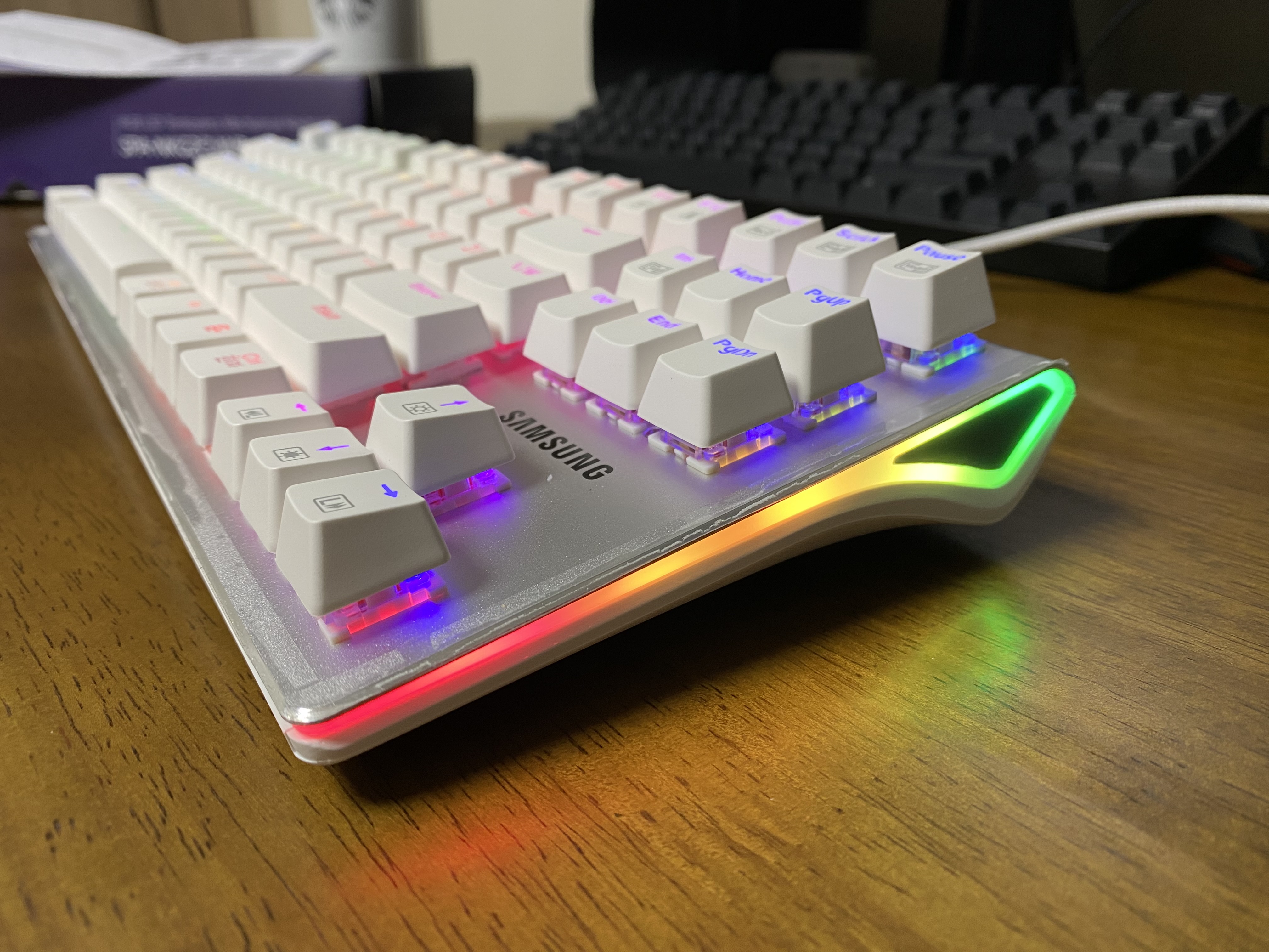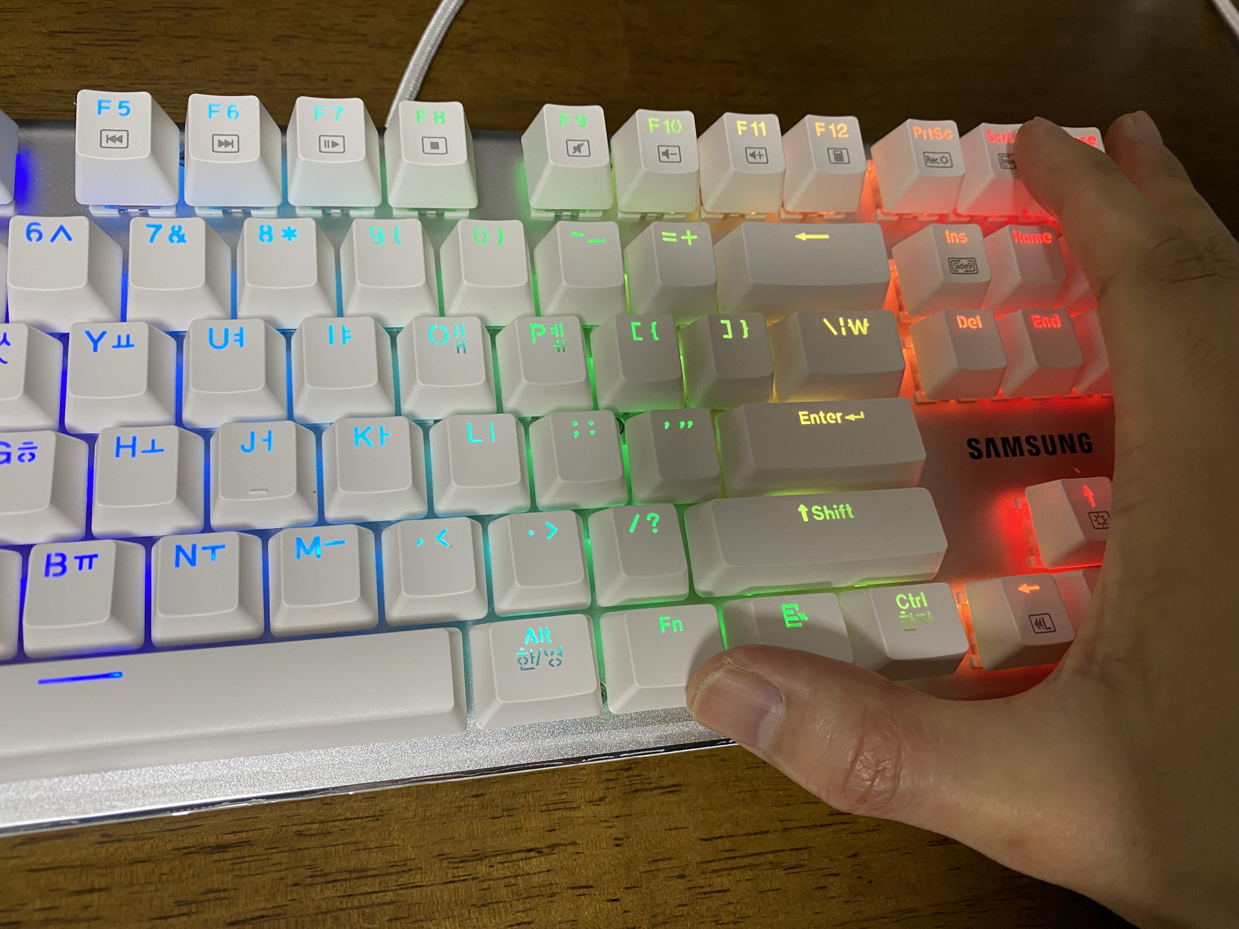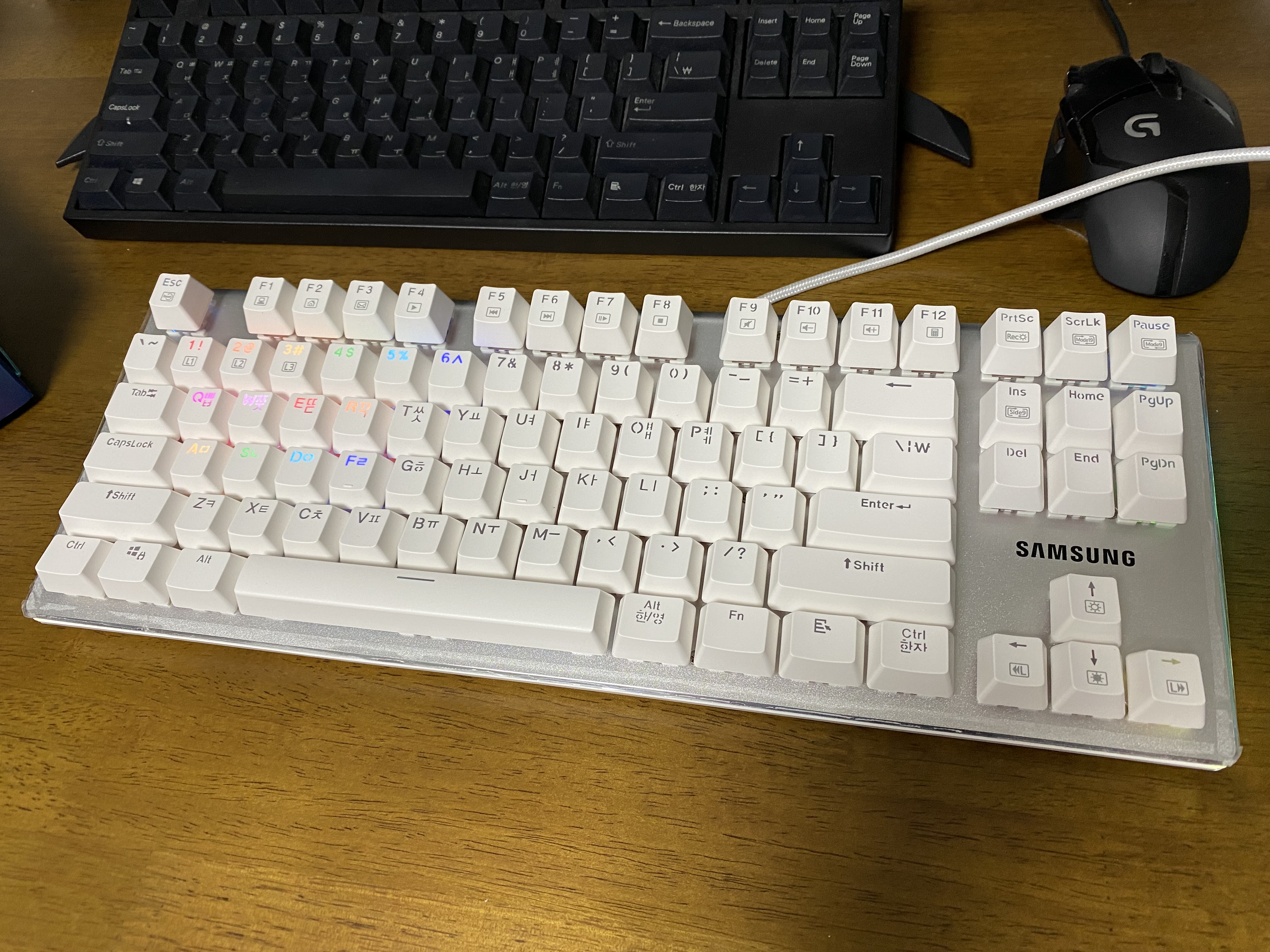 삼성전자 유선 기계식키보드 SPA-NKG2CUWR에 전원을 연결한 모습입니다. LED가 정말 화려하네요.