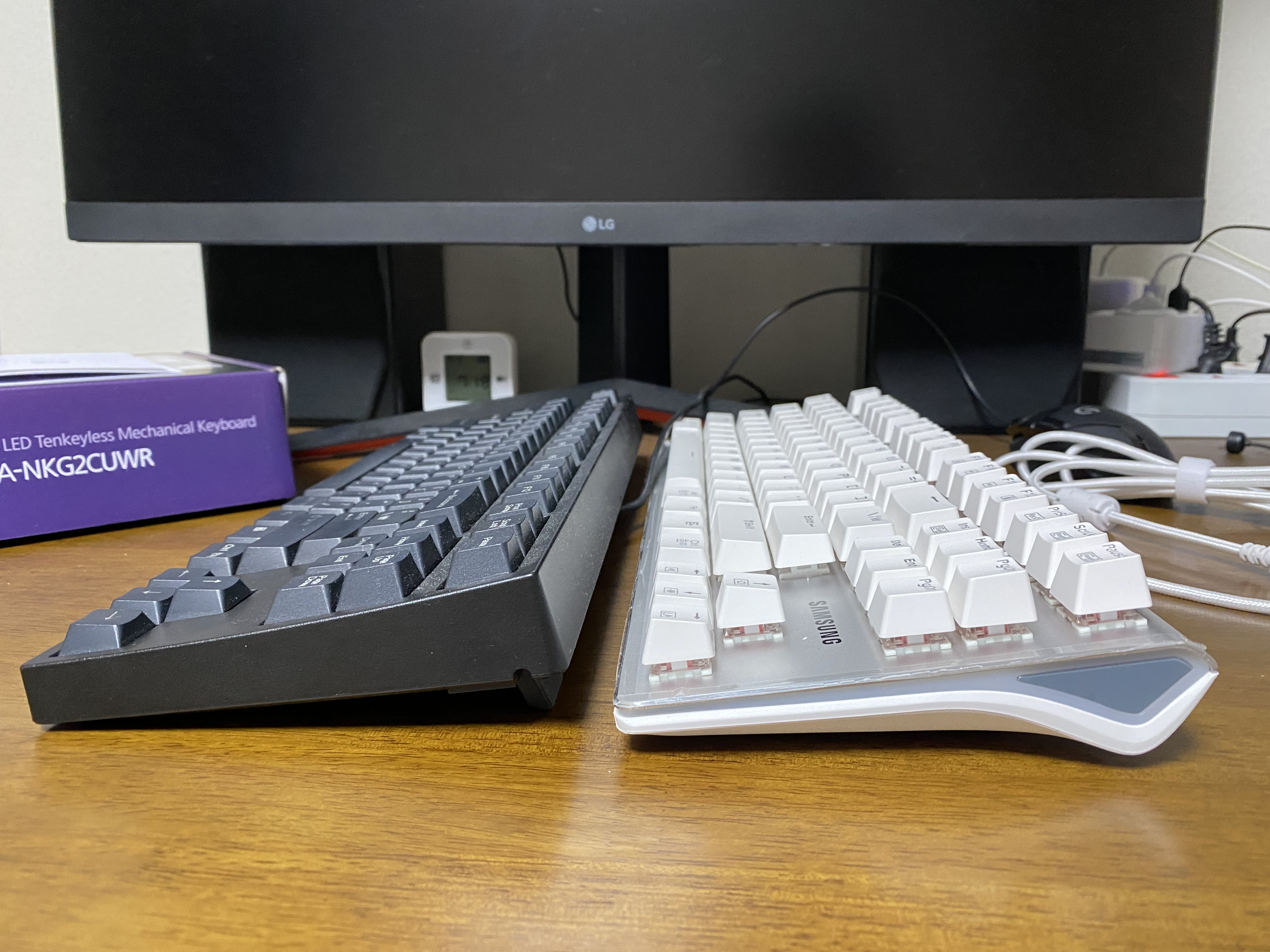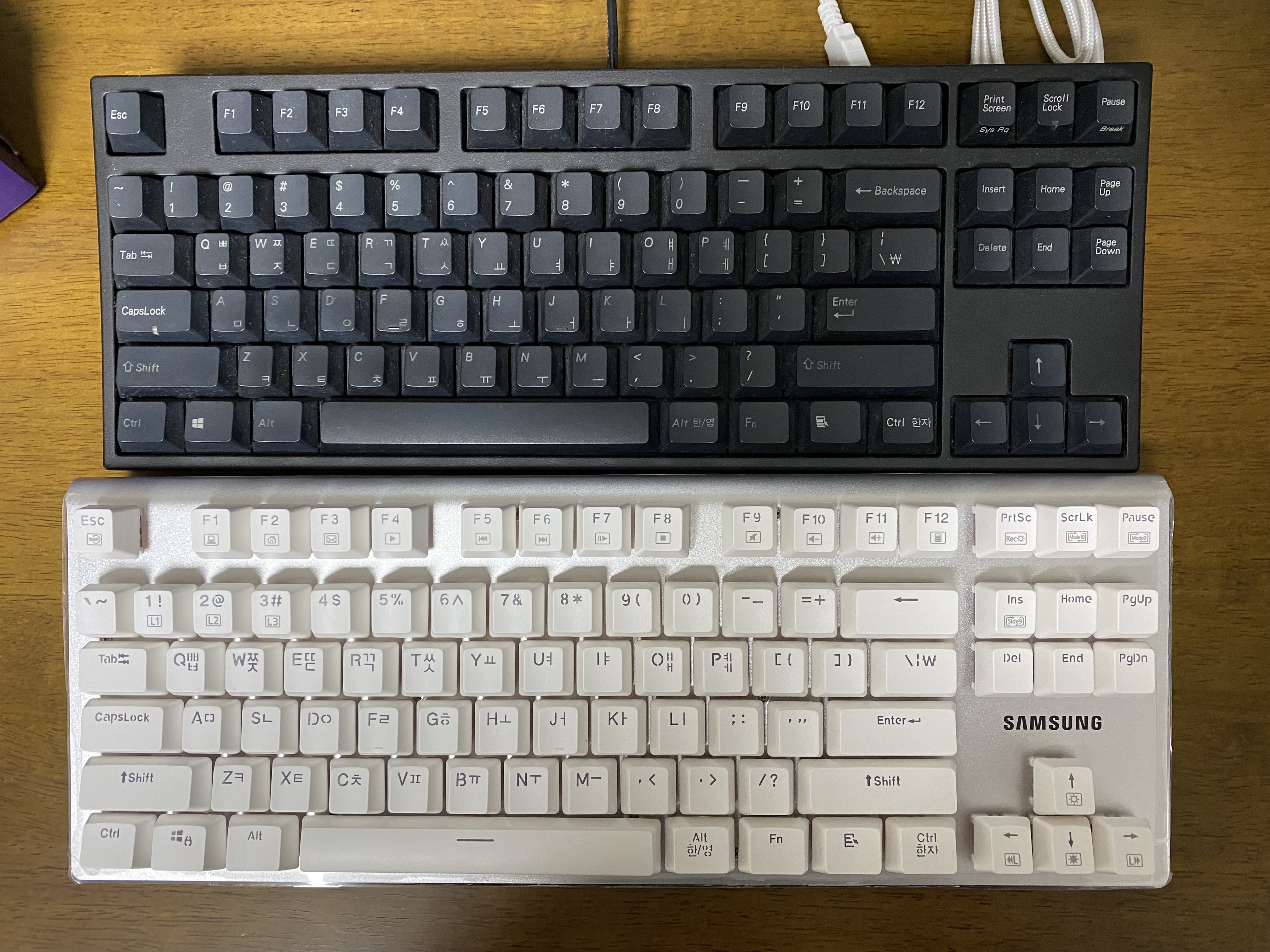 제 메인 컴퓨터에 쓰고 있는 레오폴드 750R과 삼성 기계식 키보드 비교 컷입니다. 삼성 키보드가 조금 더 크네요.