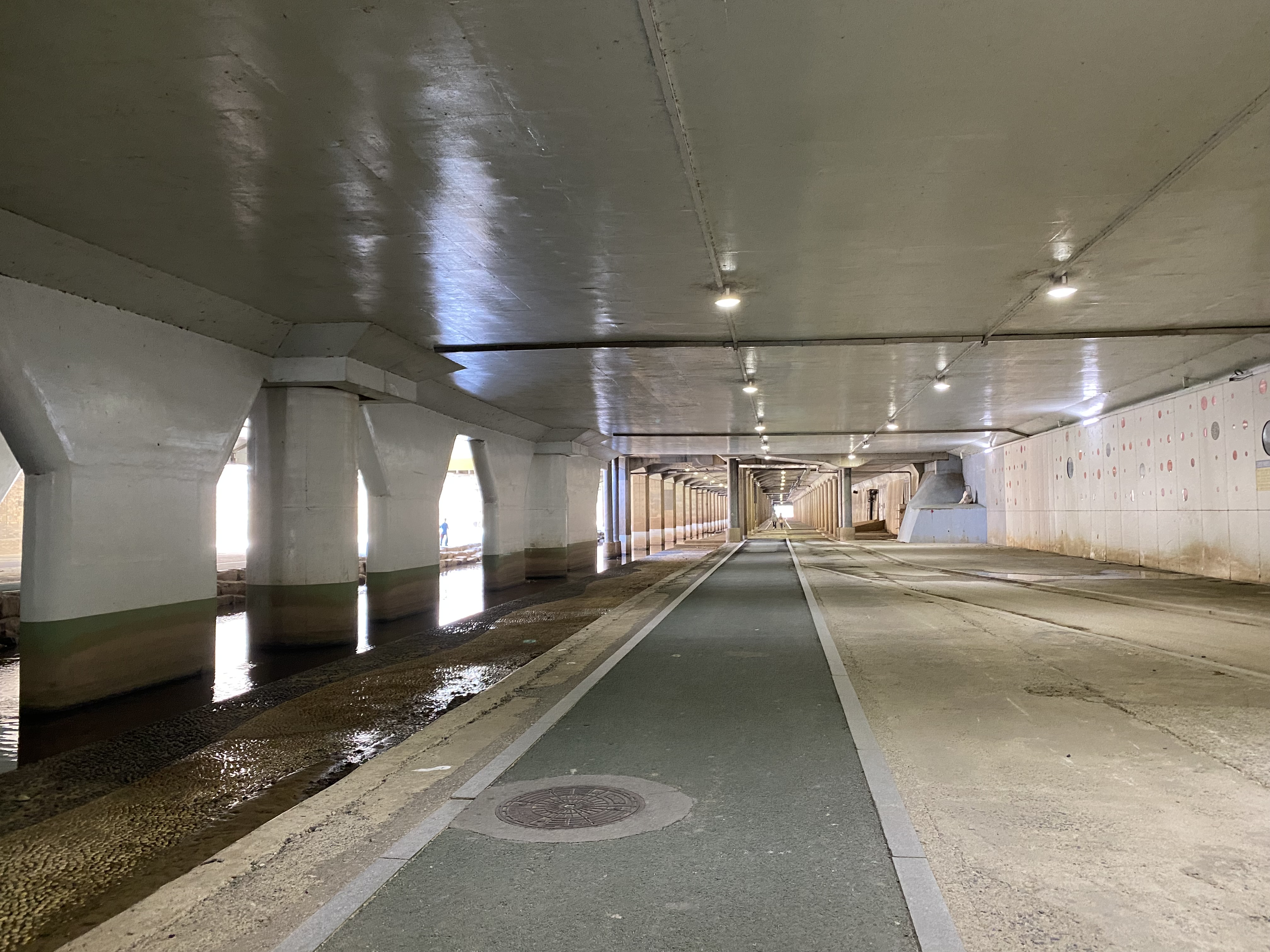 온천천을 걸으며 약간 별로였던 점은 바로 이 지하터널 구간입니다. 기분 좋게 걸으러 왔는데 이런 지하도로에 들어서면 뭔가 좀 답답함이 느껴지네요. 물이 더러운 곳에서는 악취도 조금 나고. 아무튼 좀 별로였습니다. 여기 말고 더 넓은 지하도로에서는 공사 차량도 다녀서 매연을 마시며 걸어야 했습니다.