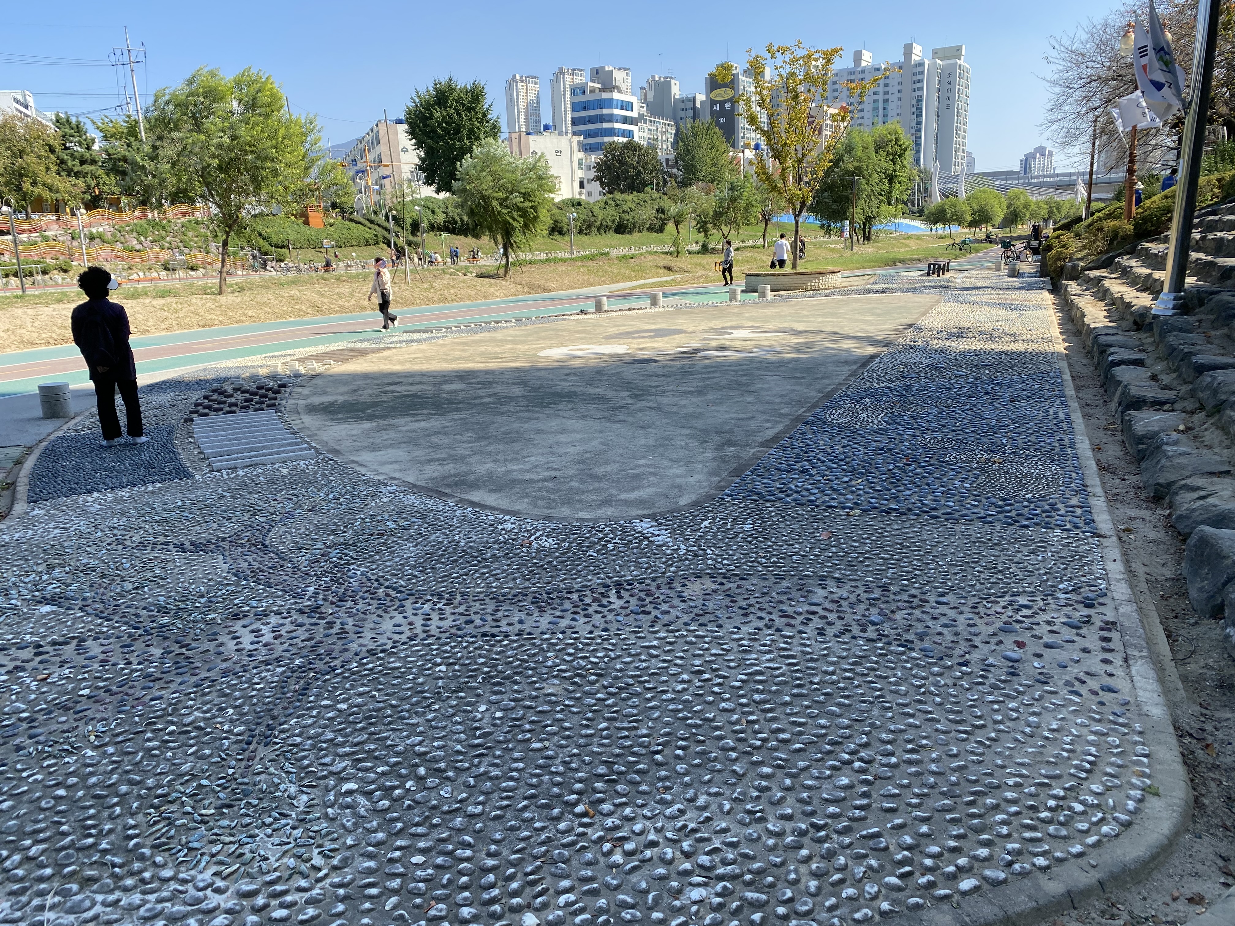 자전거 보행자 겸용도로도 있습니다. 제가 잠시 본 바로는 이런 표지판에 영향을 받지 않고 자전거는 지나갔으며 다행히도 크게 빨리 달리는 자전거는 보이지 않았습니다. 이런 사람들이 많이 이용하는 곳에서는 자전거로 속도를 뽑는 건 아니라고 생각합니다. 진짜진짜 위험하니까요.