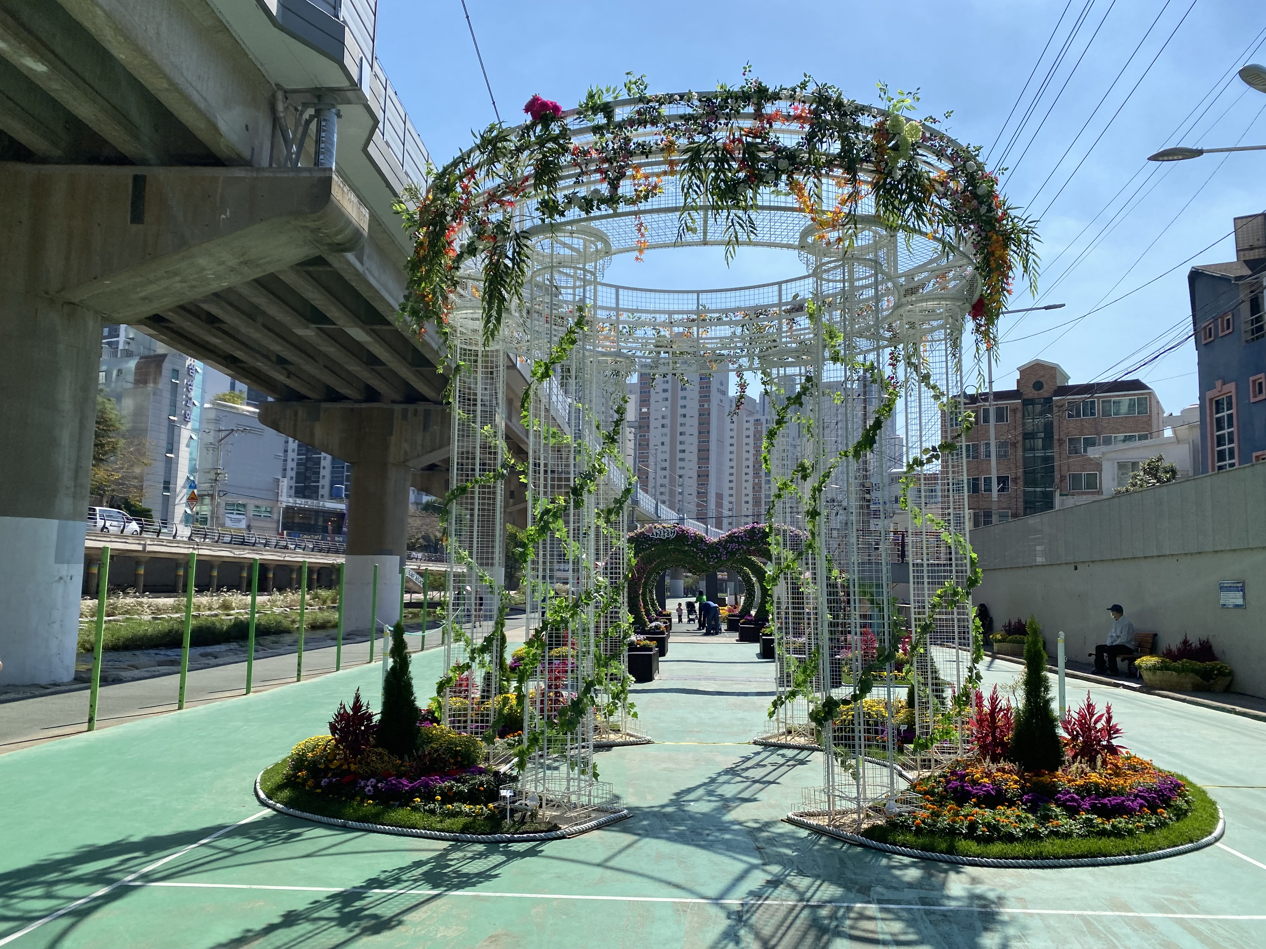 인라인스케이트장, 농구코트를 잠시 빌려 꽃정원을 만든 거군요.